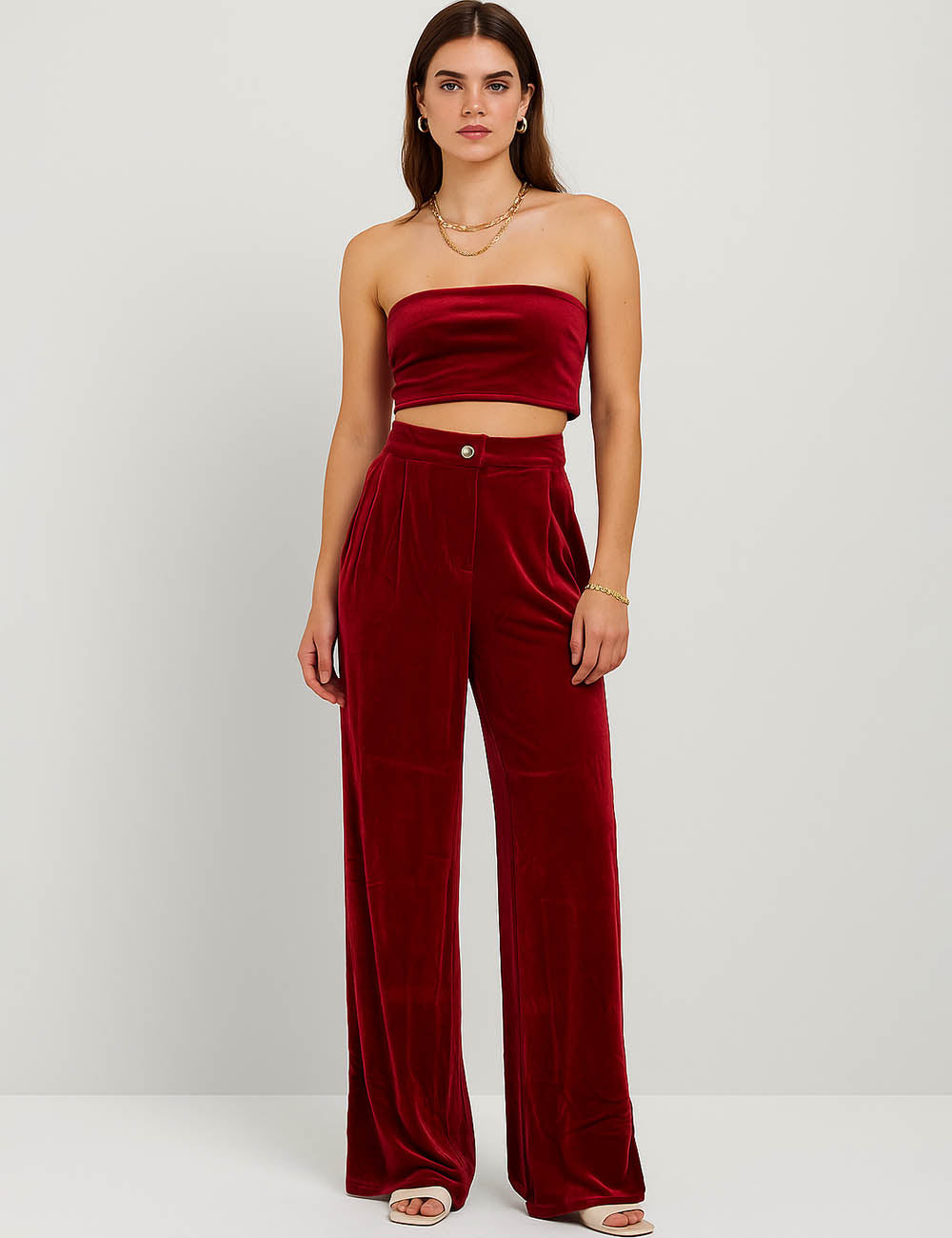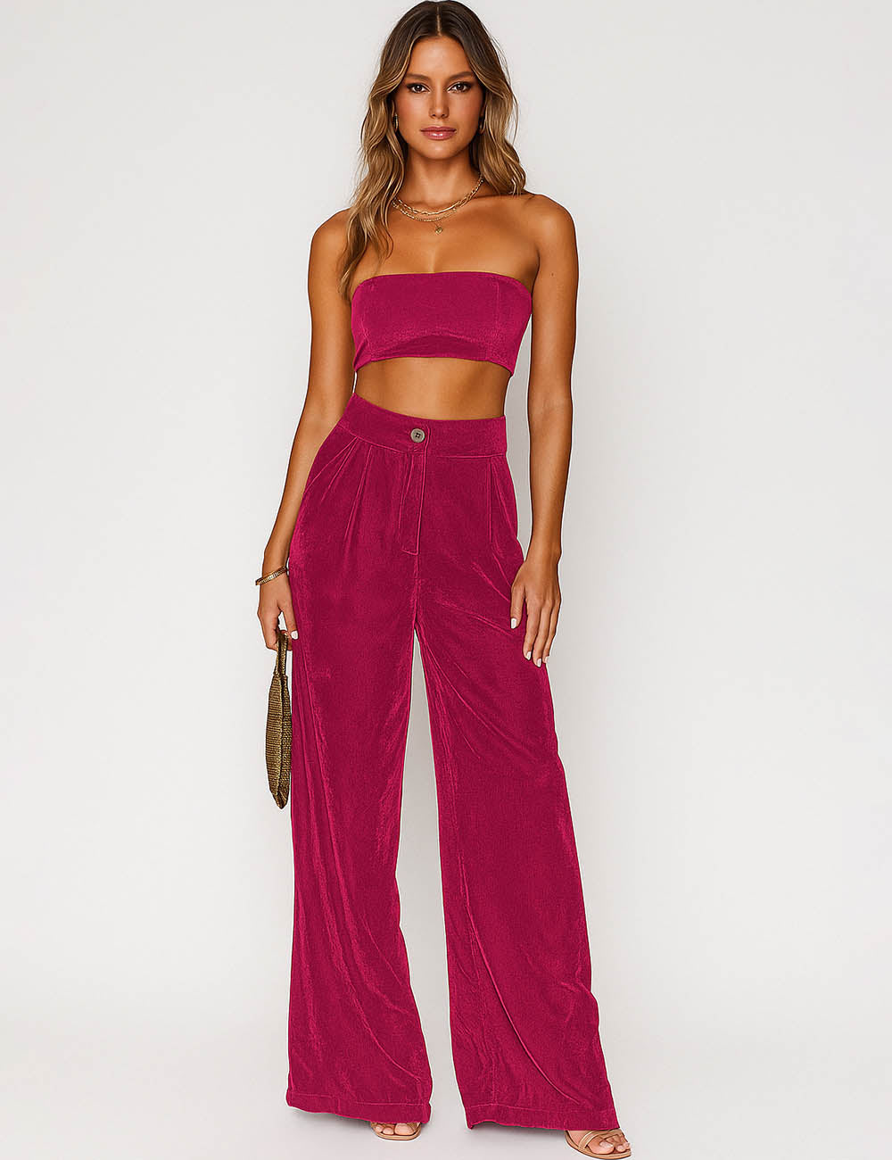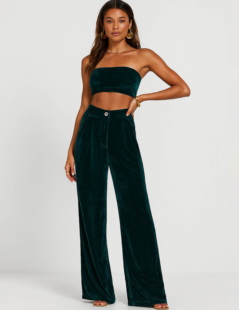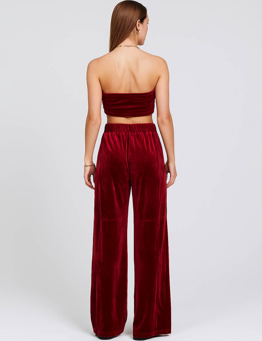 Ladies Glossy Velvet Zip Fly Pocket Wide Leg Pants