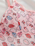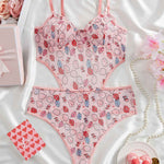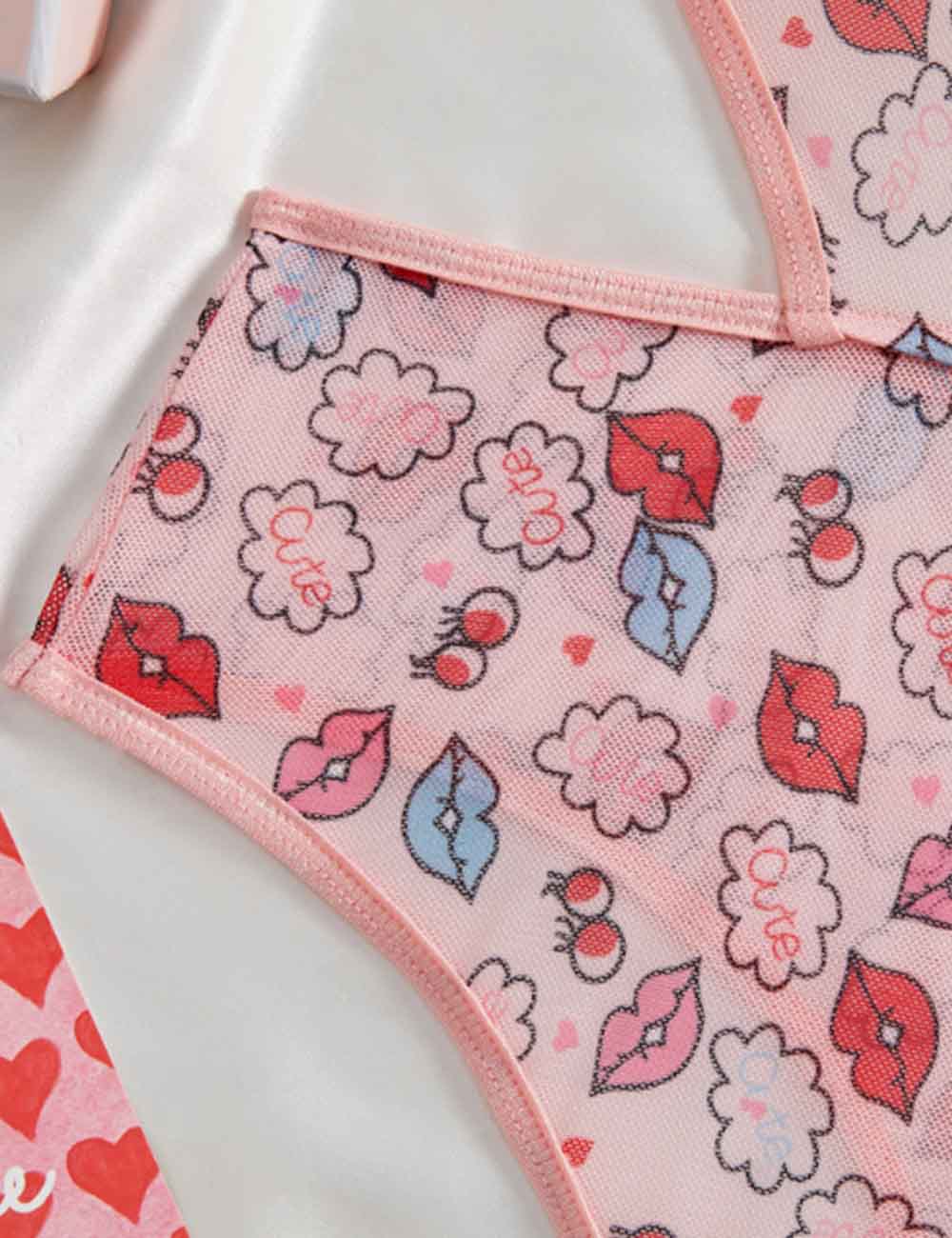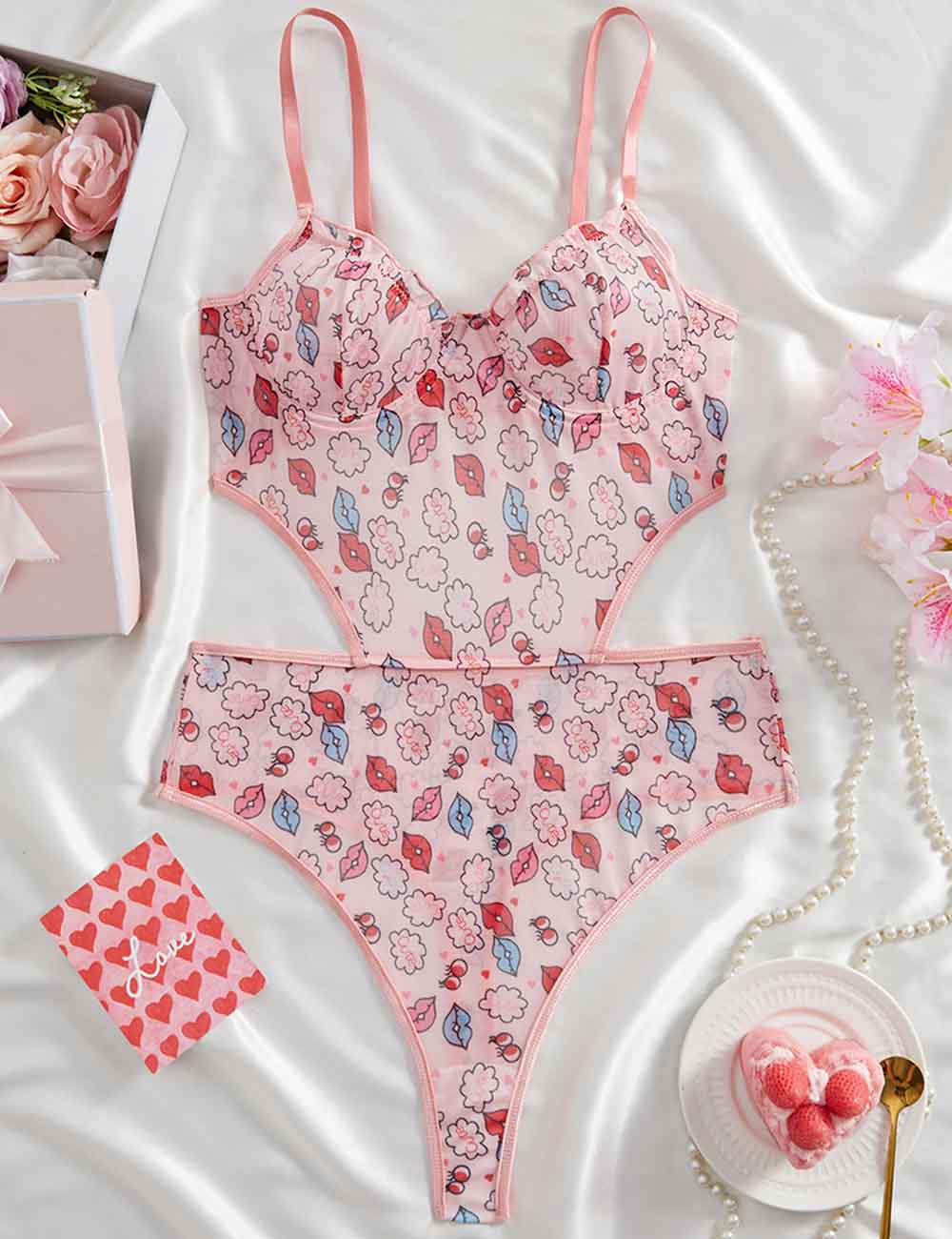 Ladies Cute Lip Print See Sheer Cut-Out Lingerie Teddy