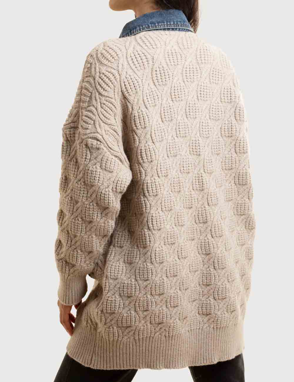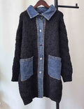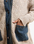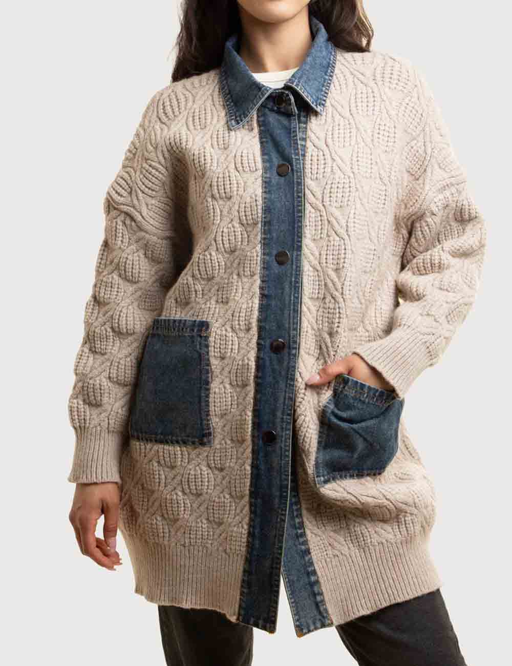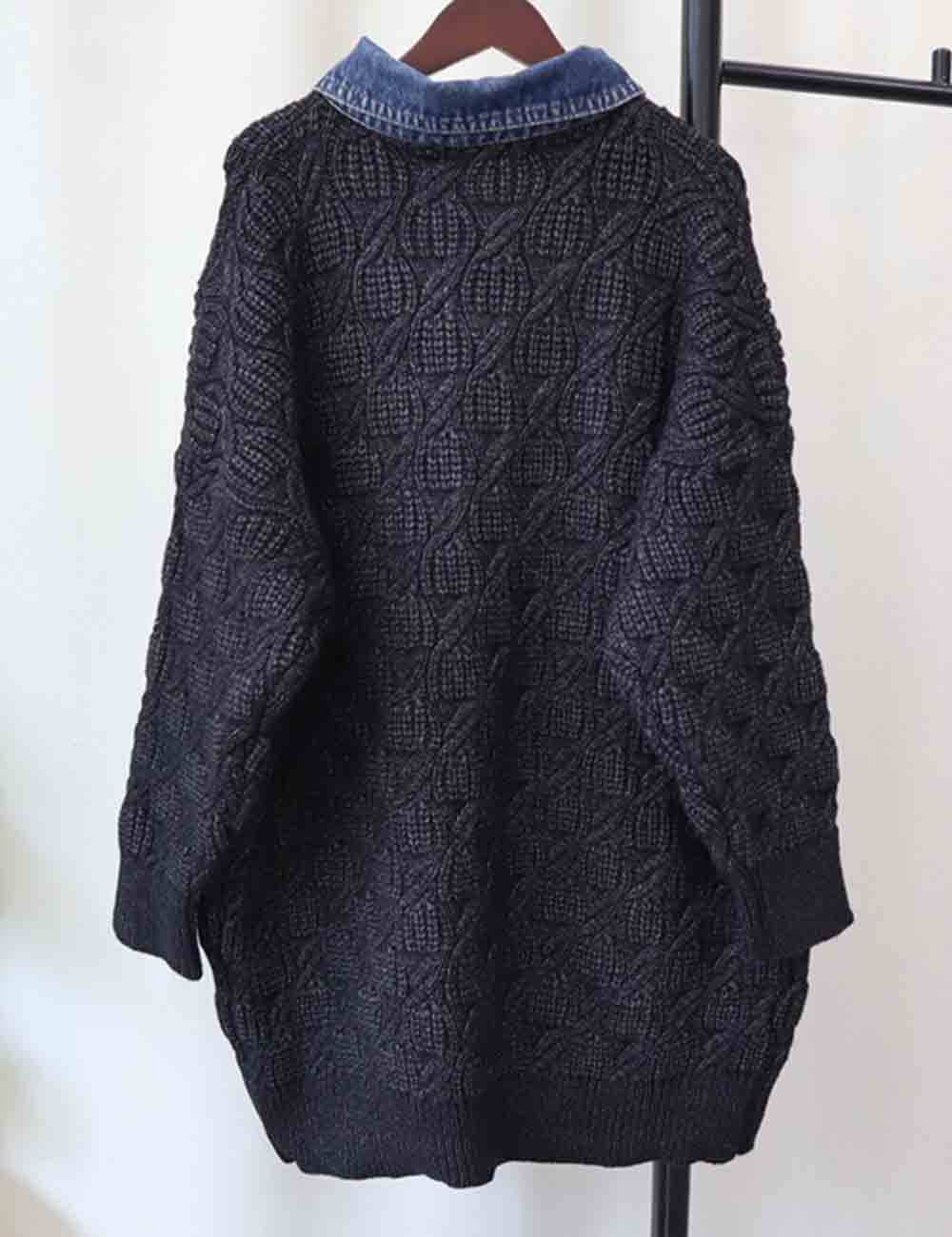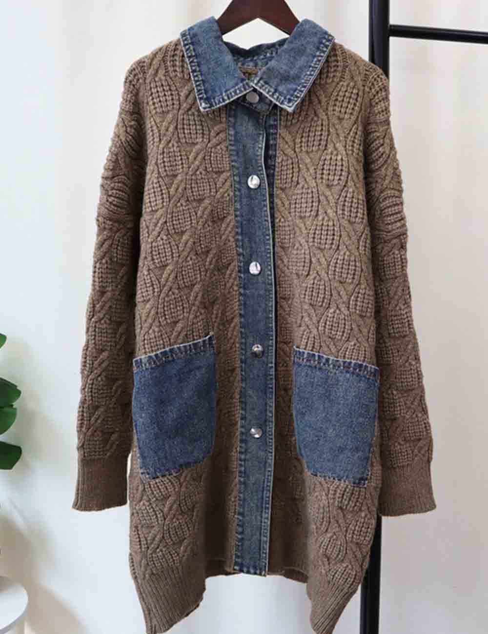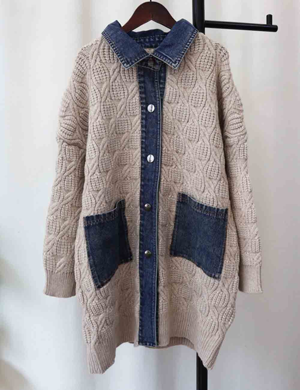 Ladies Denim Collar Button Closure Cable Sweater Jacket