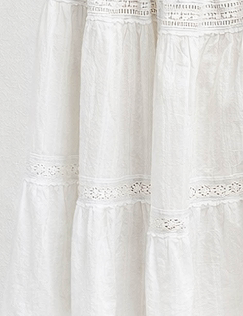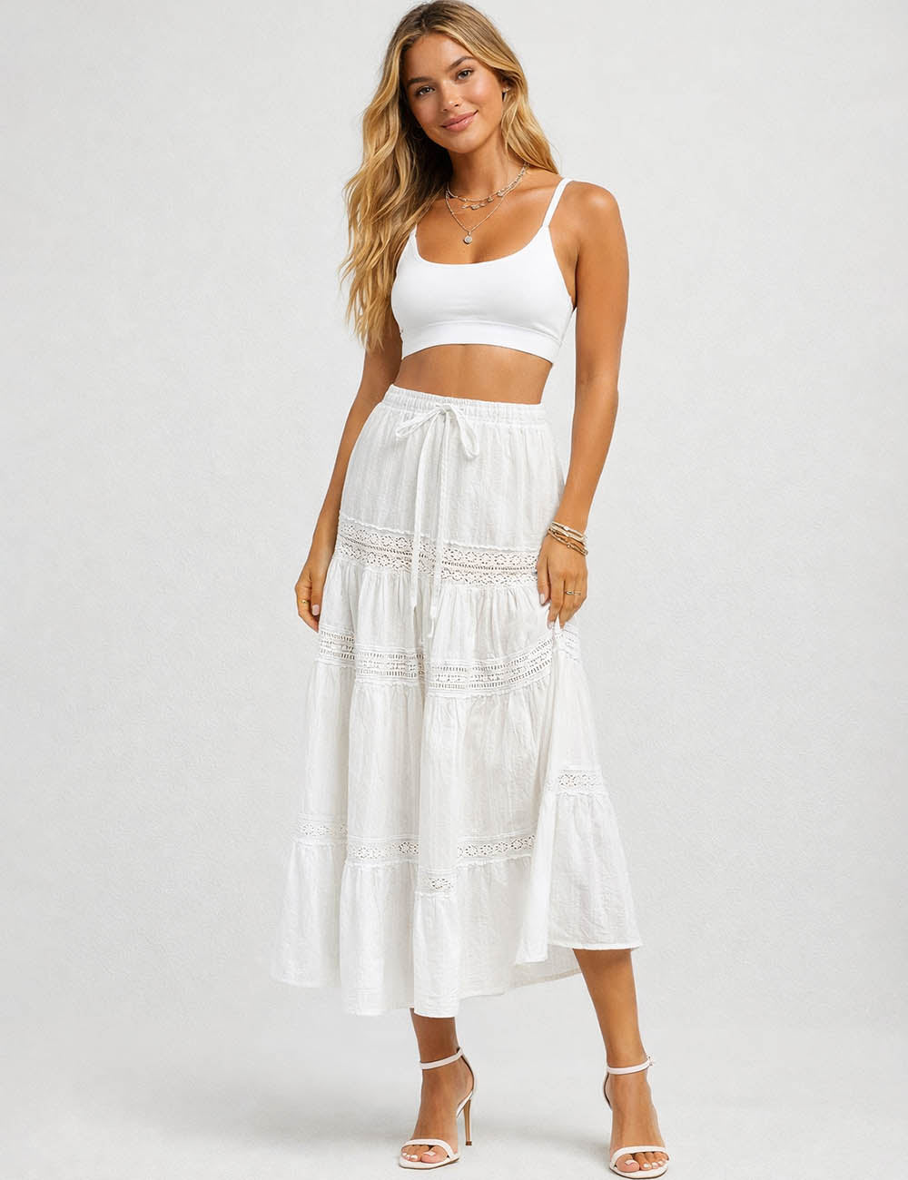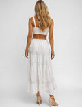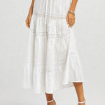 Ladies Elastic Waist Eyelet Lace Panel Tiered Maxi Skirt