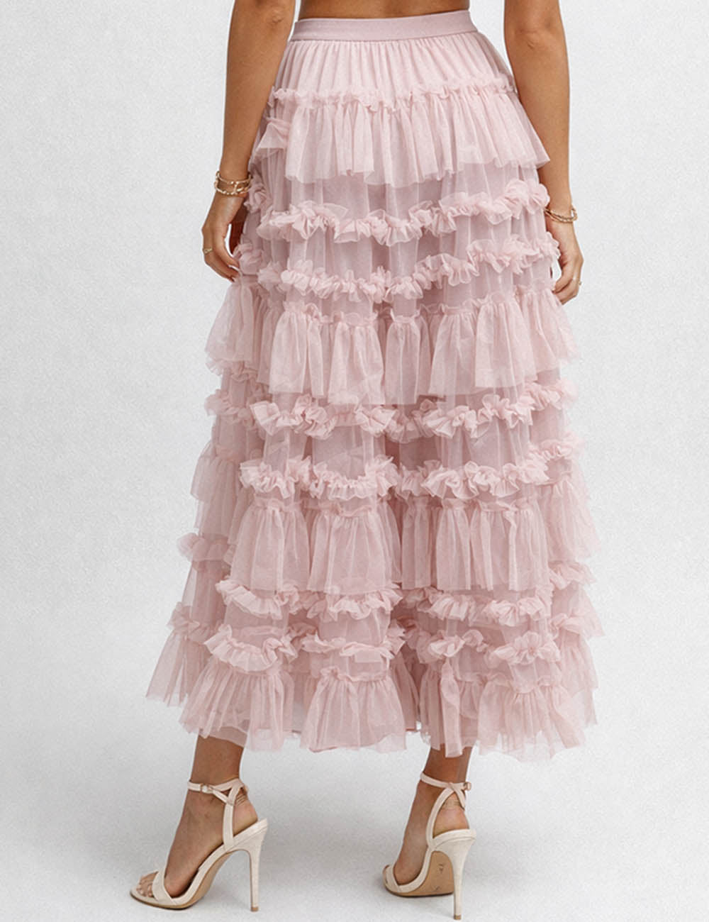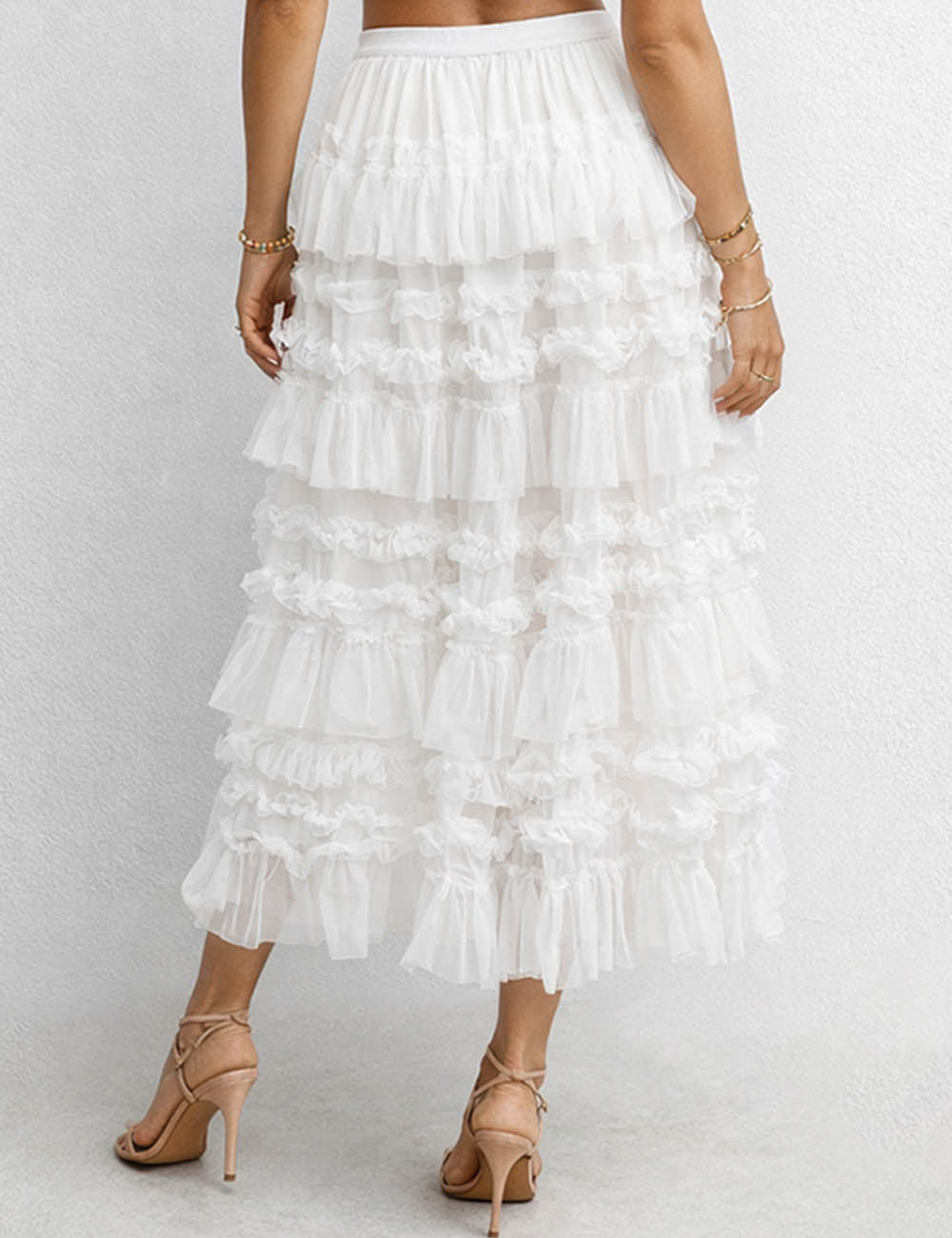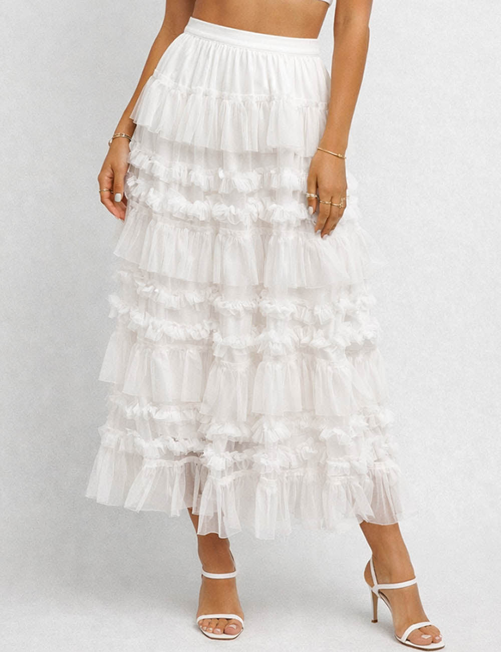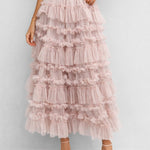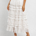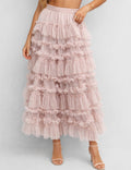 Ladies Elastic Waist Mesh Bead Tiered Ruffle Maxi Skirt