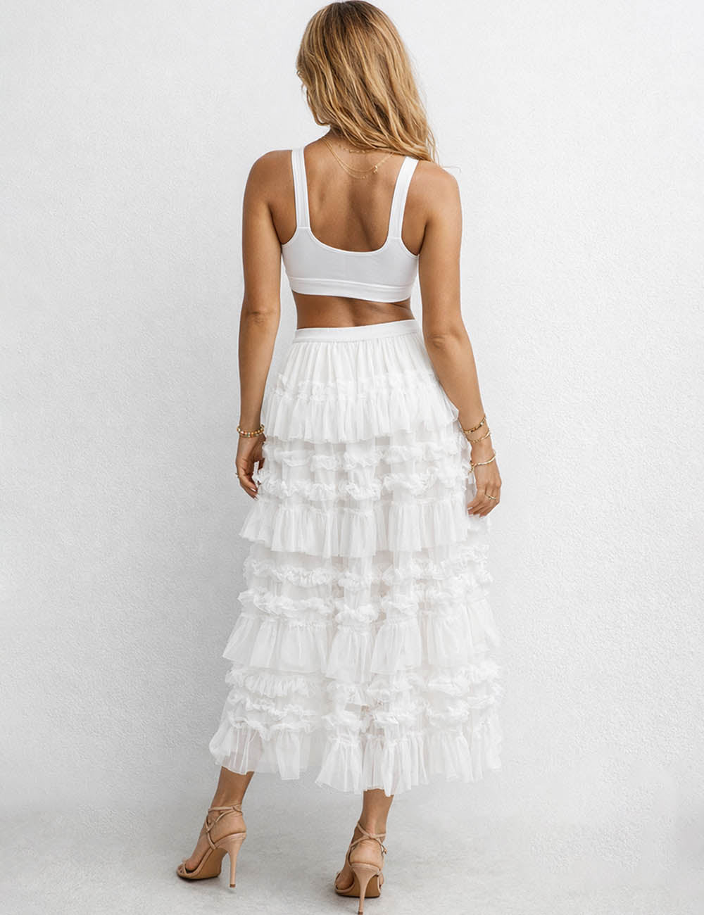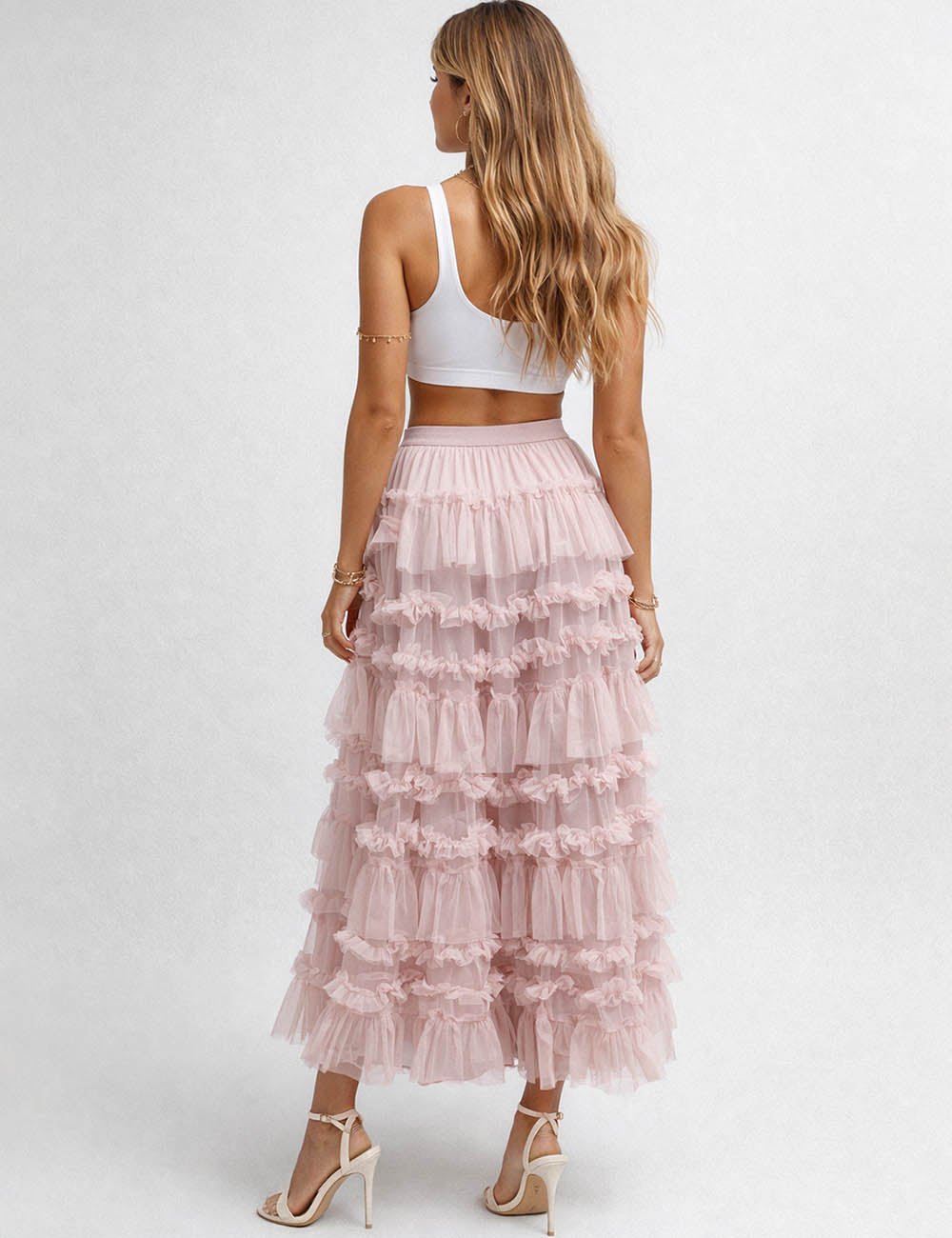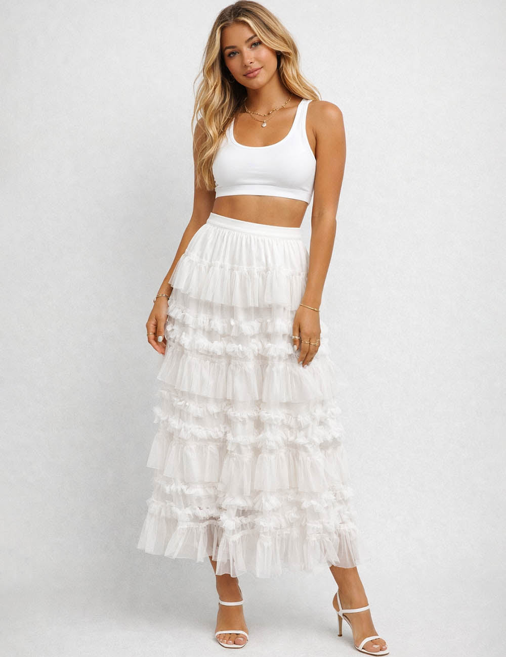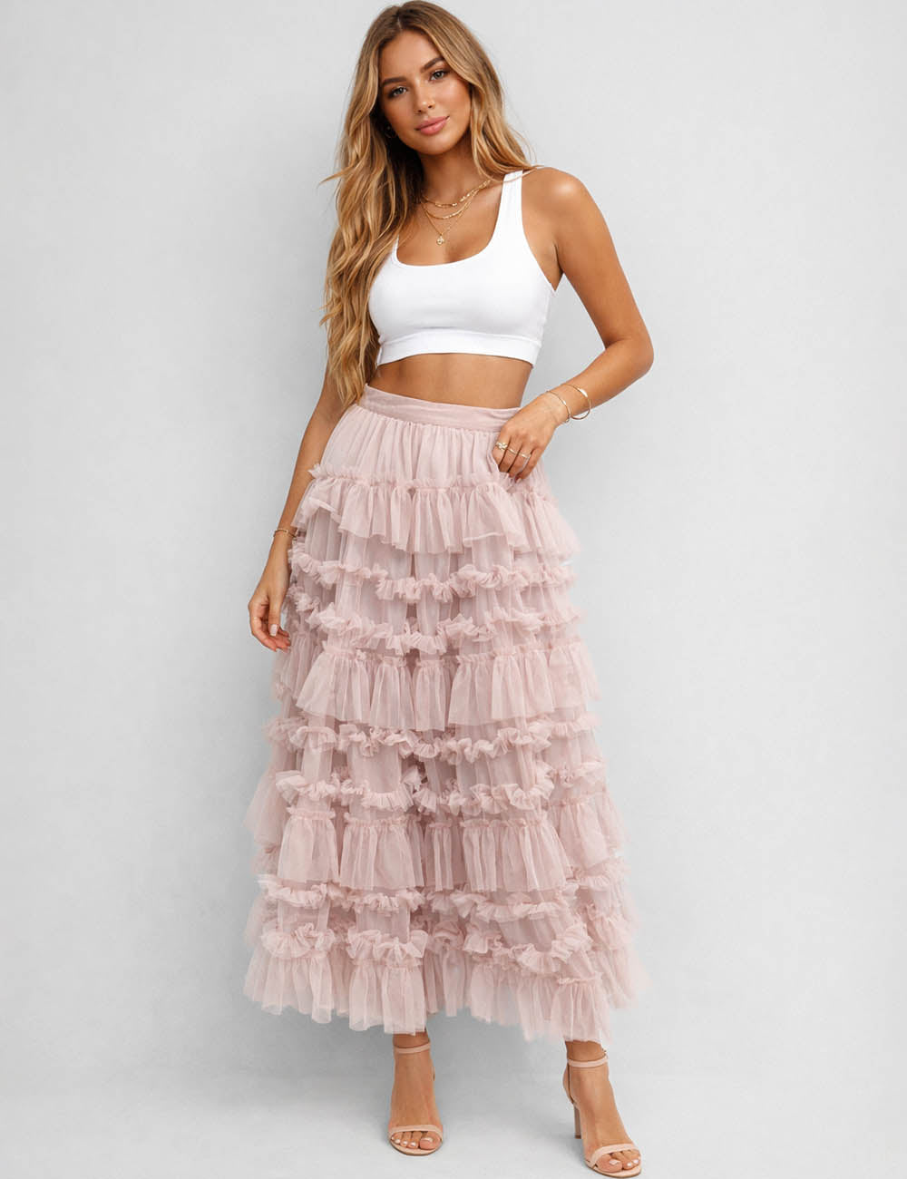 Ladies Elastic Waist Mesh Bead Tiered Ruffle Maxi Skirt