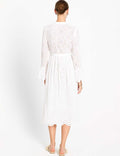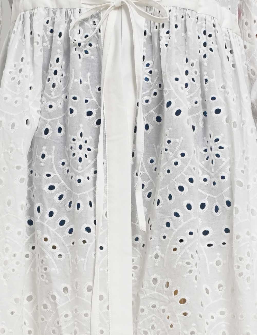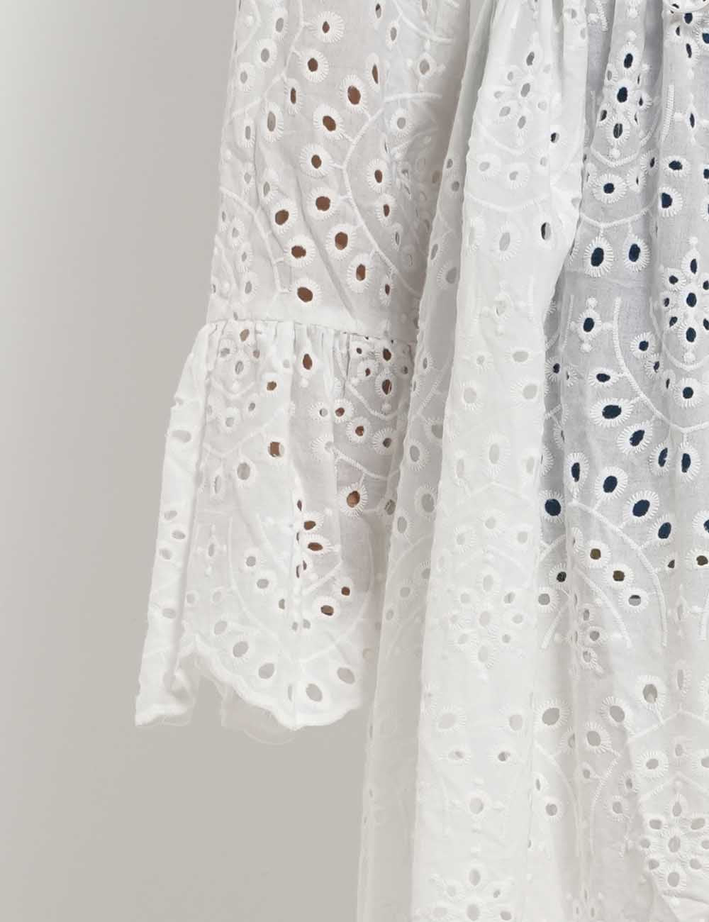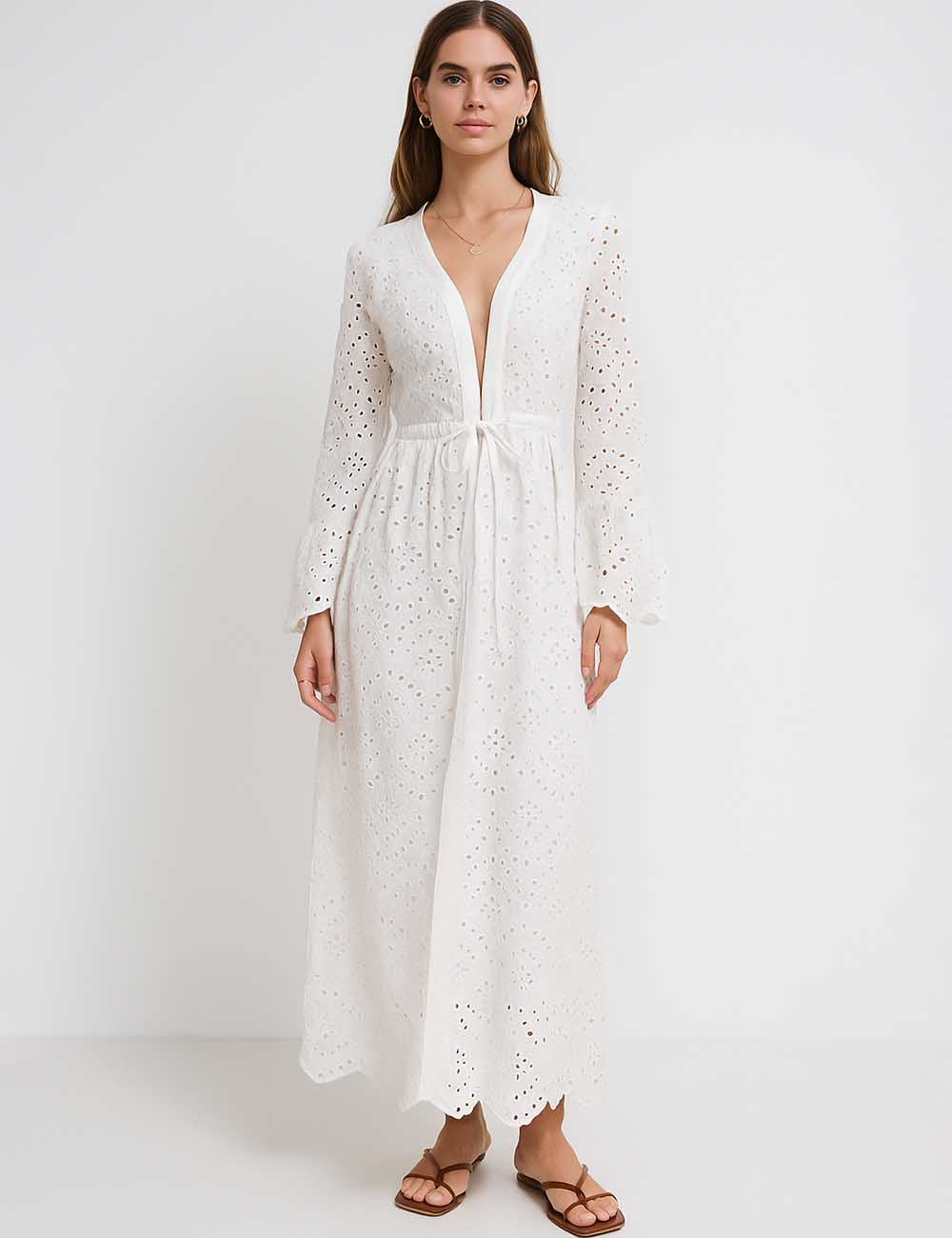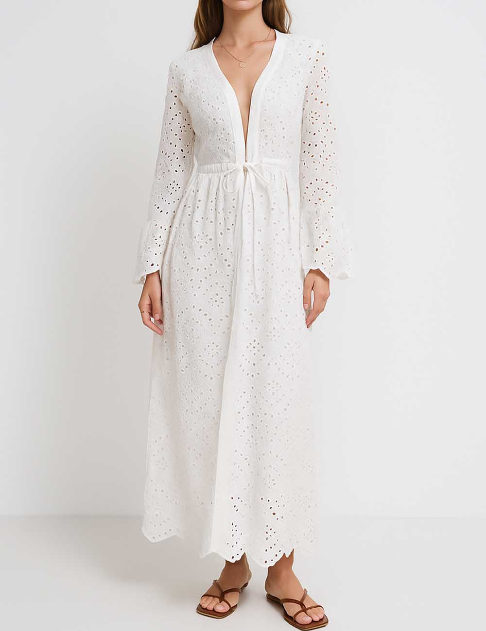 Ladies Embroidery Eyelet Tie Front Flared Sleeves Maxi Dress