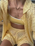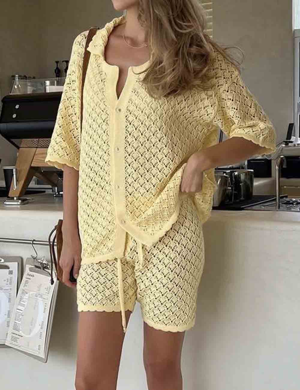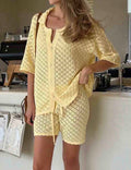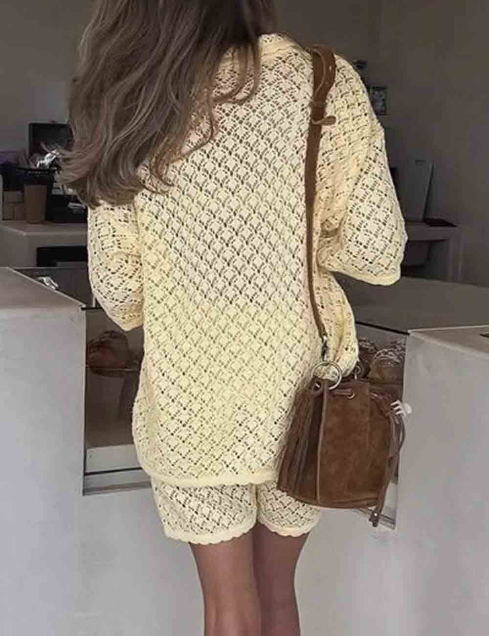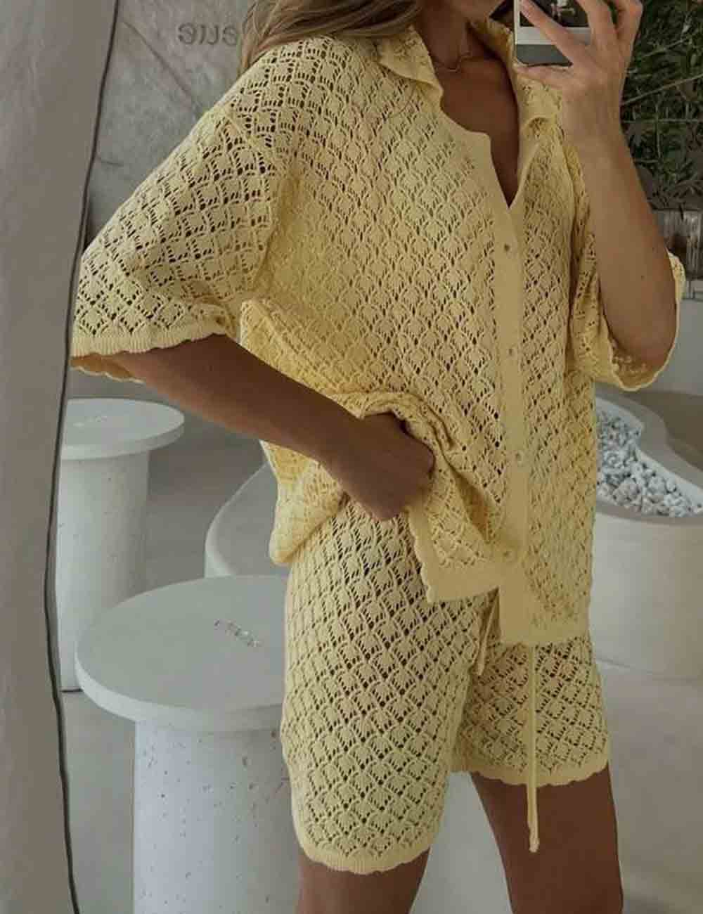 Ladies Eyelet Hollow Out Button Knit Top & Shorts 2PCS Set