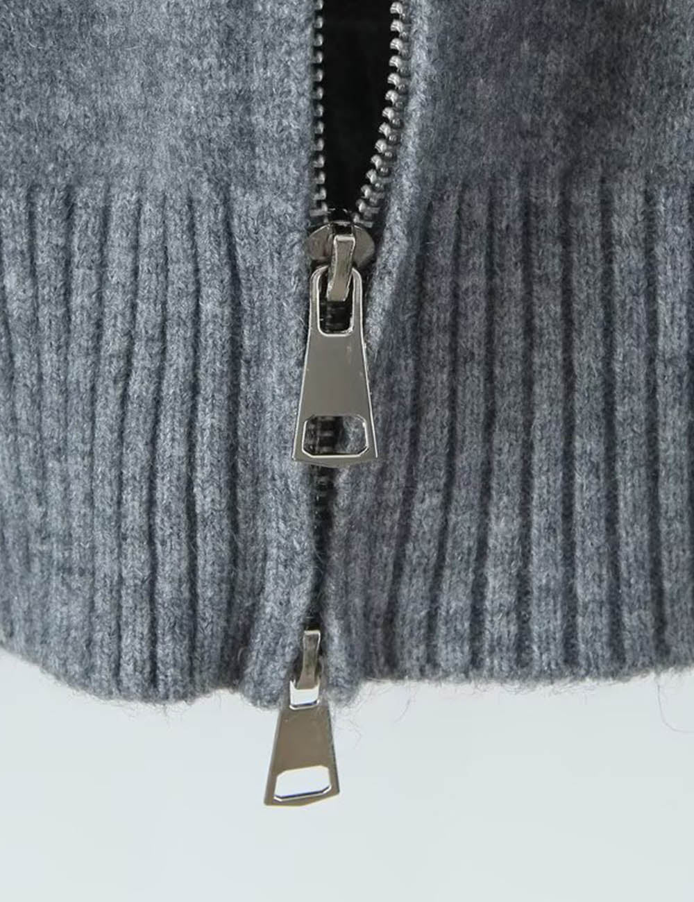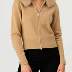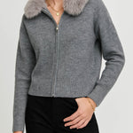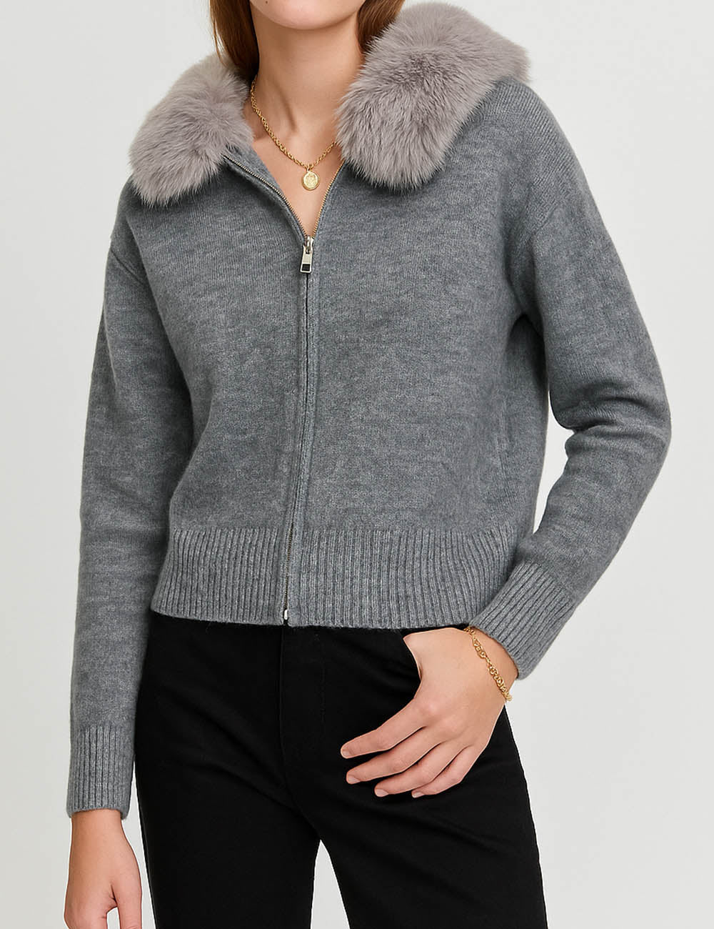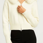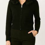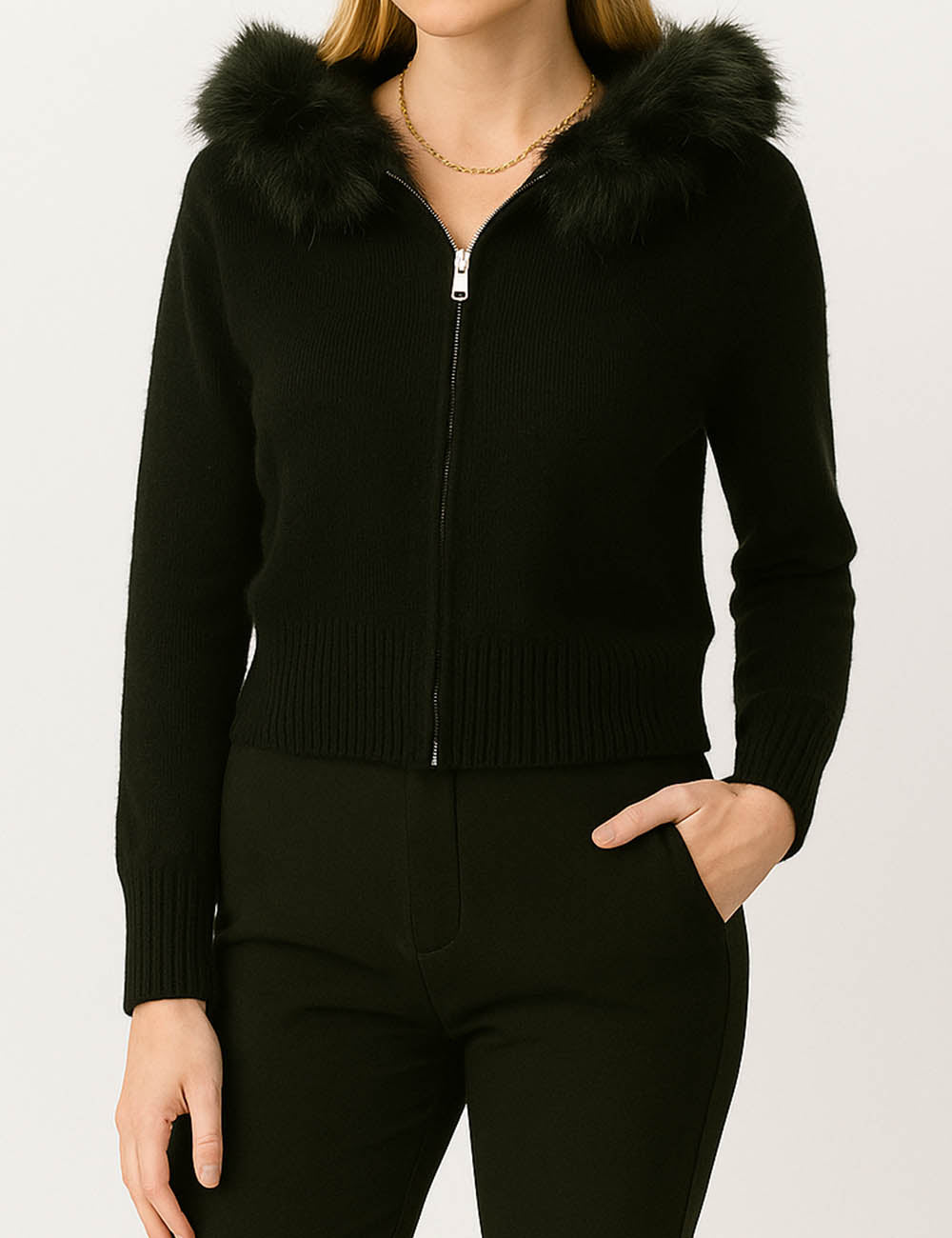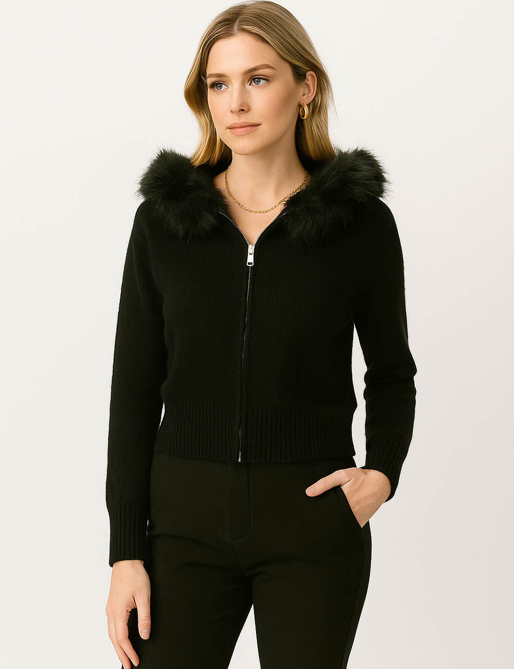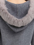 Ladies Hooded Faux Fur Trim Zip Up Knit Cardigan