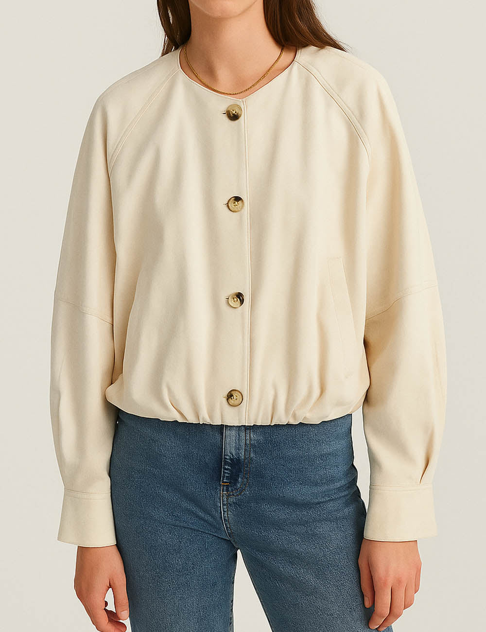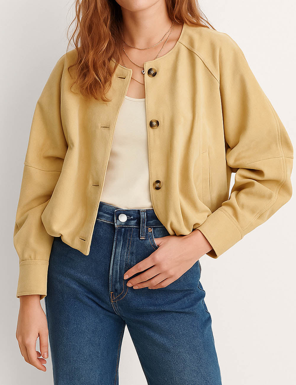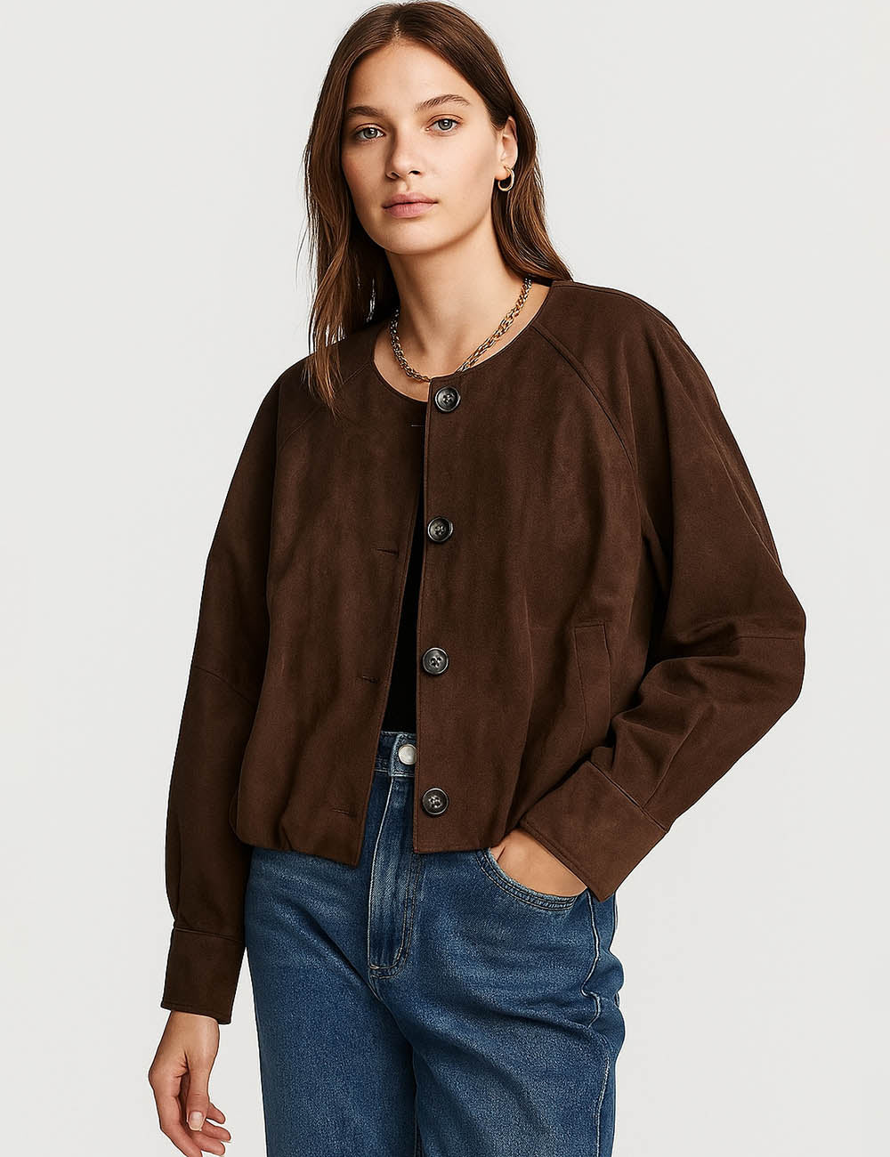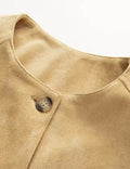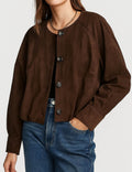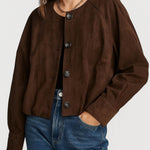 Ladies Faux Suede Button Front Round Neck Cropped Jacket