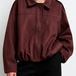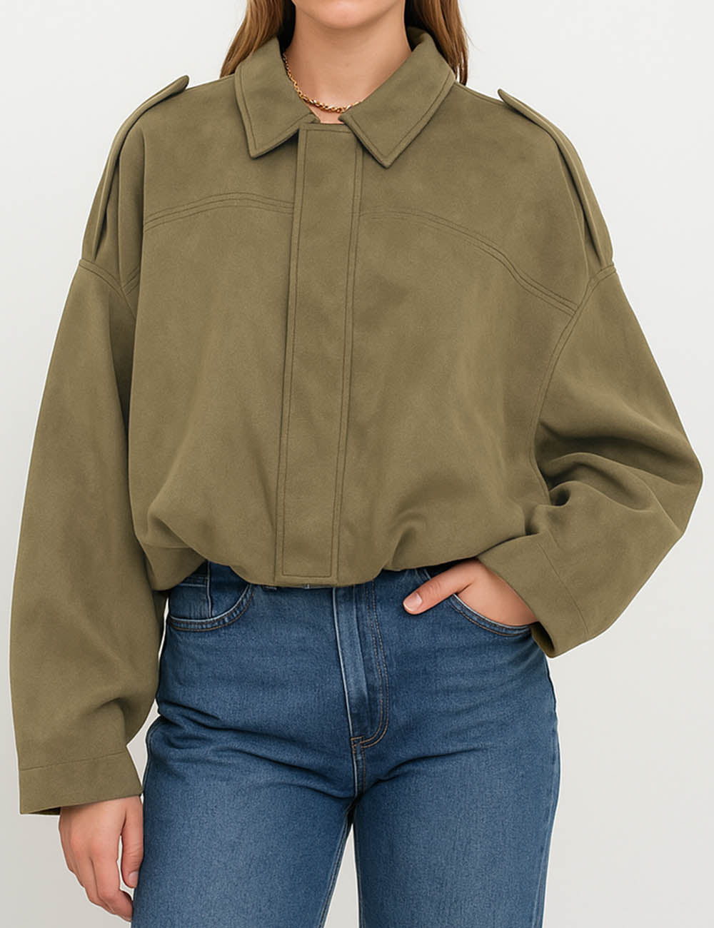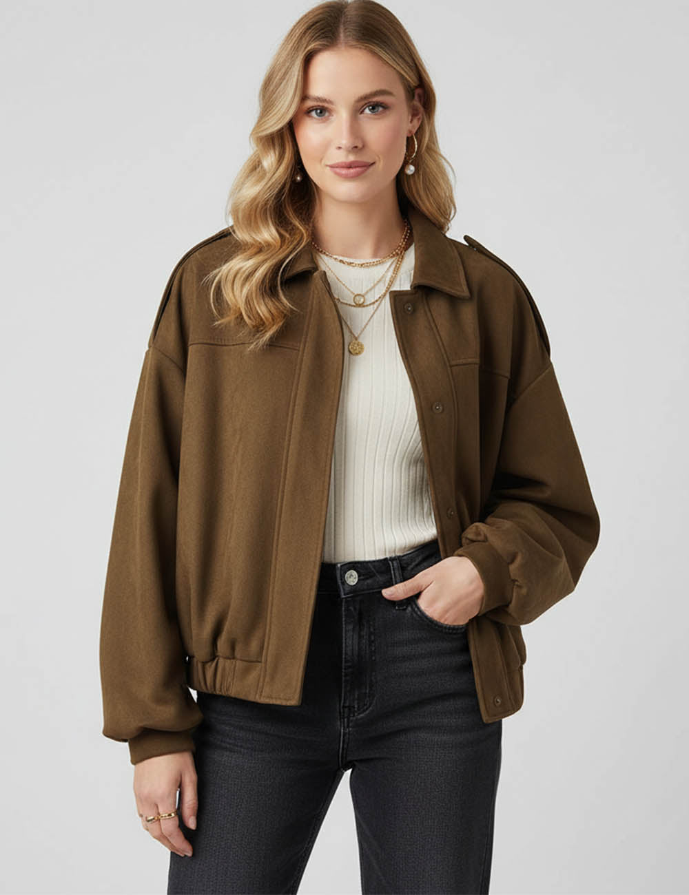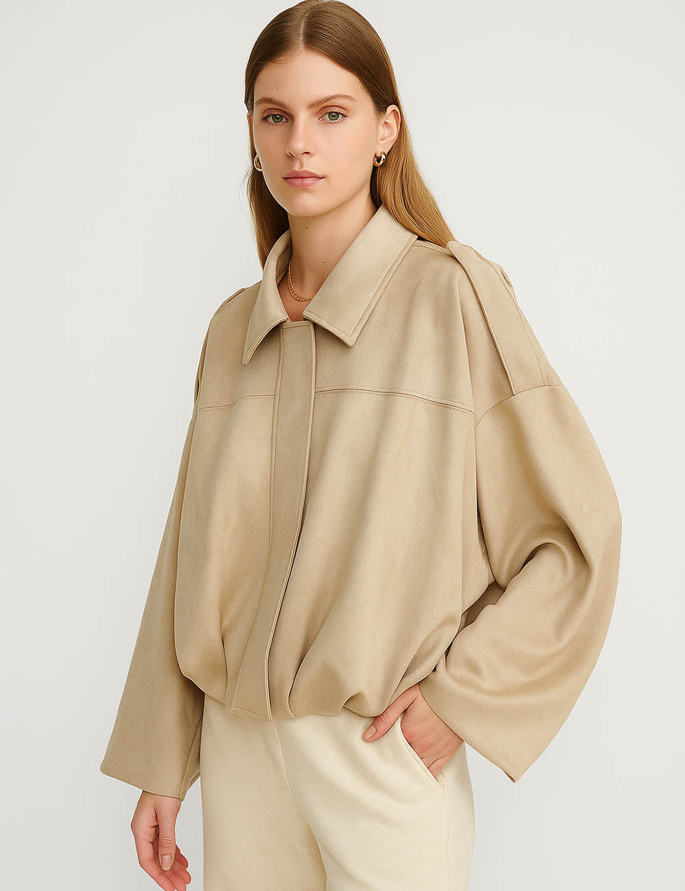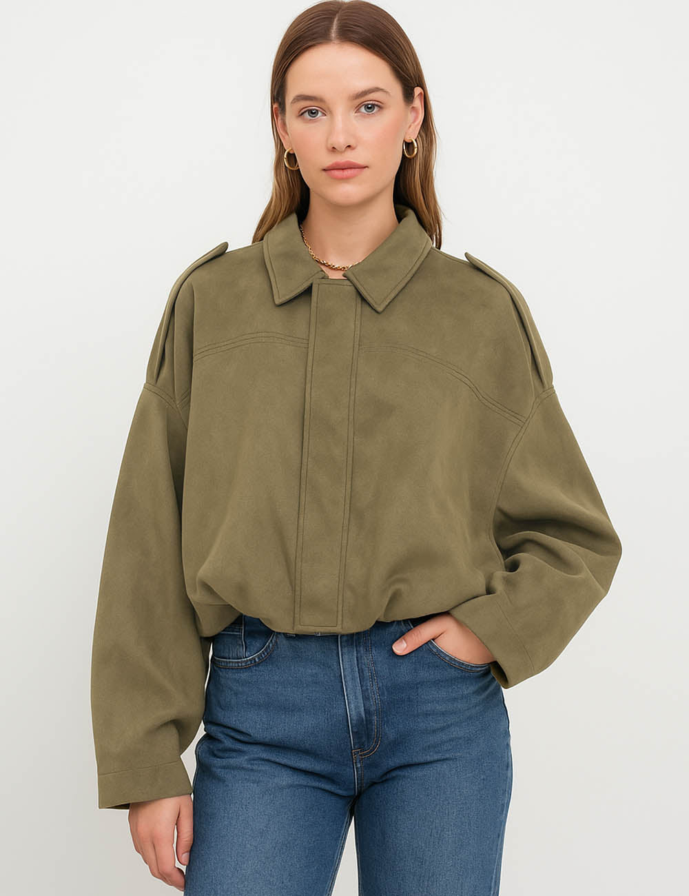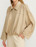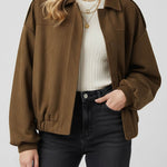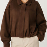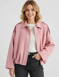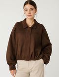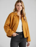 Ladies Faux Suede Shirt Collar Zip-Up Cropped Jacket