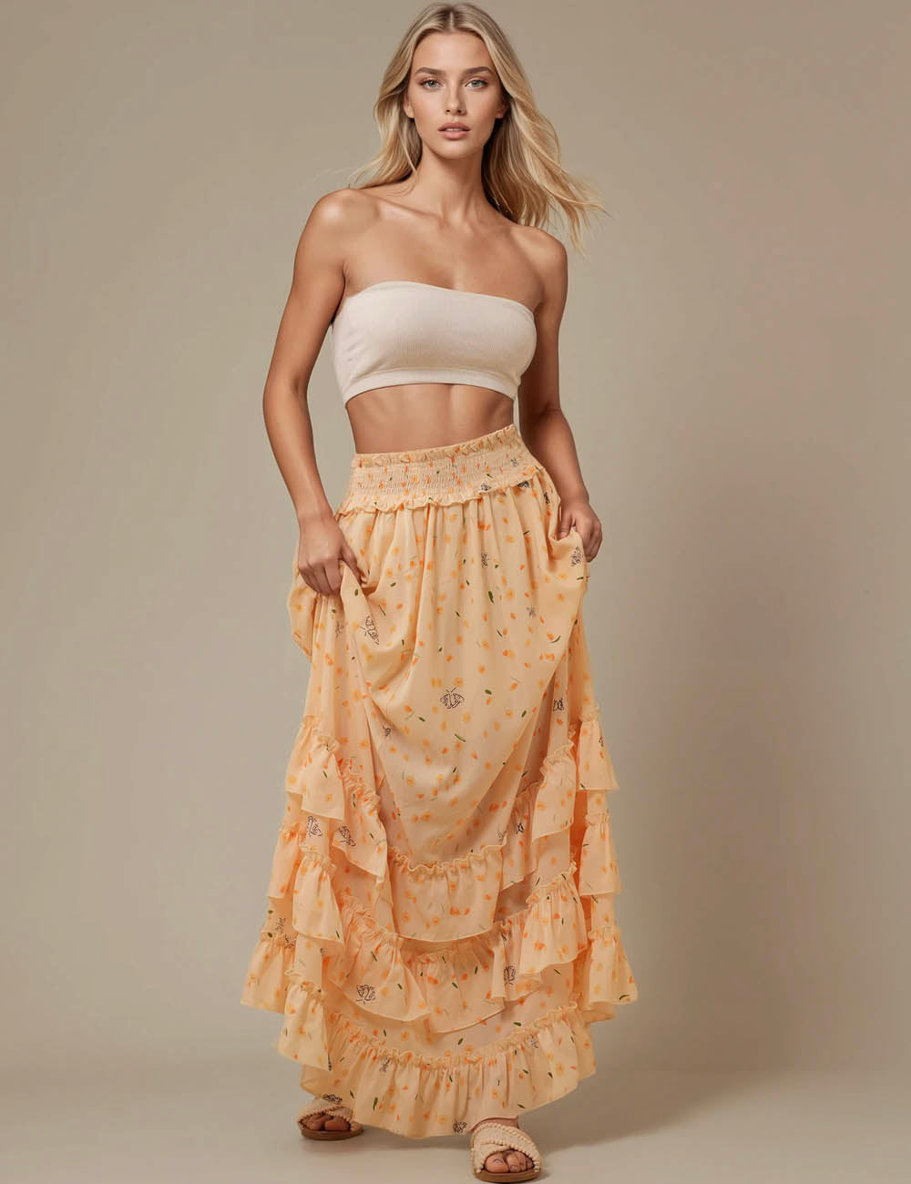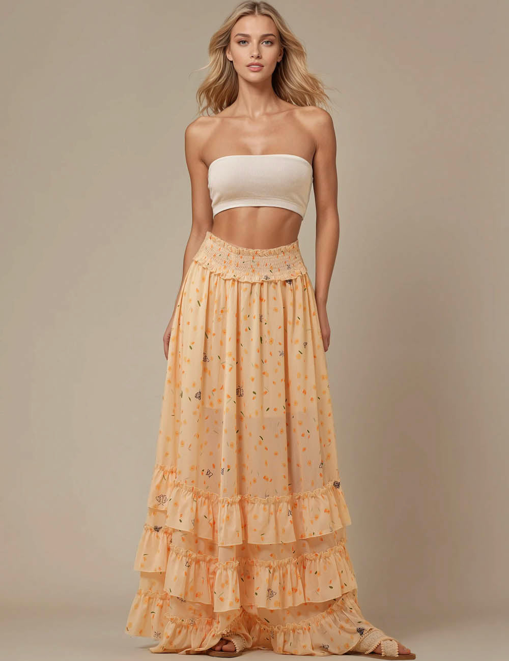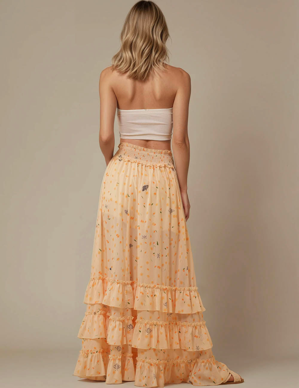 Ladies Floarl Chiffon Citrus Bloom Ruffle Maxi Skirt SKST5M5S