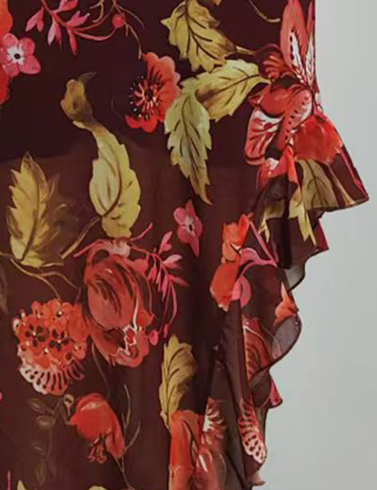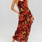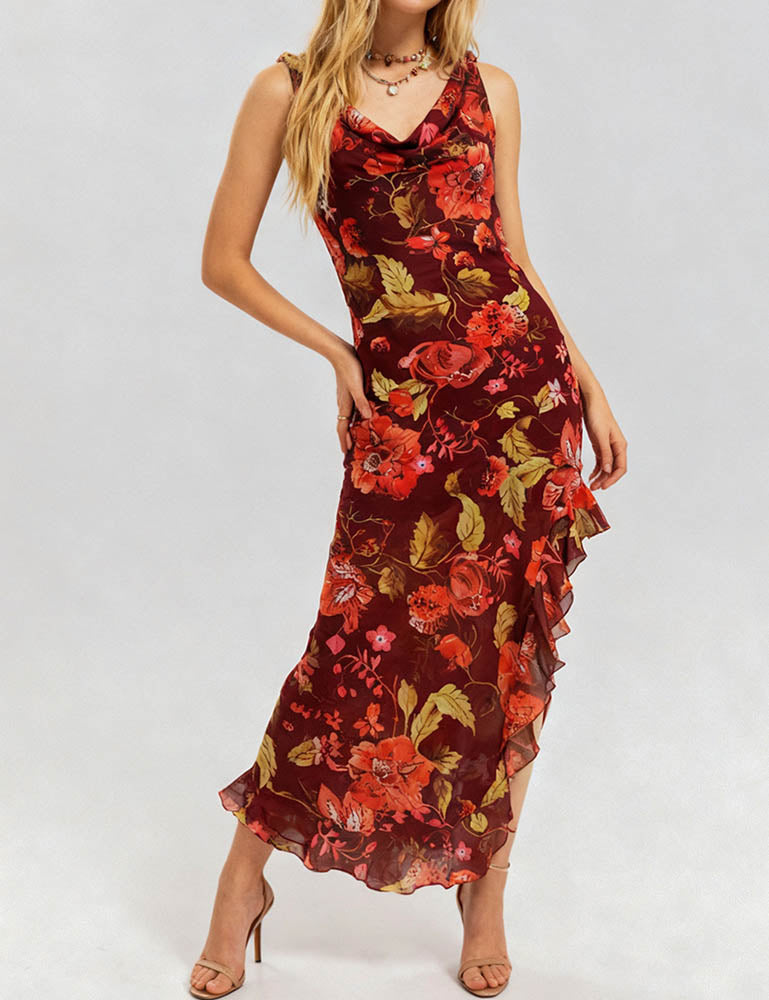 Ladies Floral Cowl Neck Ruffle Hem Ruched Maxi Dress