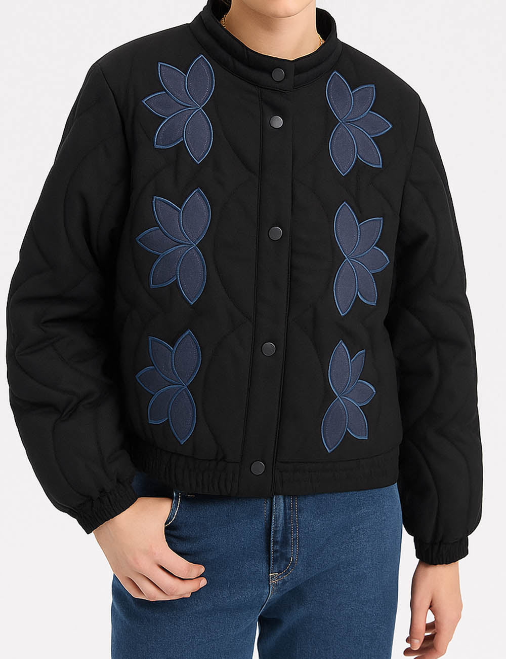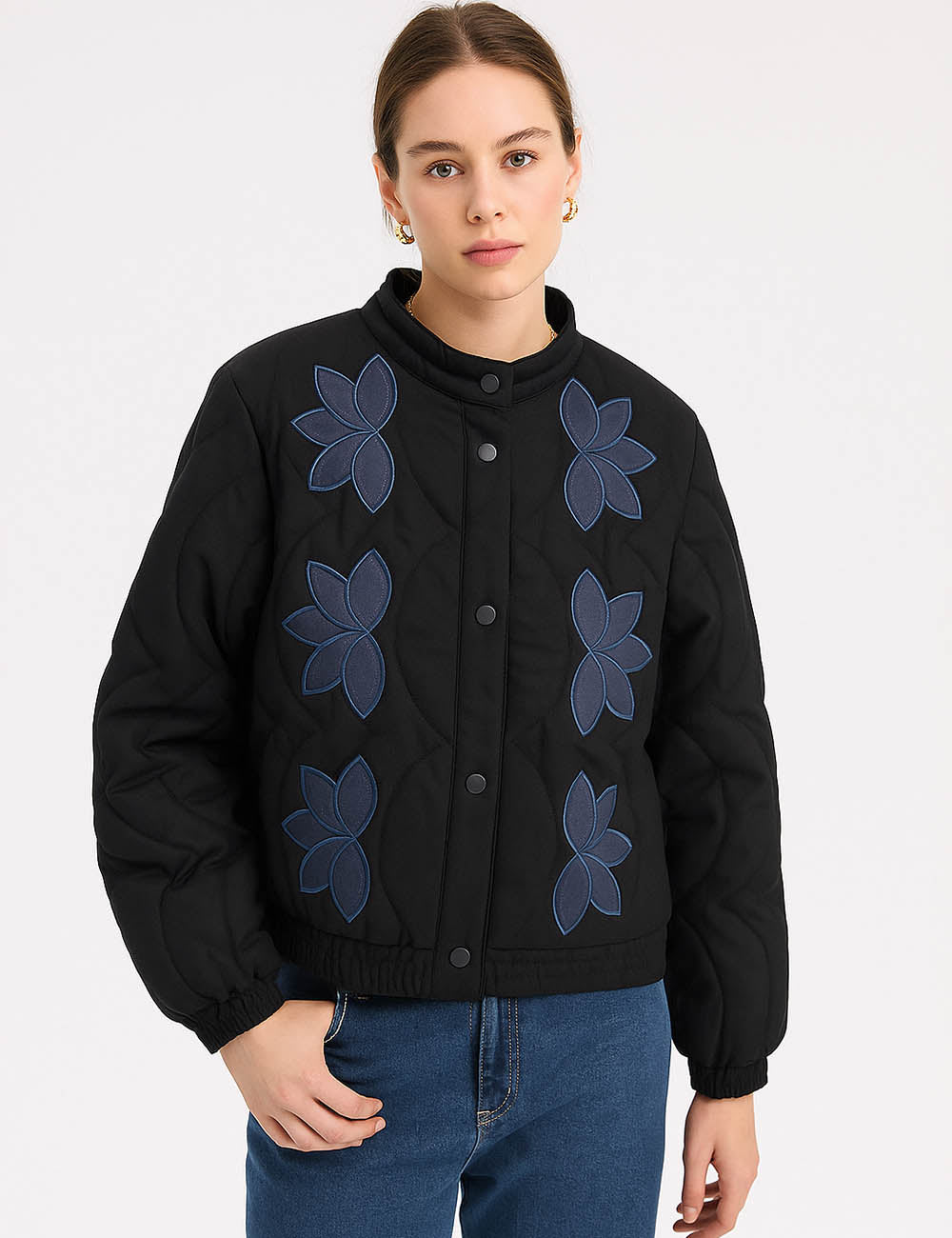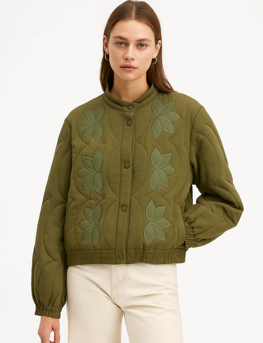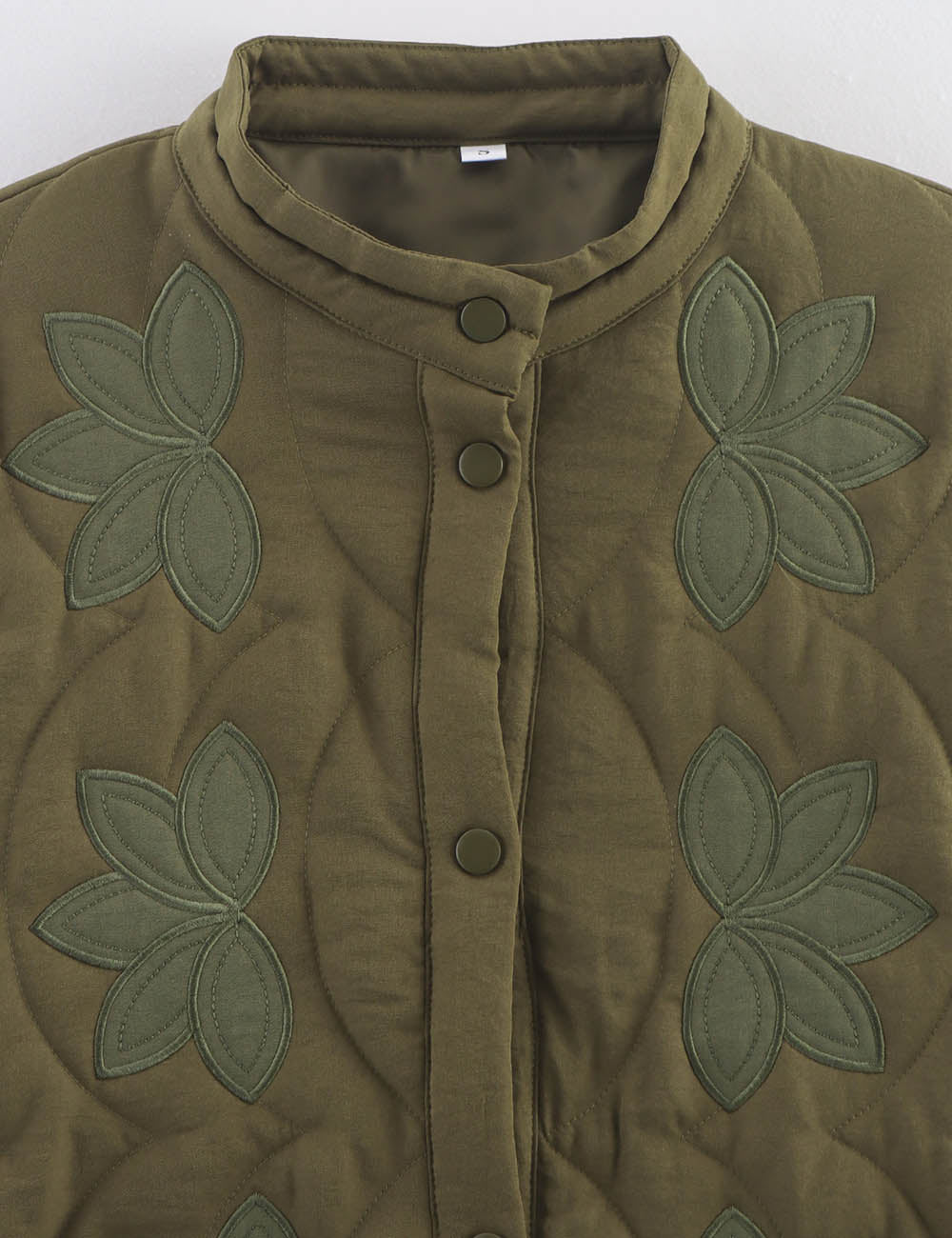 Ladies Floral Embroidery Stand Collar Quilted Cotton Jacket