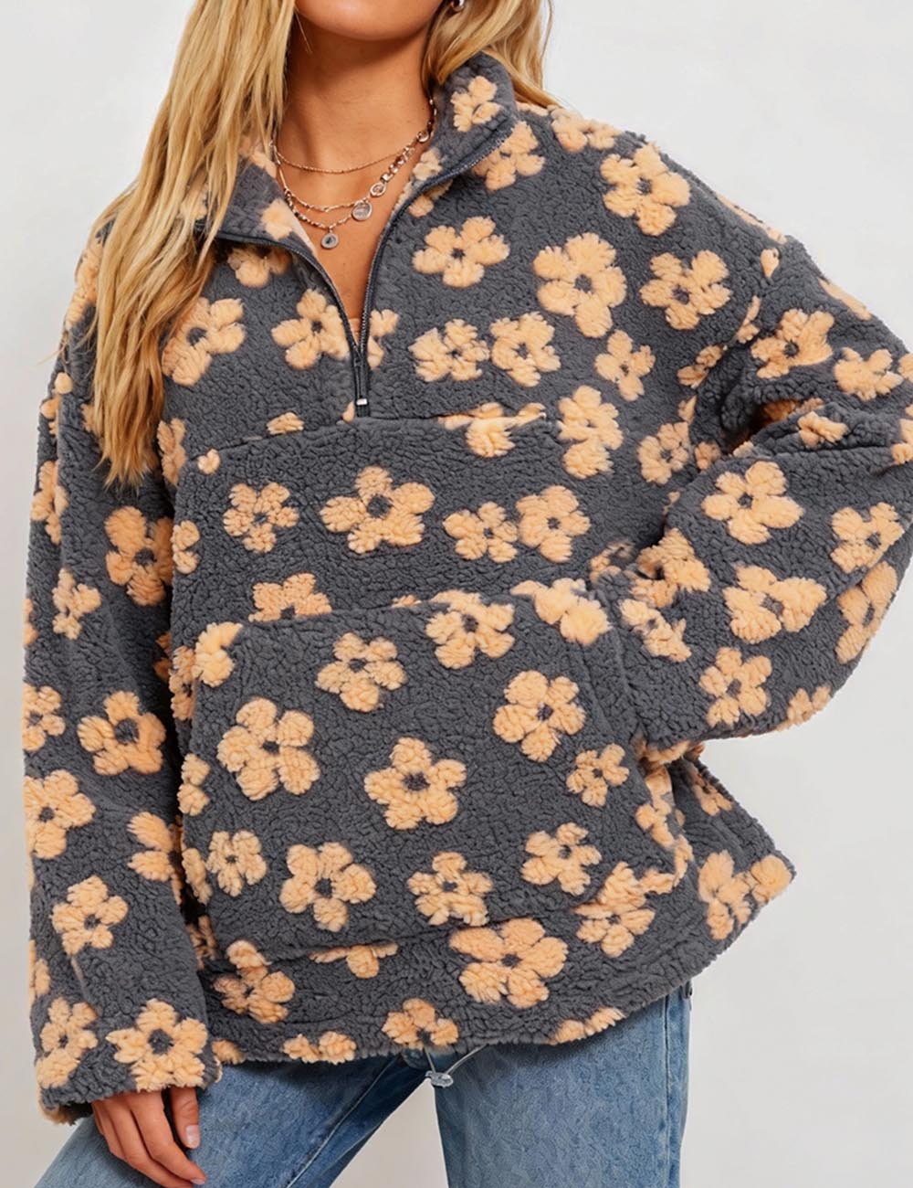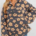 Ladies Floral Jacquard Zipper Front Fleece Sweatshirt