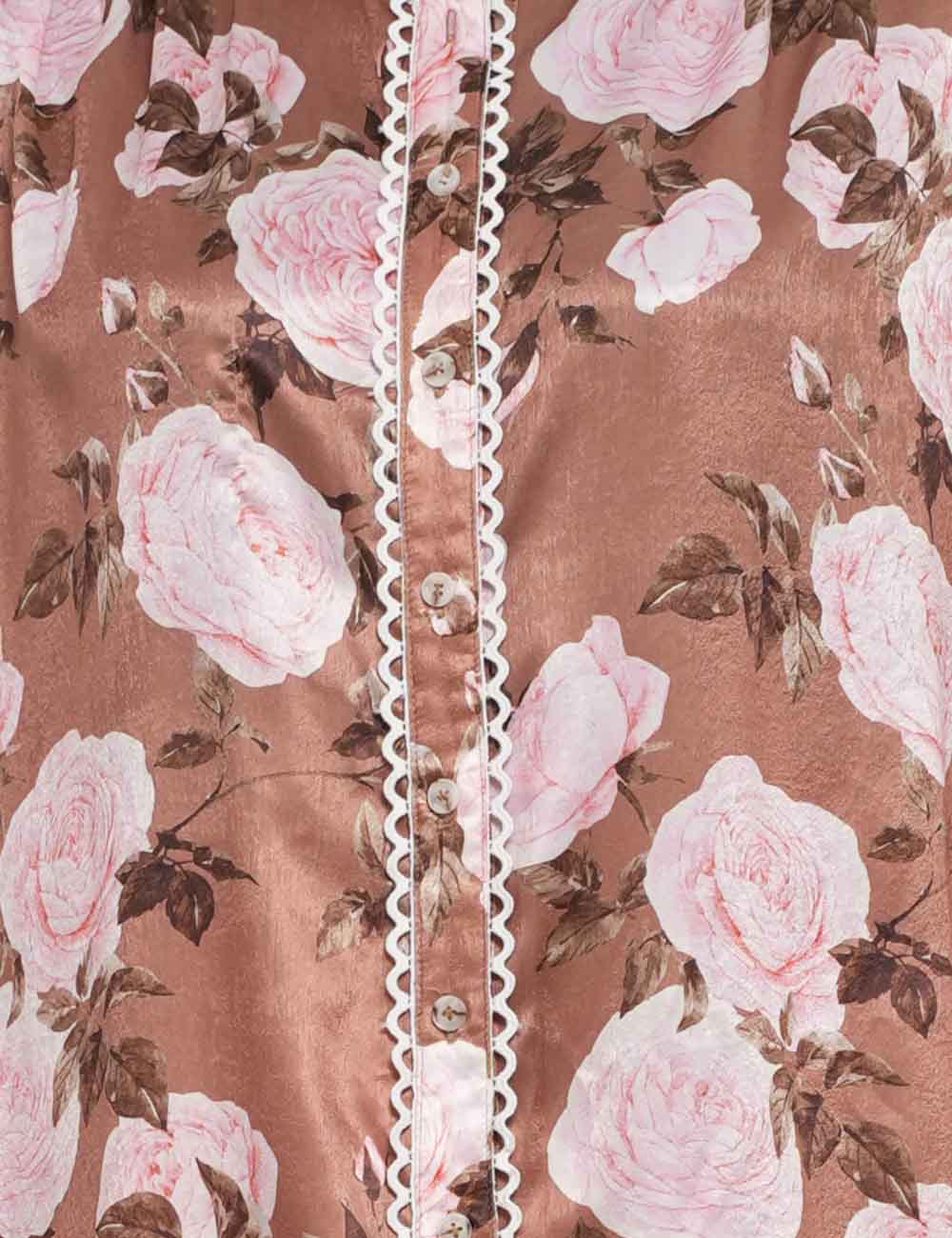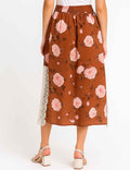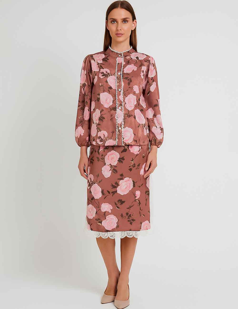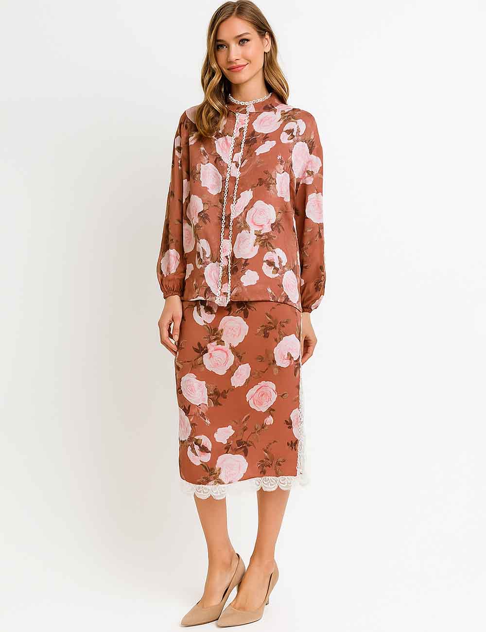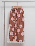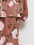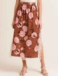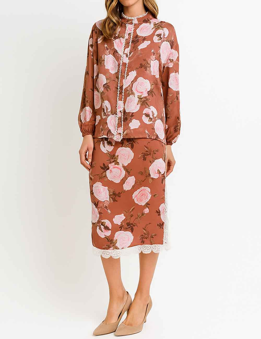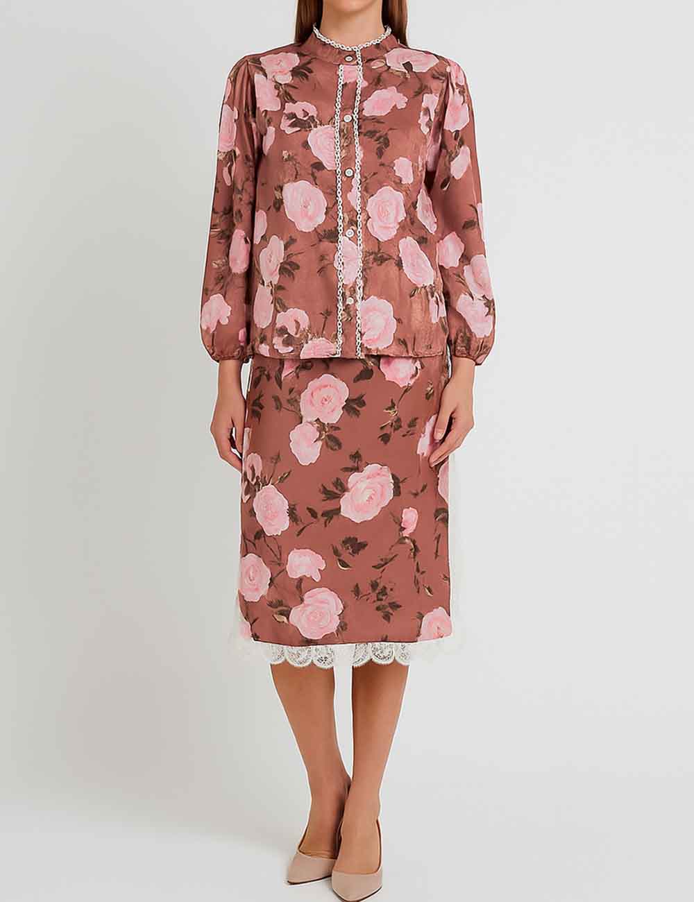 Ladies Floral Print Lace Trim Button Blouse & Skirt Set
