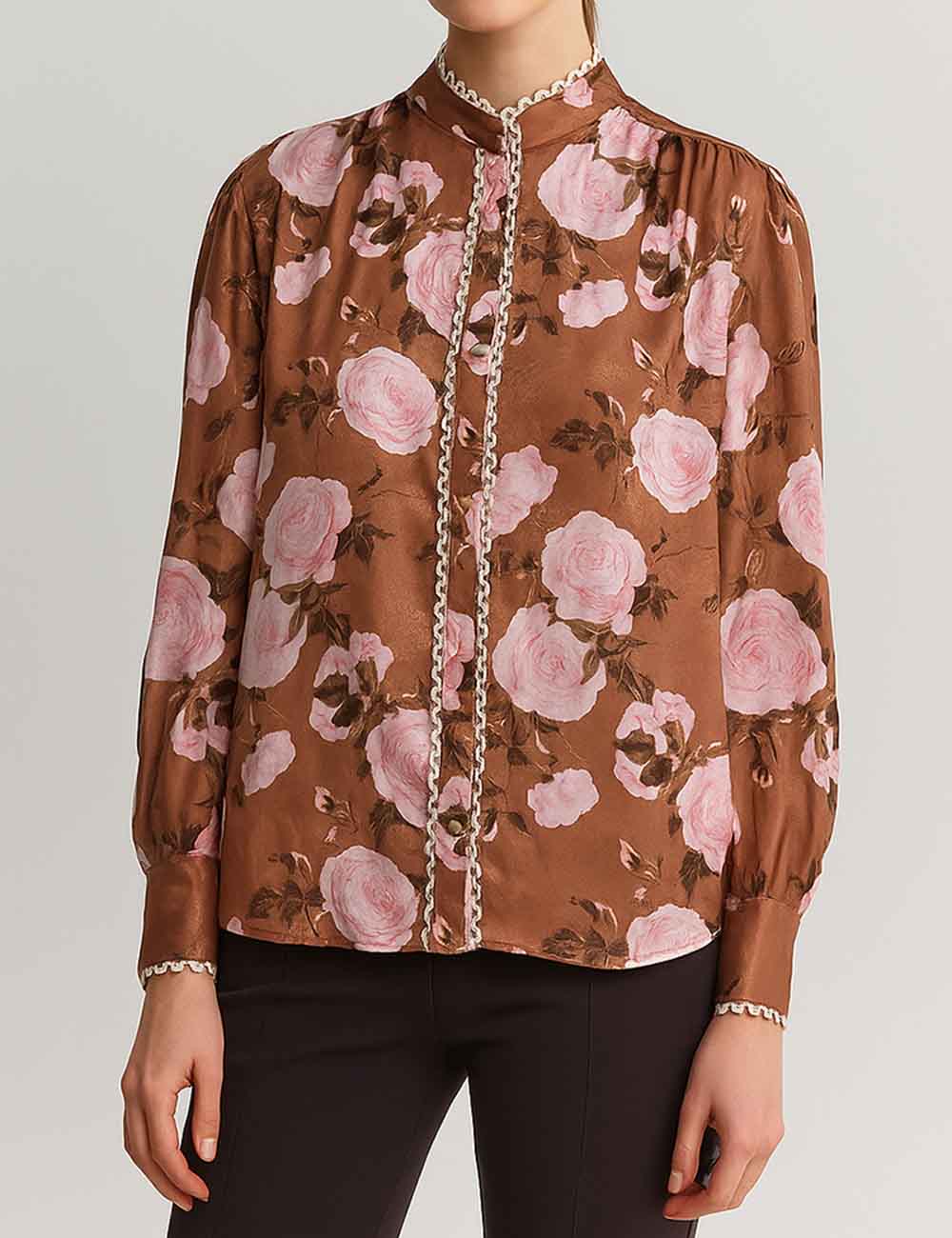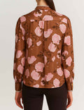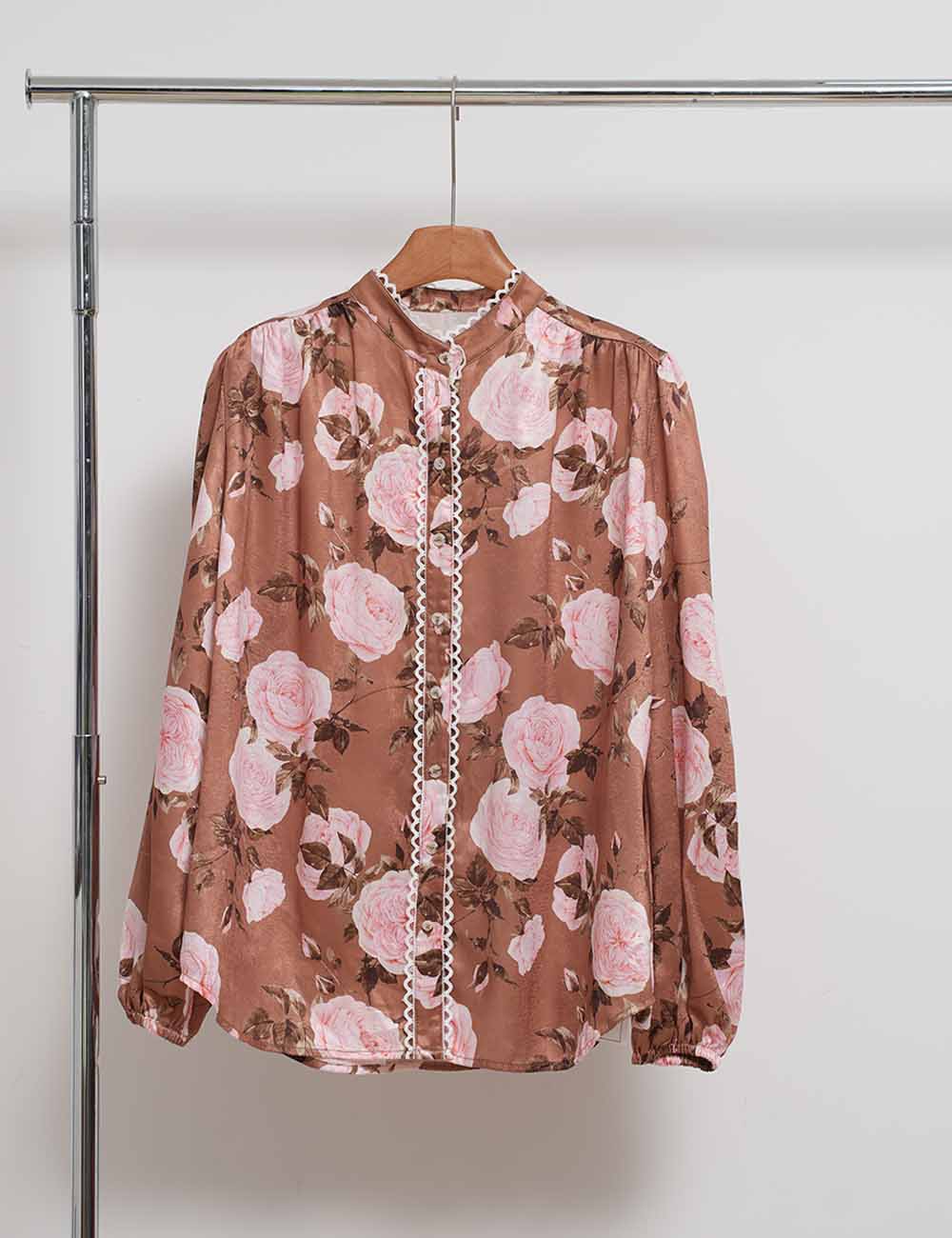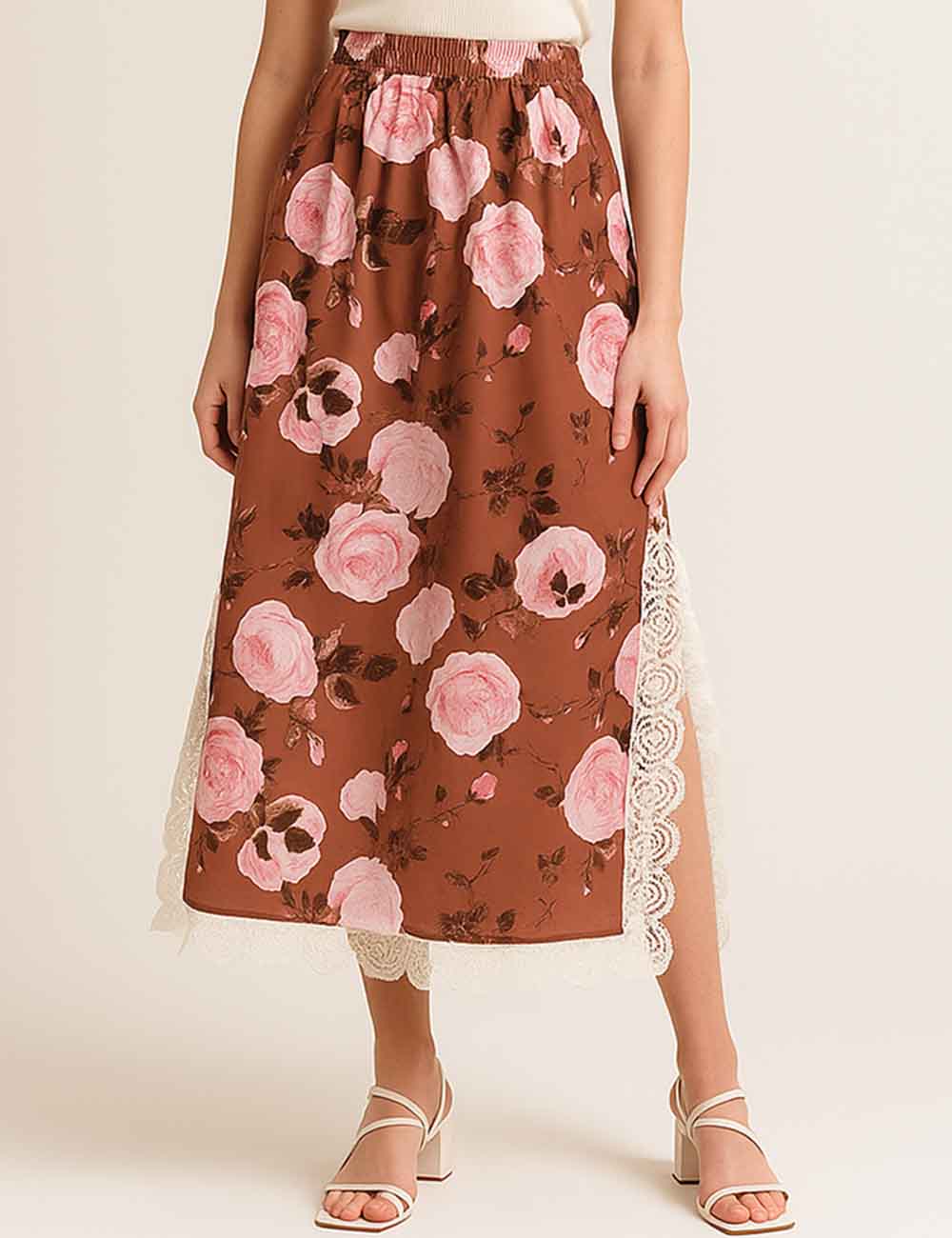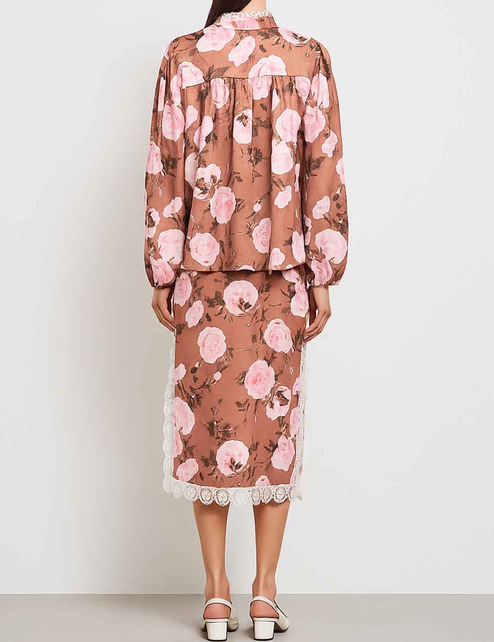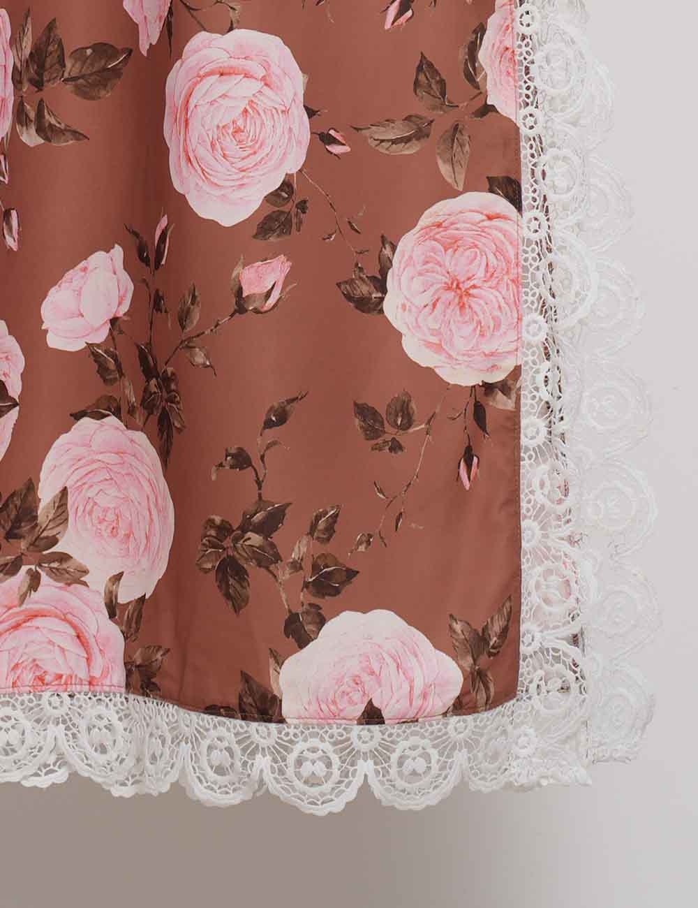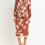Ladies Floral Print Lace Trim Button Blouse & Skirt Set