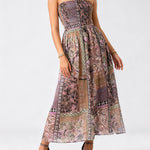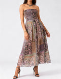Ladies Floral Print Smocked Back Strapless Tube Maxi Dress