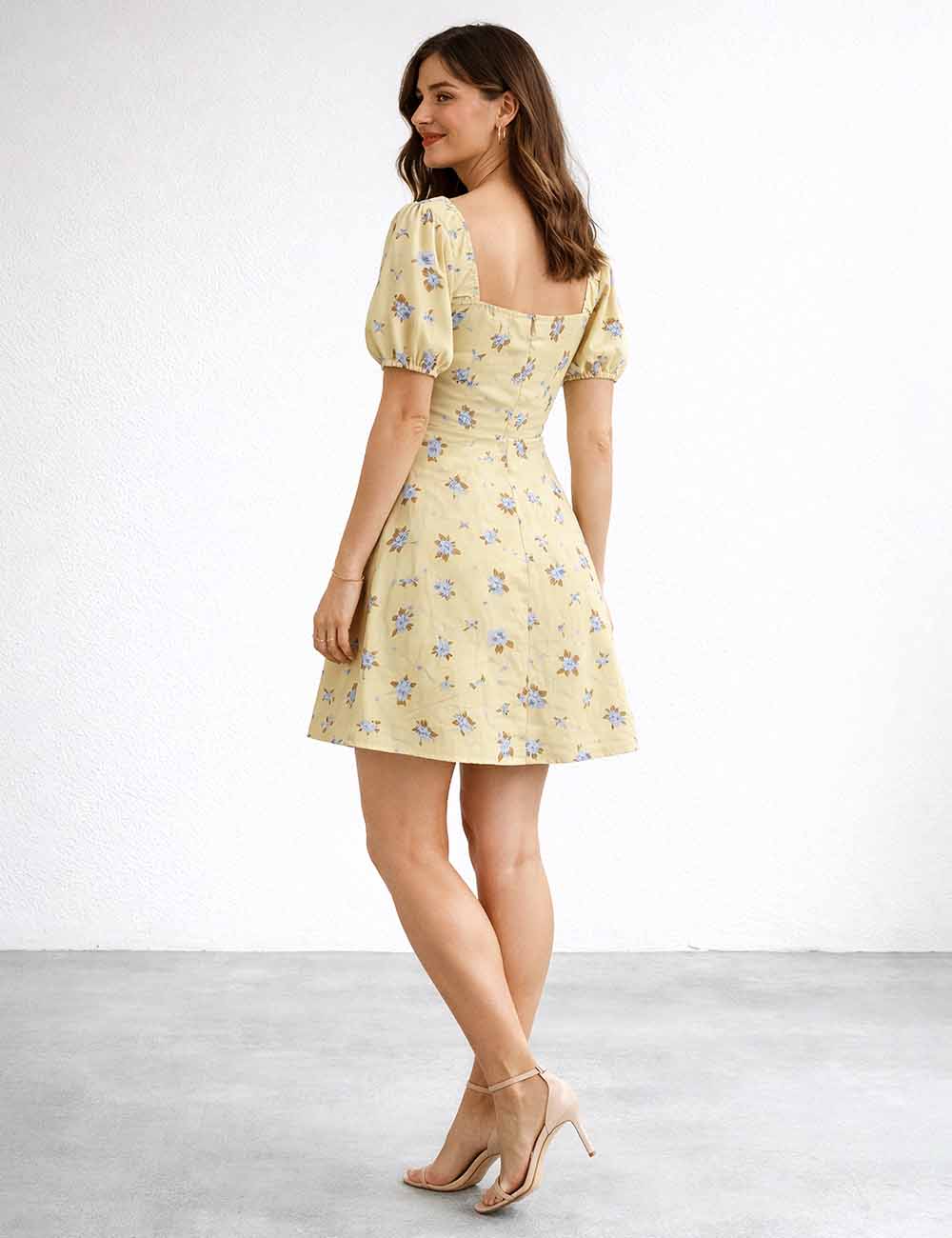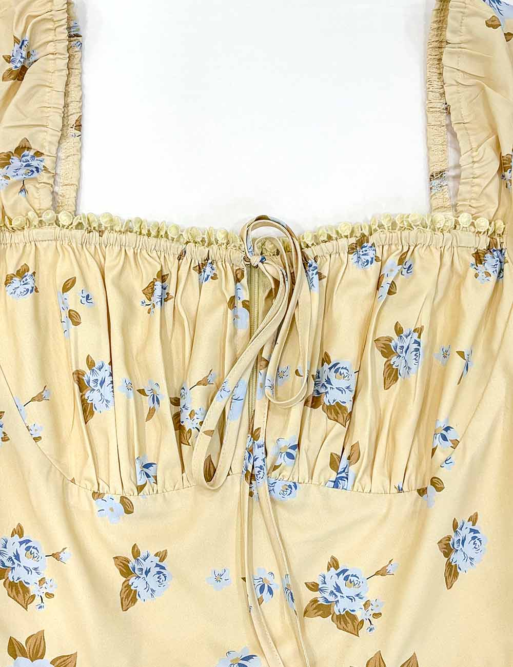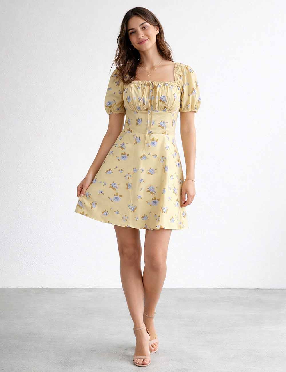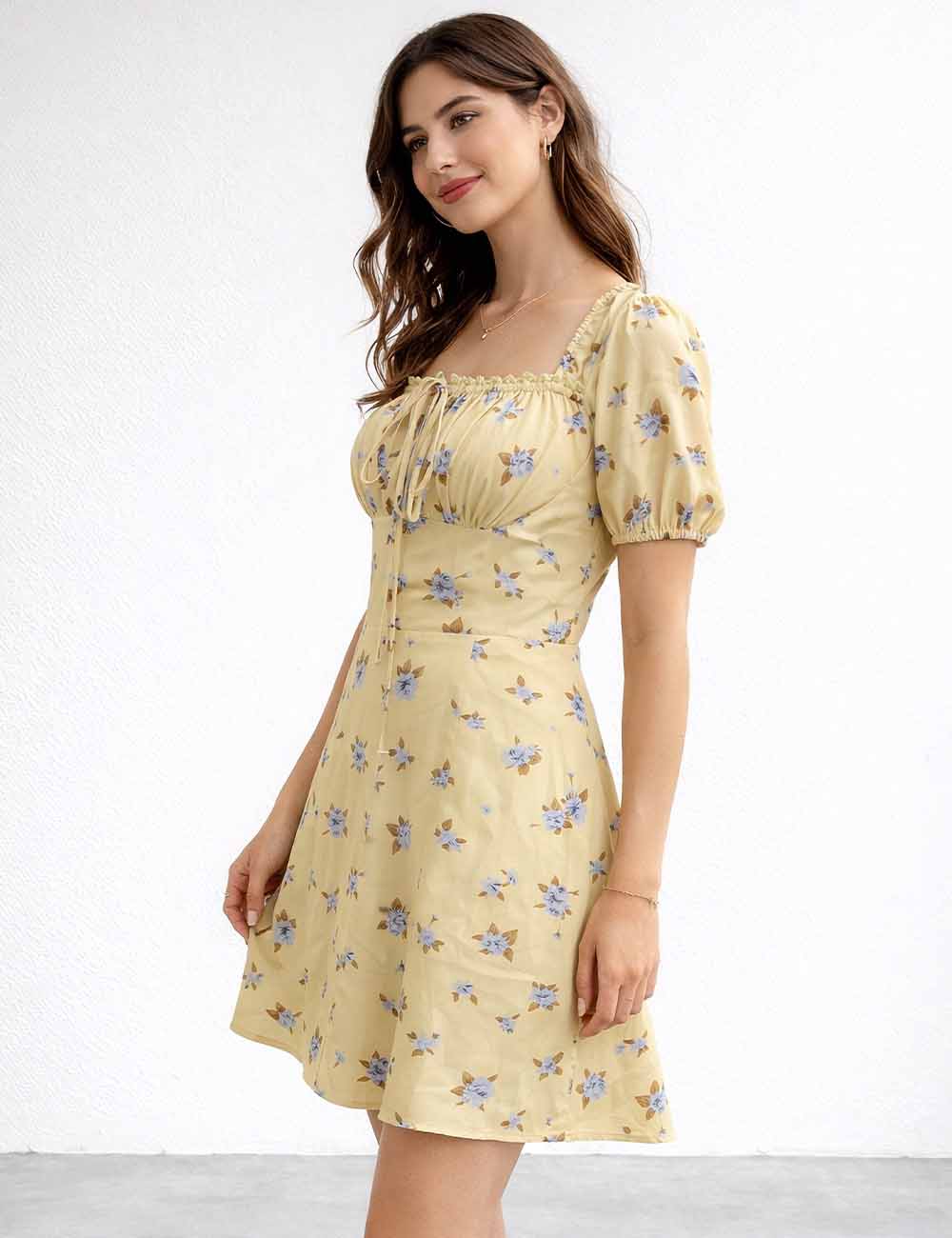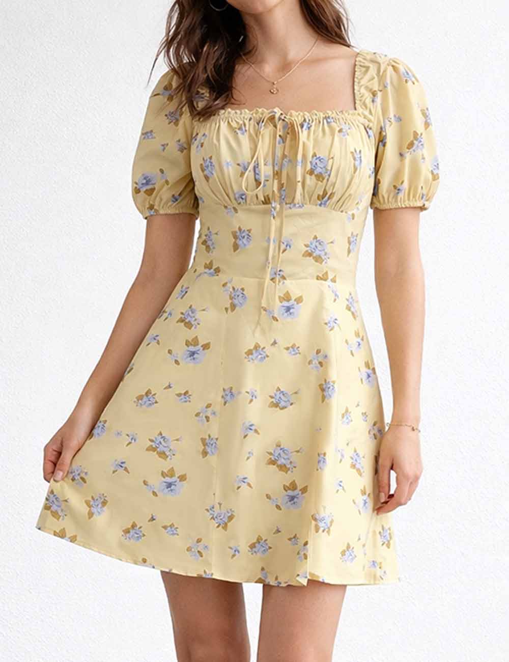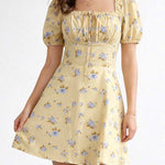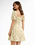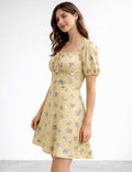 Ladies Floral Print Square Neck Drawstring Short Sleeves Mini Dress