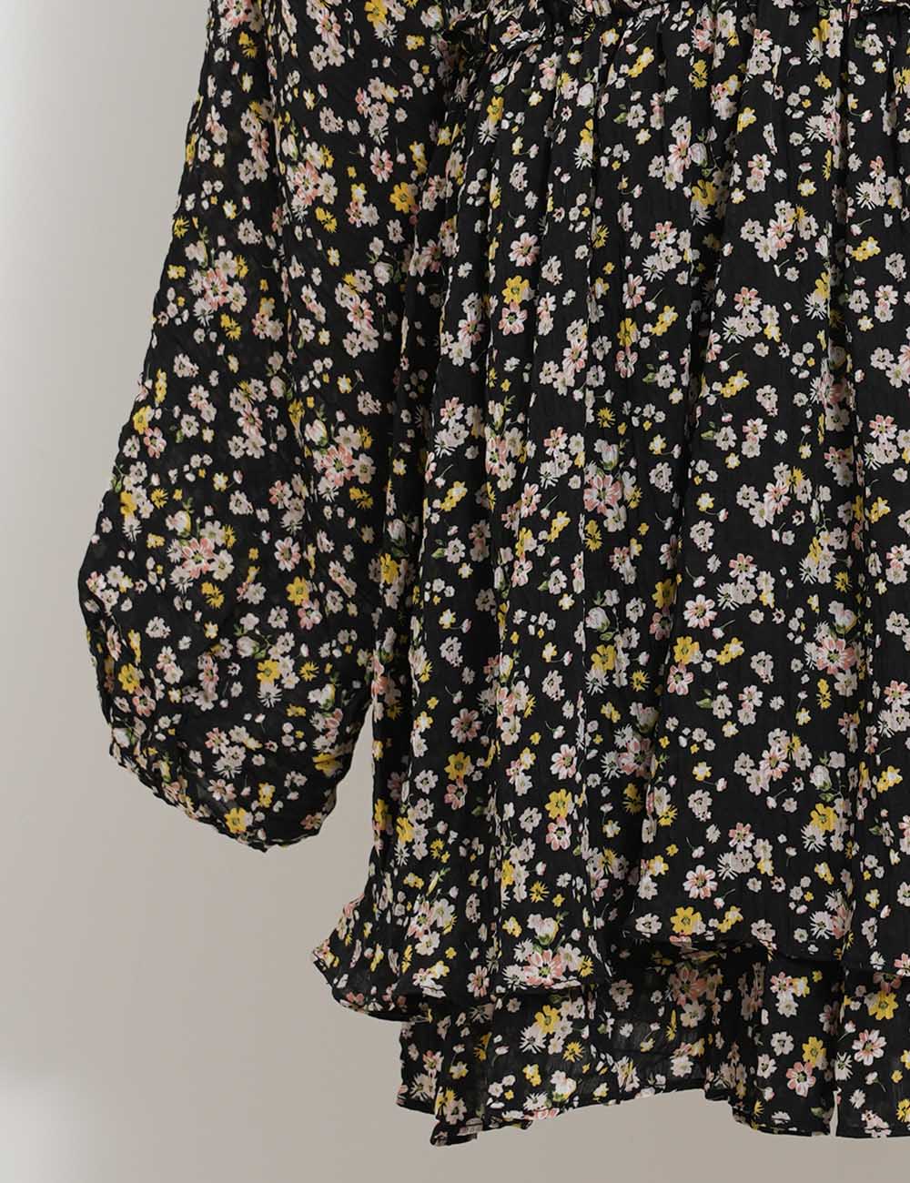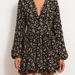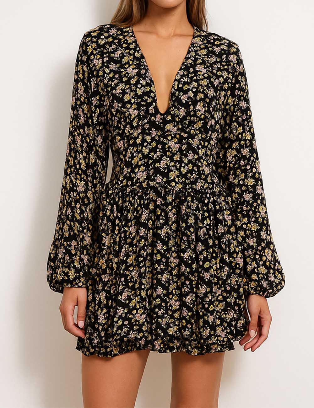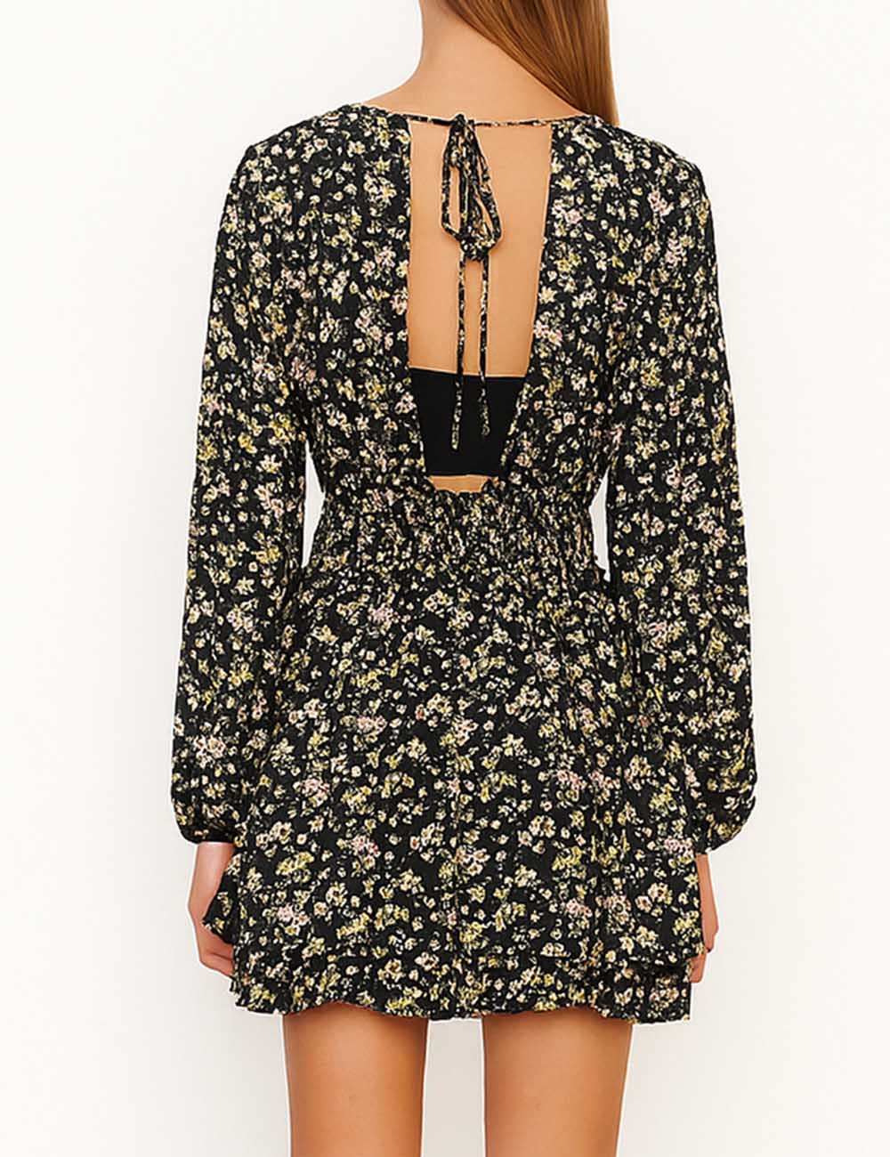 Ladies Floral V-Neck Long Sleeves Tiered Ruffle Mini Dress