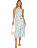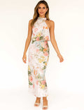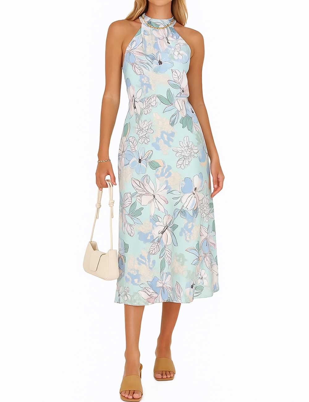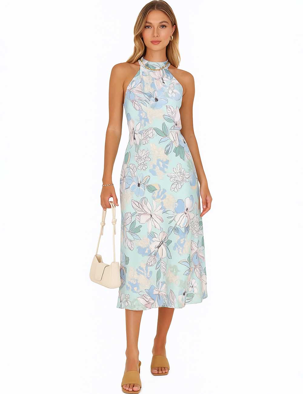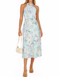 Ladies Flower Print Satin Mock Neck Ruched Maxi Dress