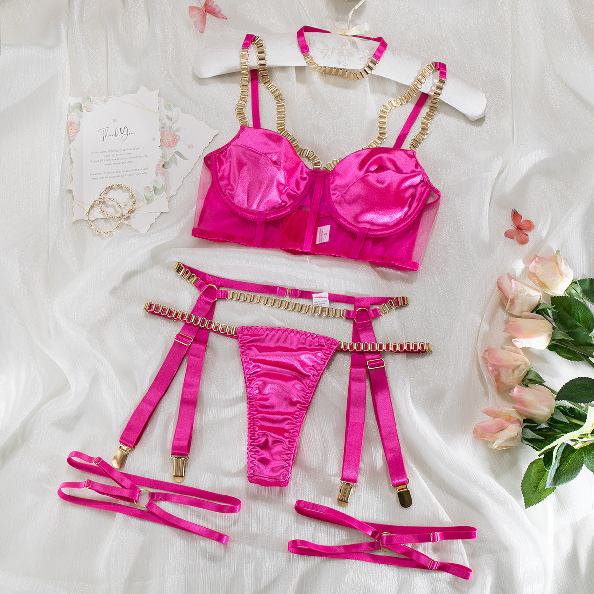 Ladies Golden Chain Solid Color 3PCS Lingerie Set SKLG4080