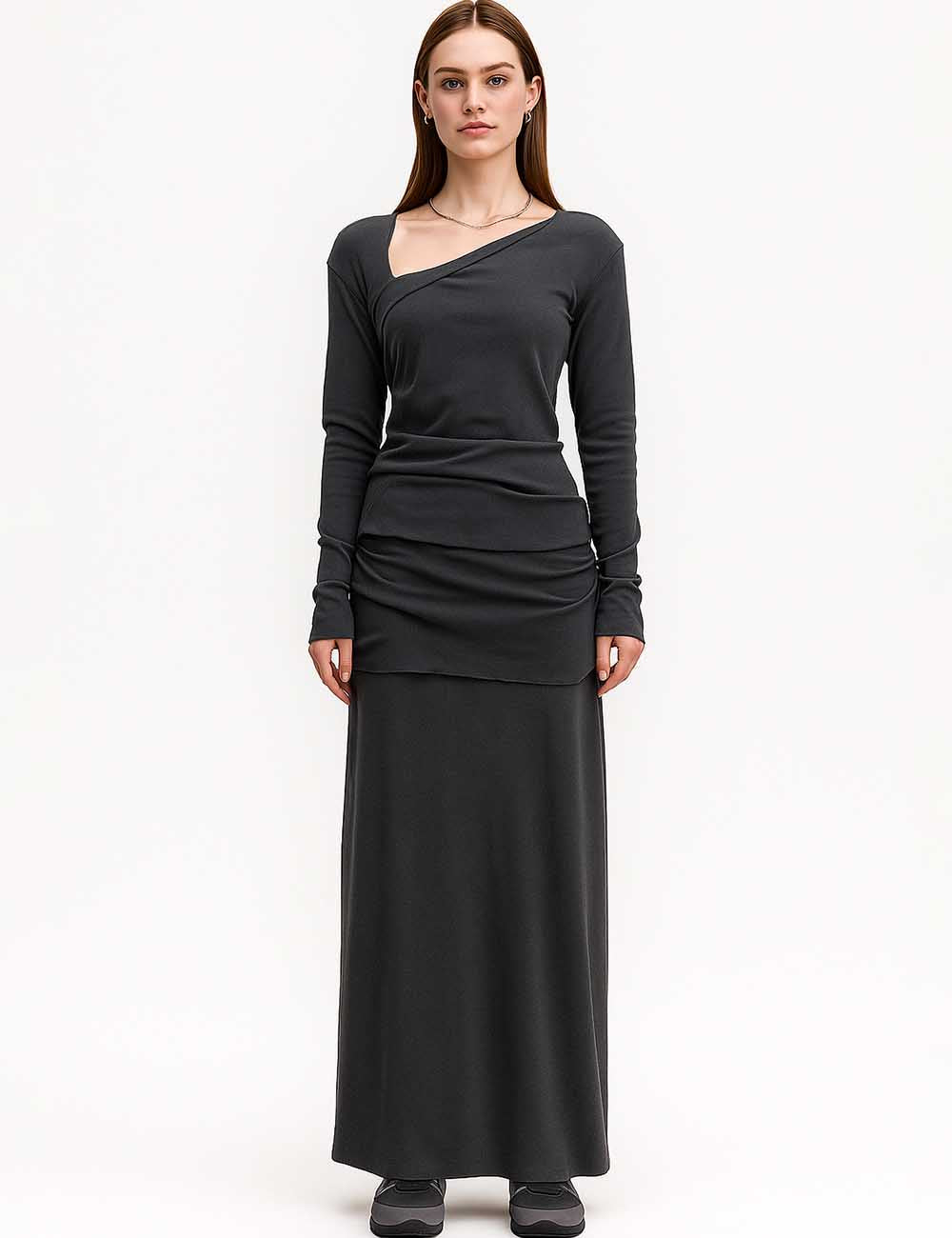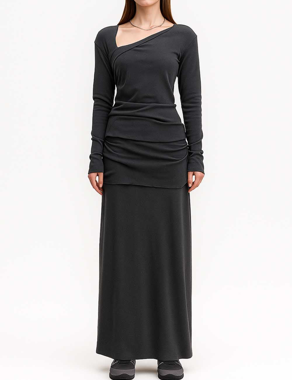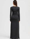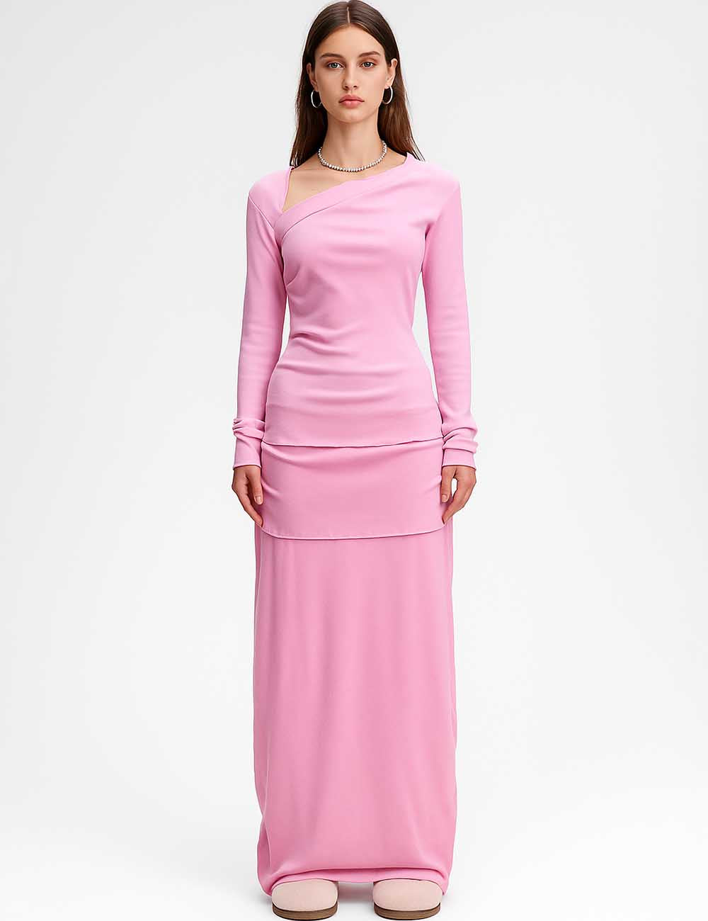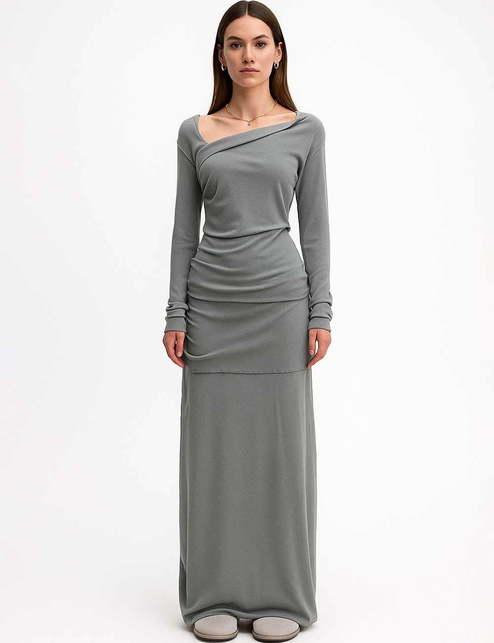 Ladies Irregular Neckline Ruched Top & Maxi Skirt 2PCS Set