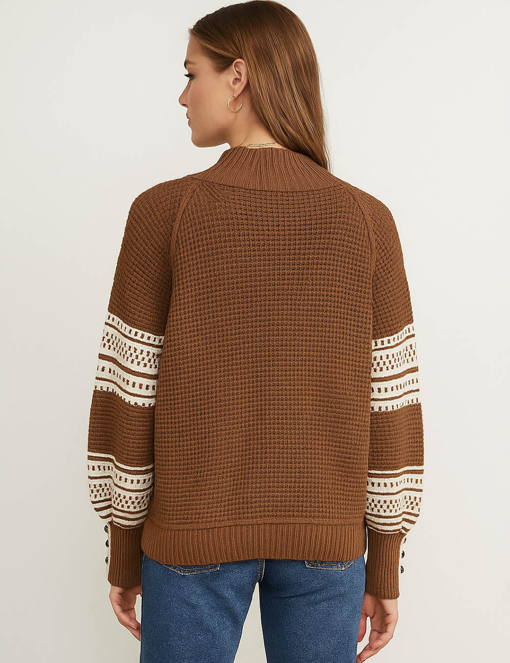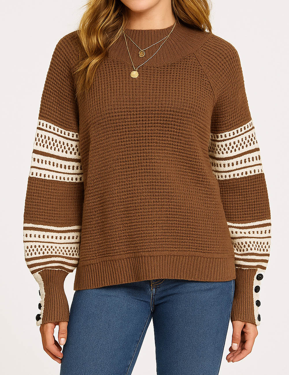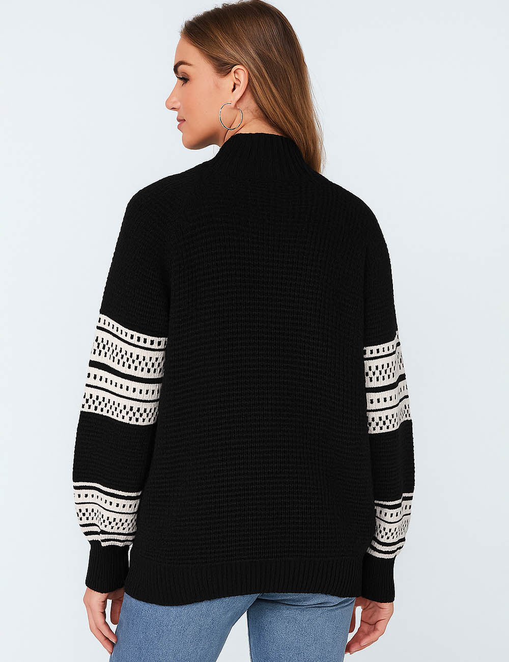 Ladies Jacquard Mock Neck Bubble Sleeves Rib Knit Sweater