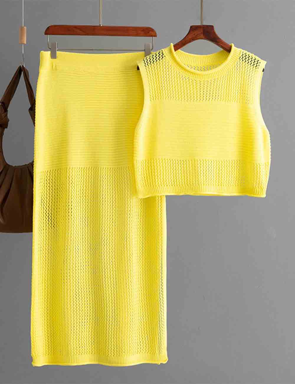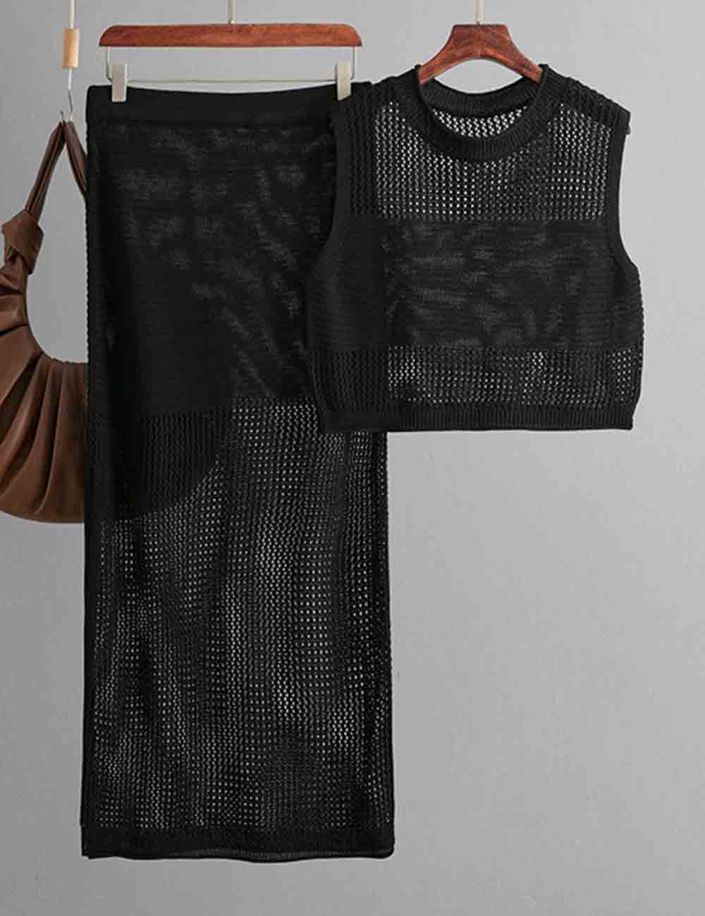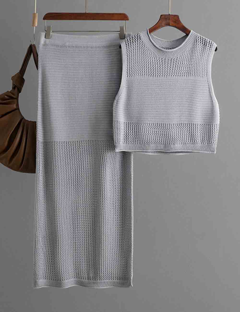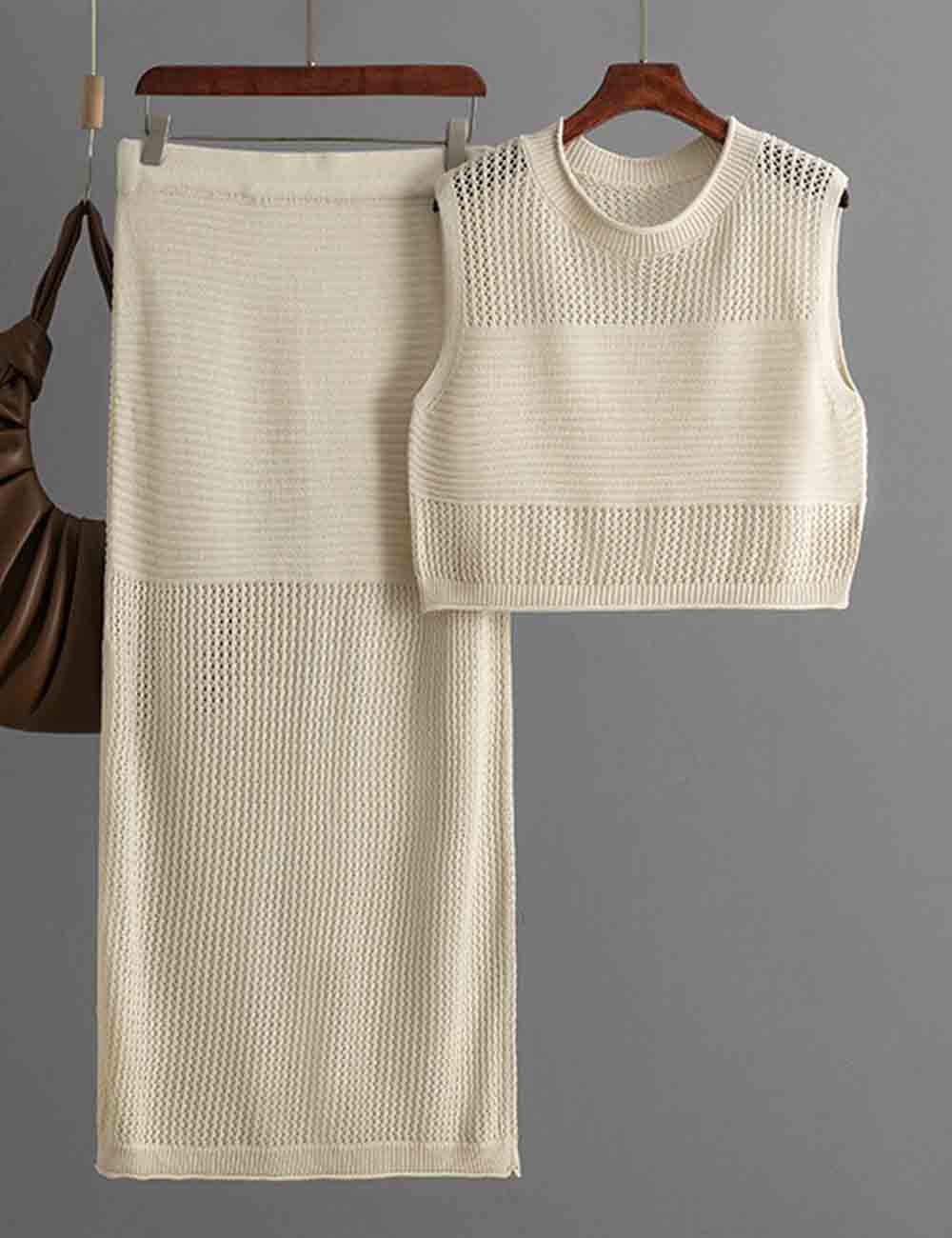 Ladies Knit Hollow Out Vest & Skirt 2PCS Set