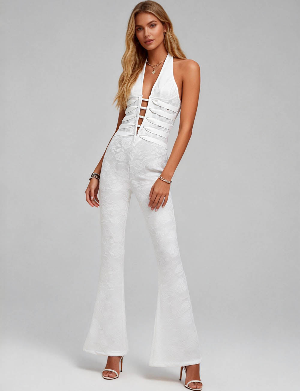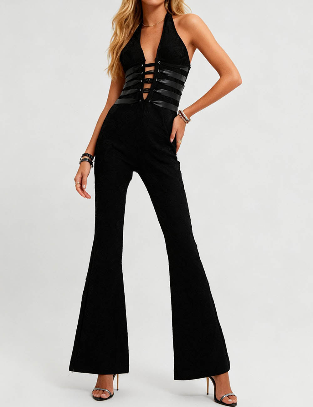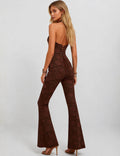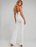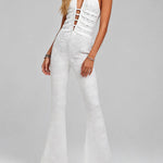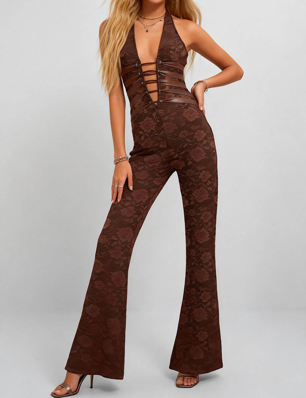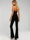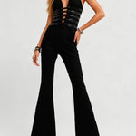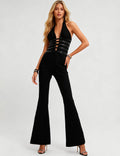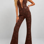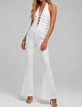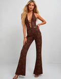 Ladies Lace Deep V Halter Neck Cross-Back Lace-Up Jumpsuit