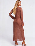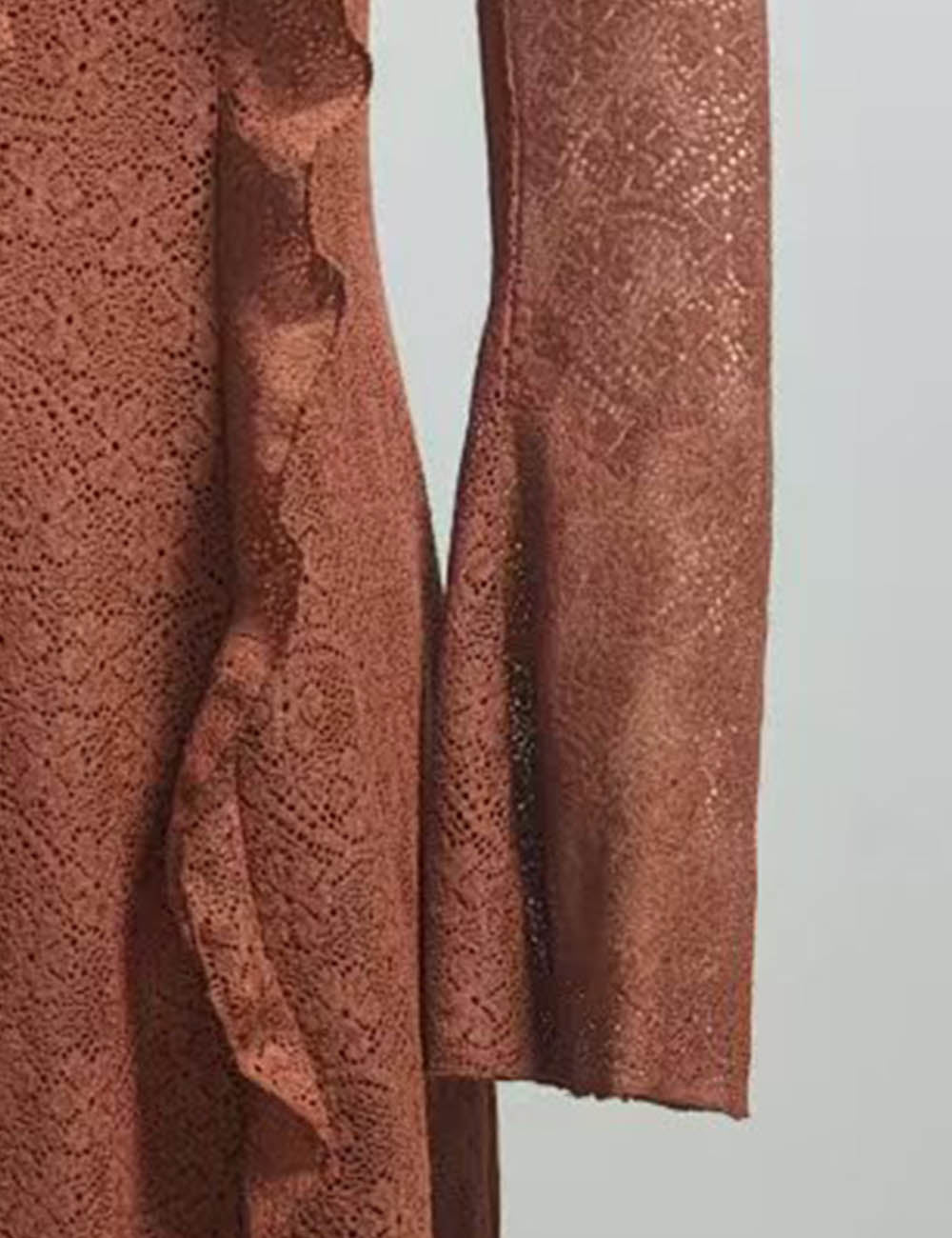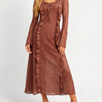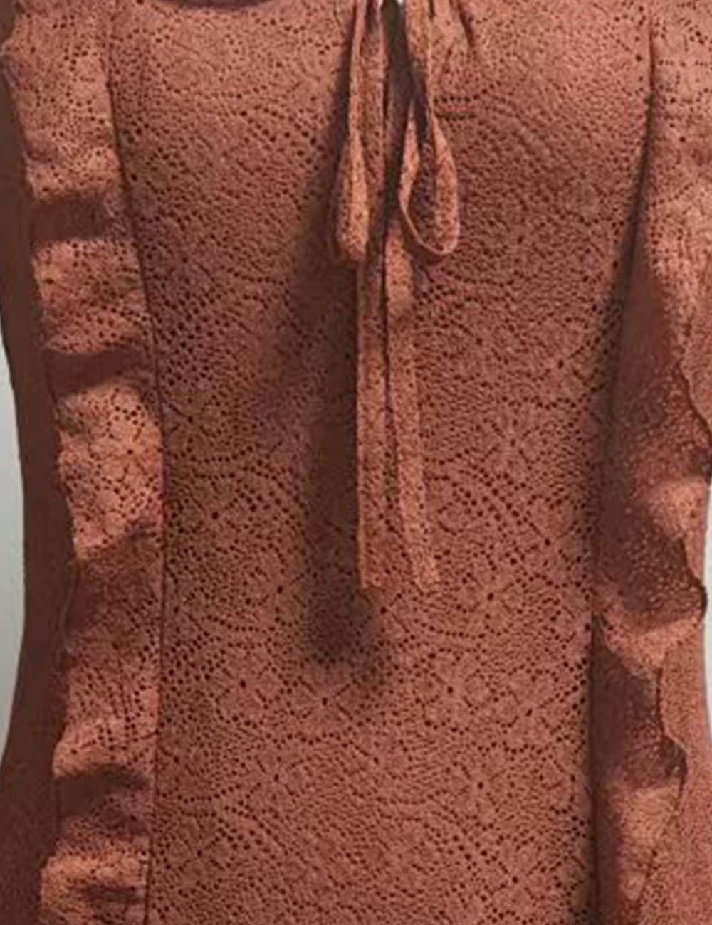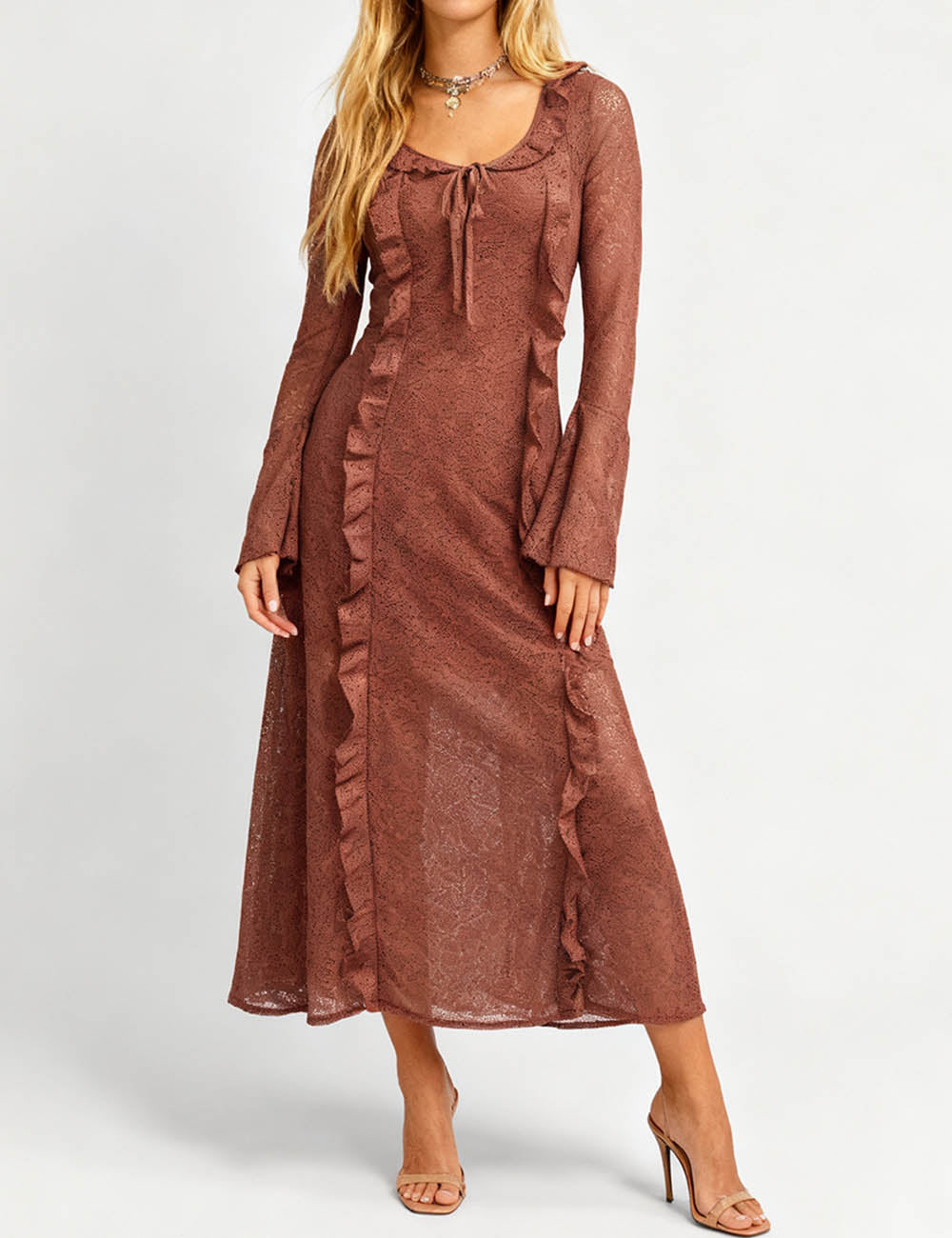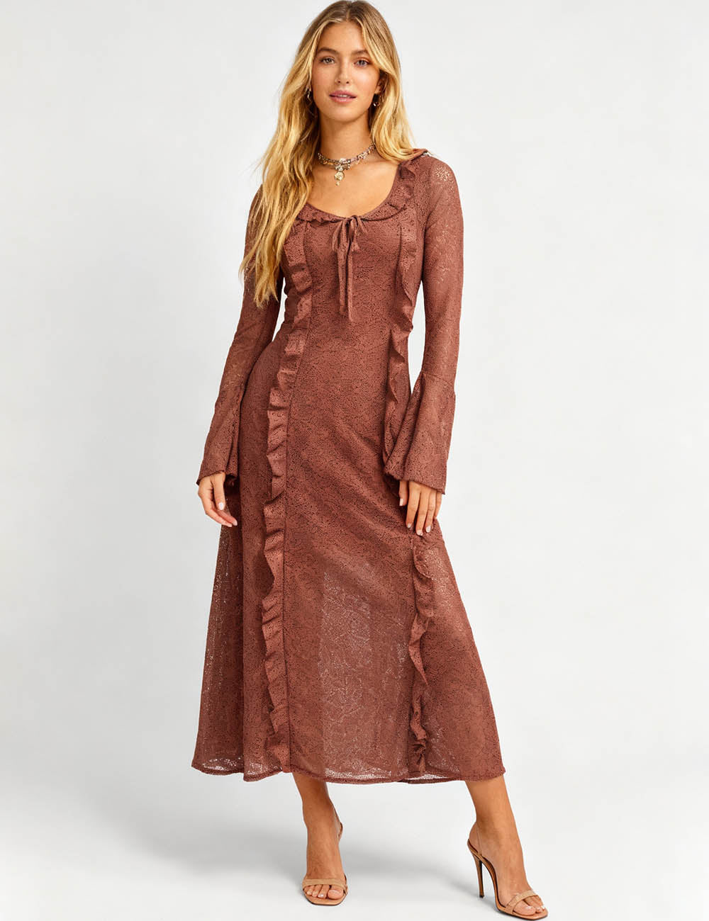 Ladies Lace Eyelet Scoop Neck Tie Front Ruffle Trim Midi Dress