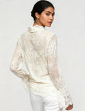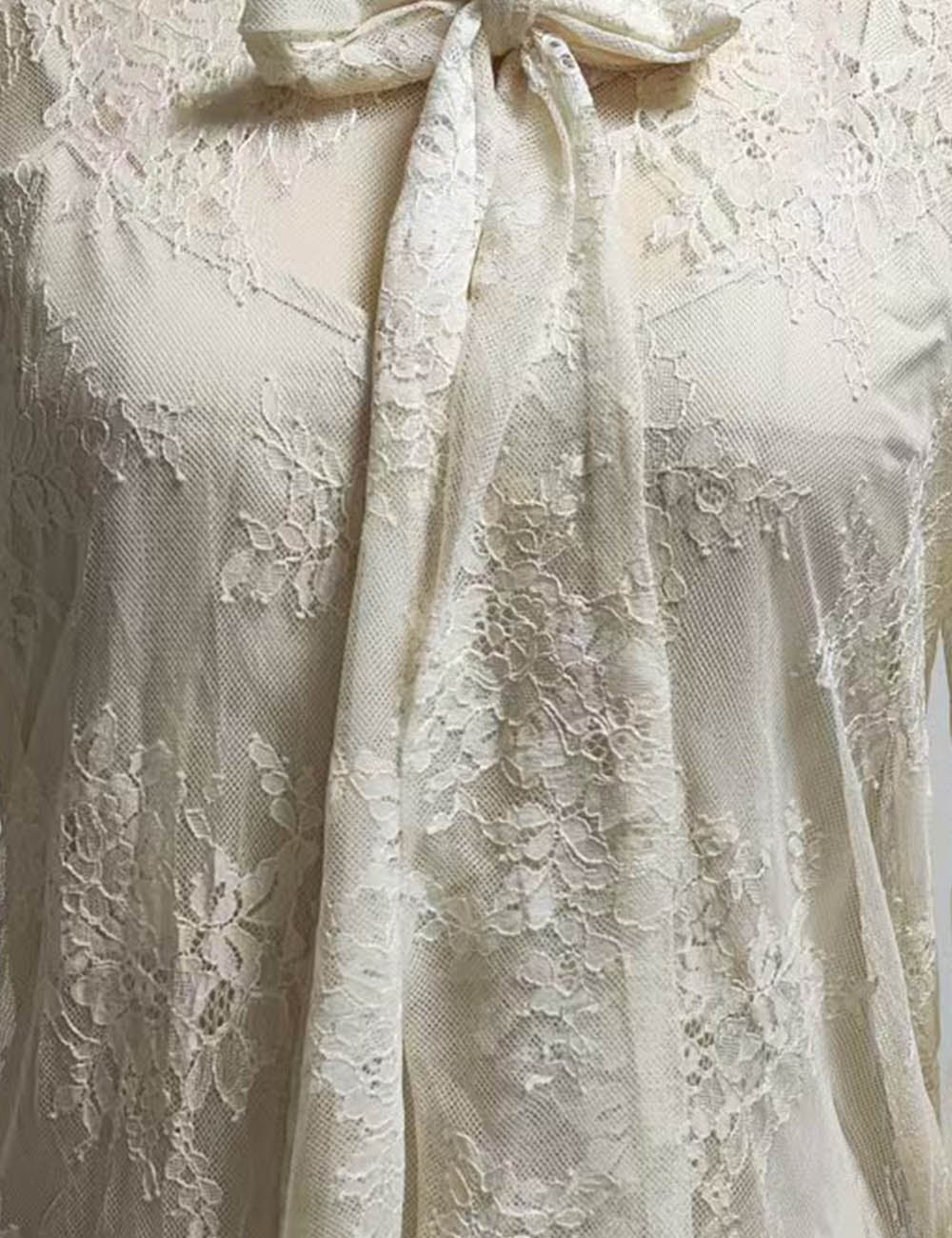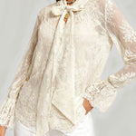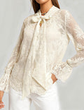 Ladies Lace See Sheer Bow Tie Neck Flared Sleeves Blouse