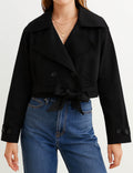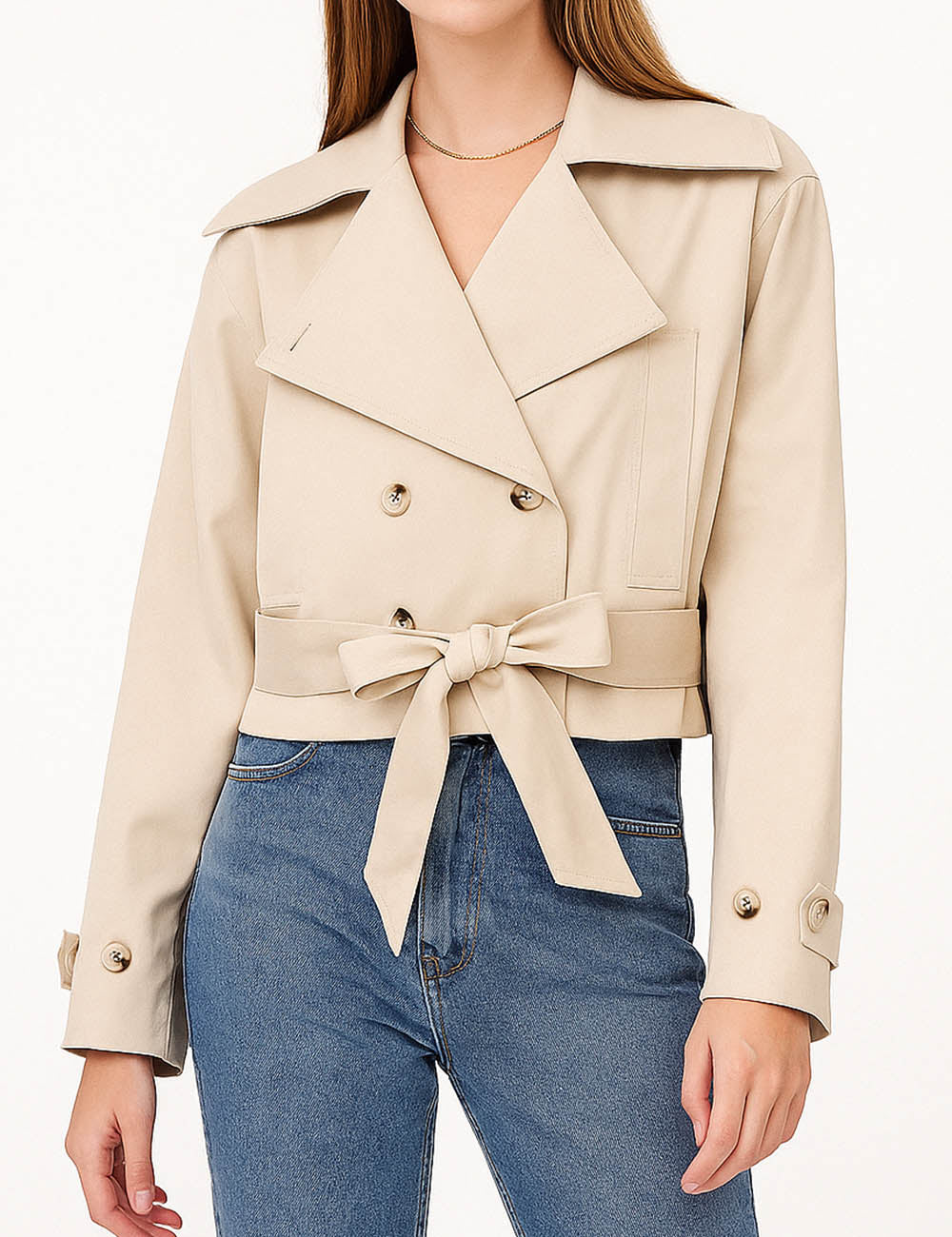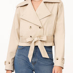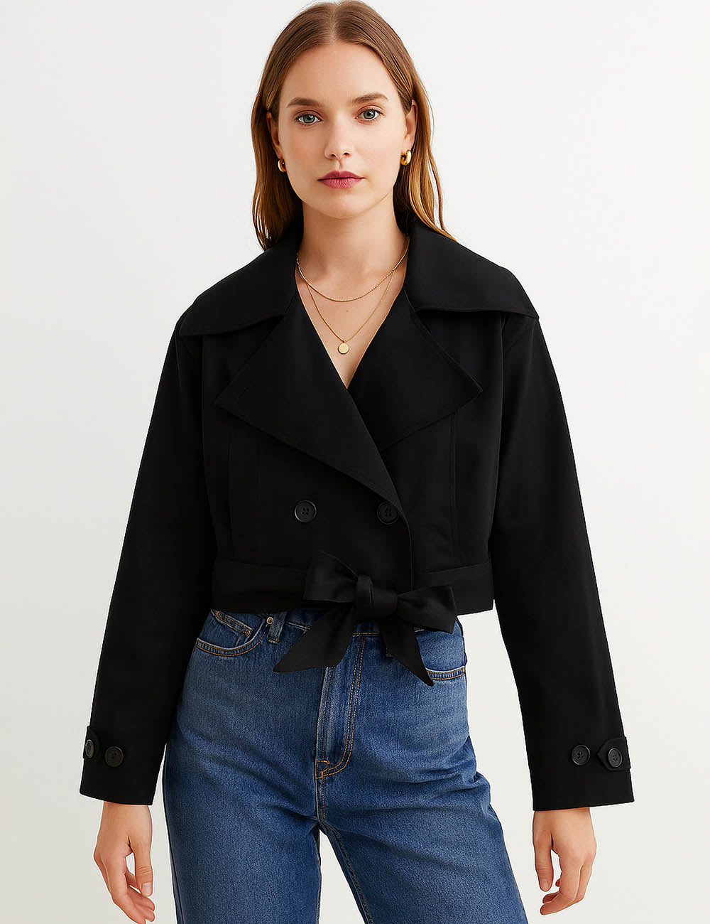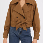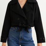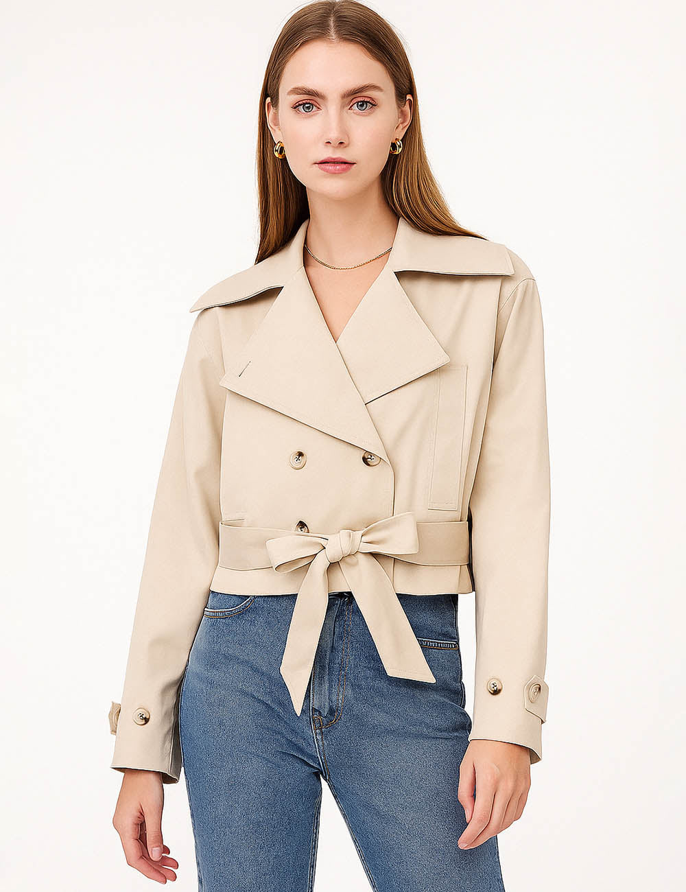 Ladies Lapel Collar Button Tie Bow Cropped Trench Jacket