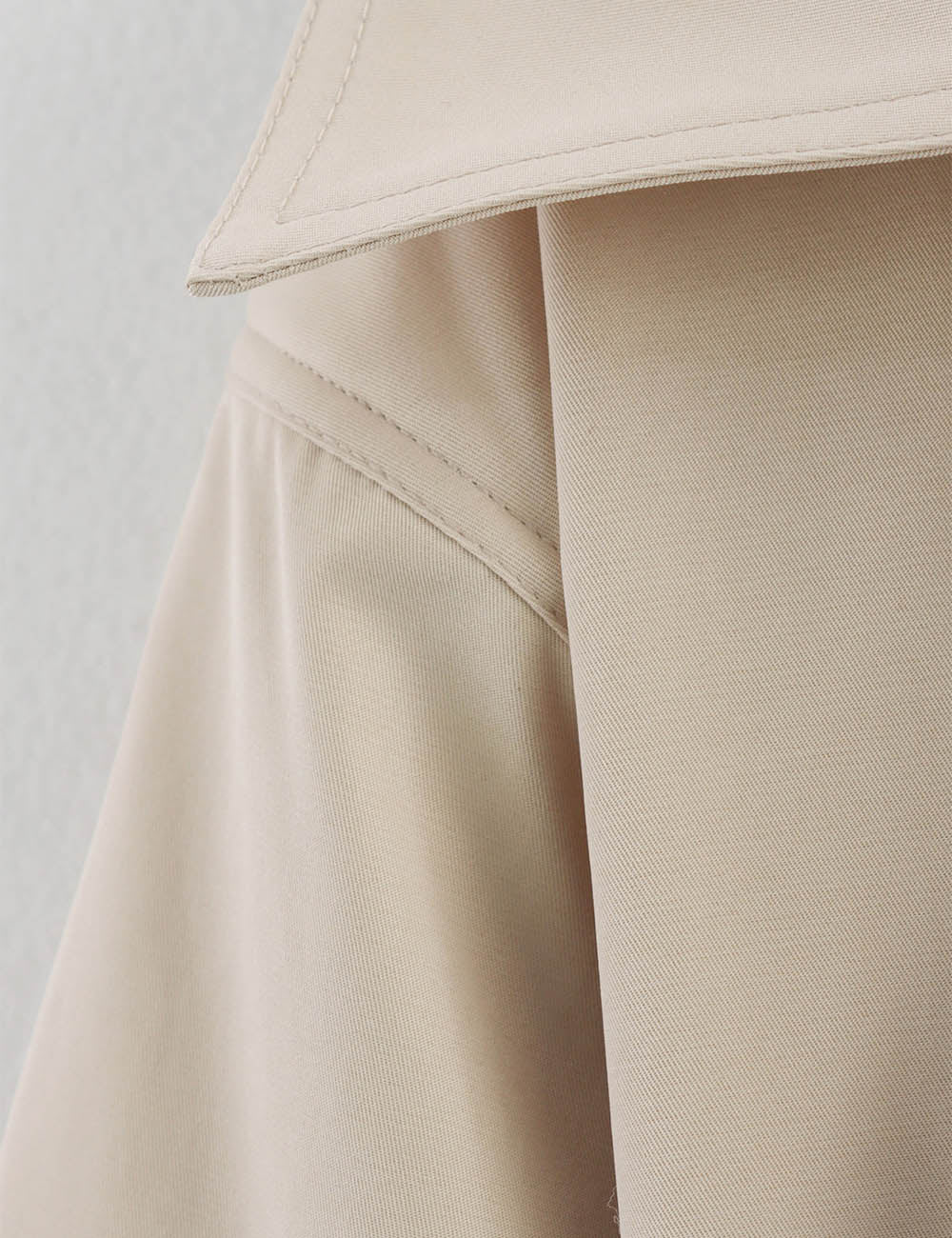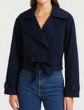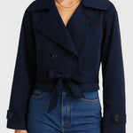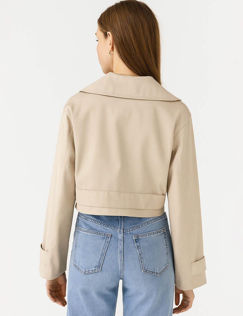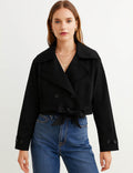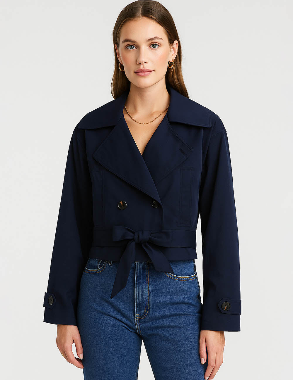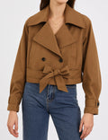 Ladies Lapel Collar Button Tie Bow Cropped Trench Jacket