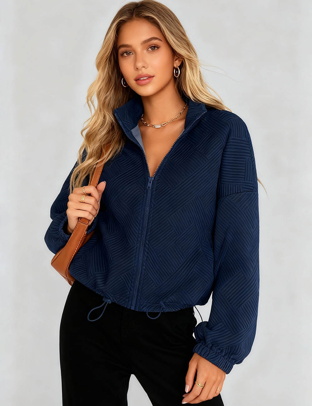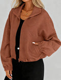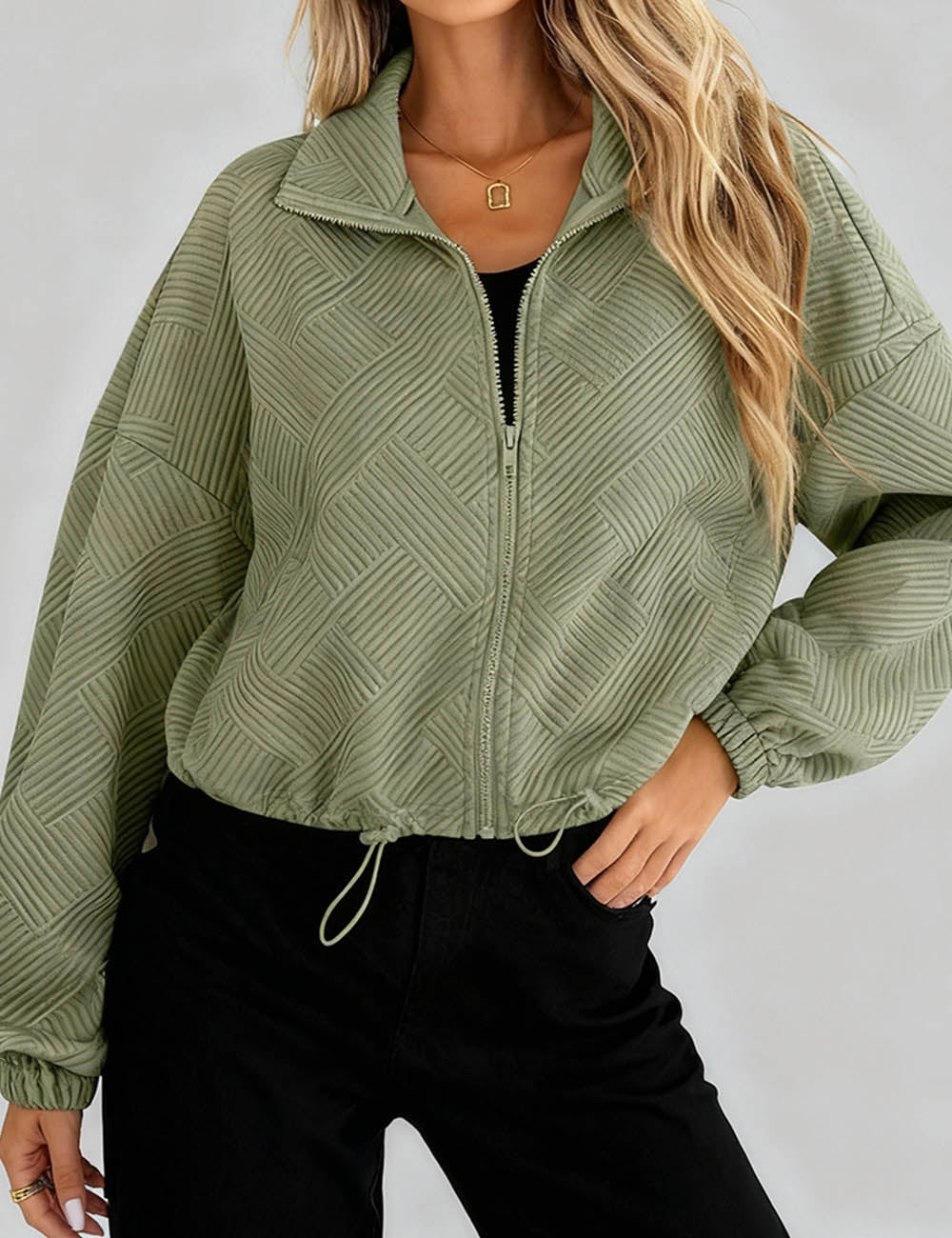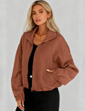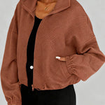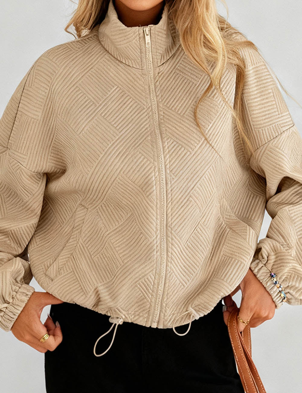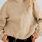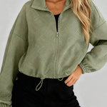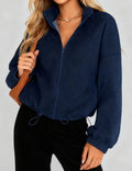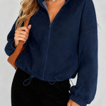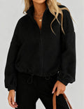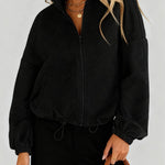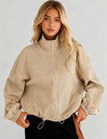 Ladies Lapel Collar Zipper Front Drawstring Hem Jacket