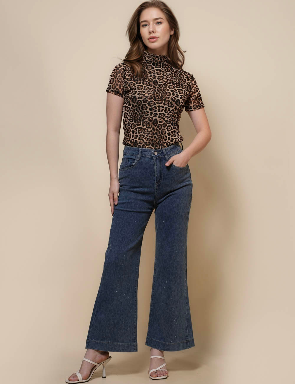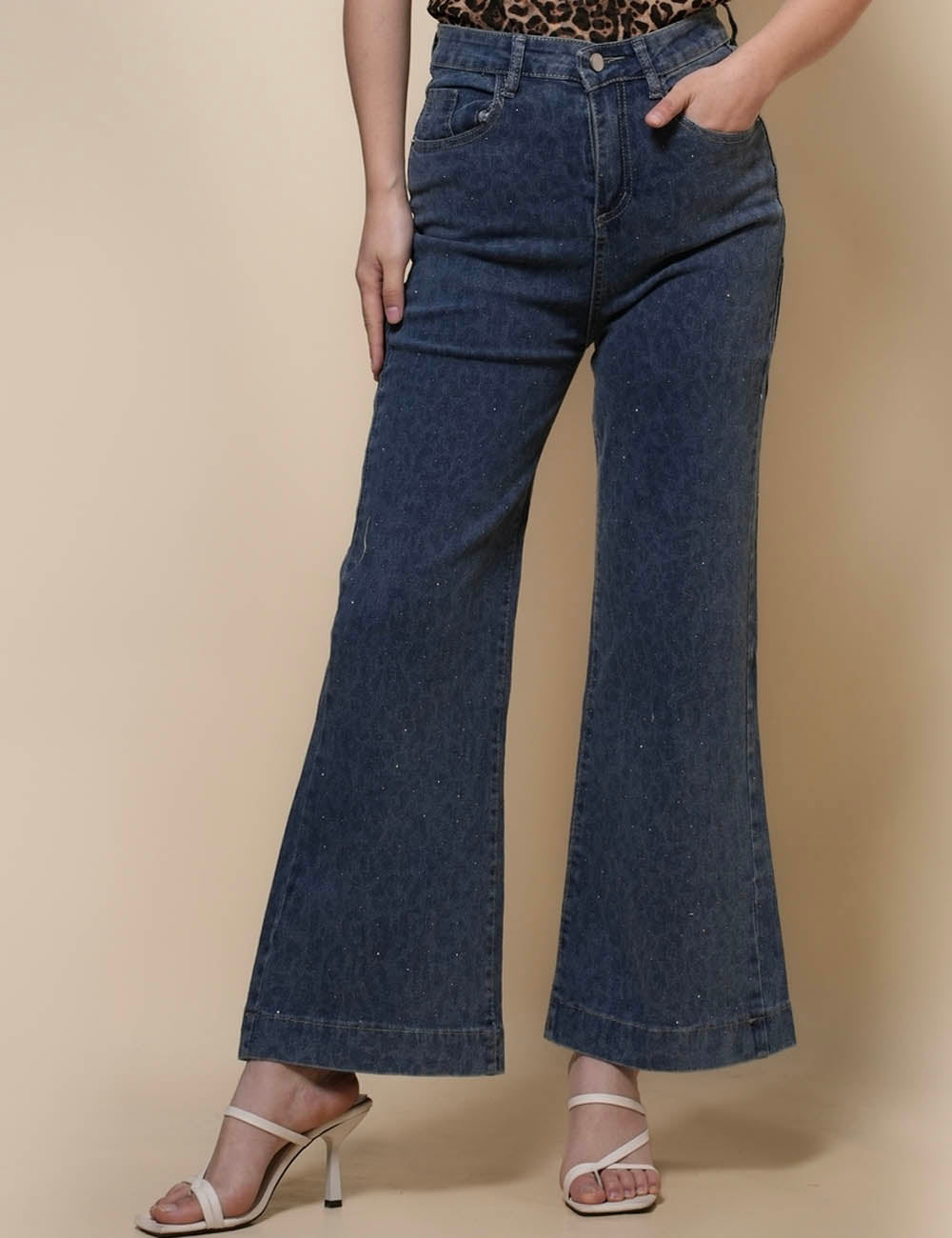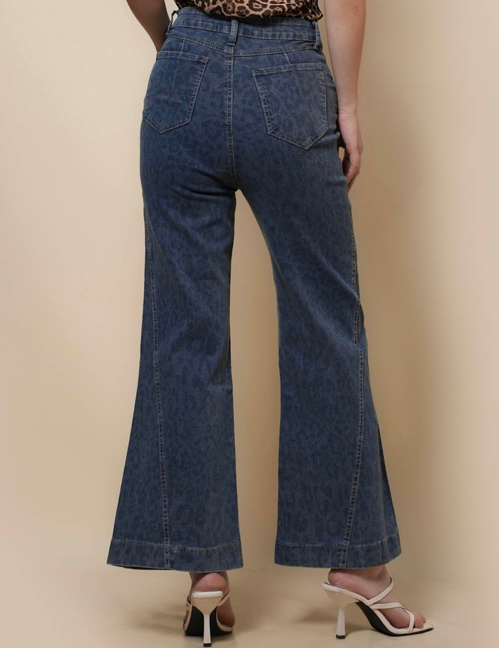 Ladies Leopard Print Pocket Wide Leg Demin Pants