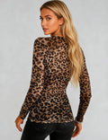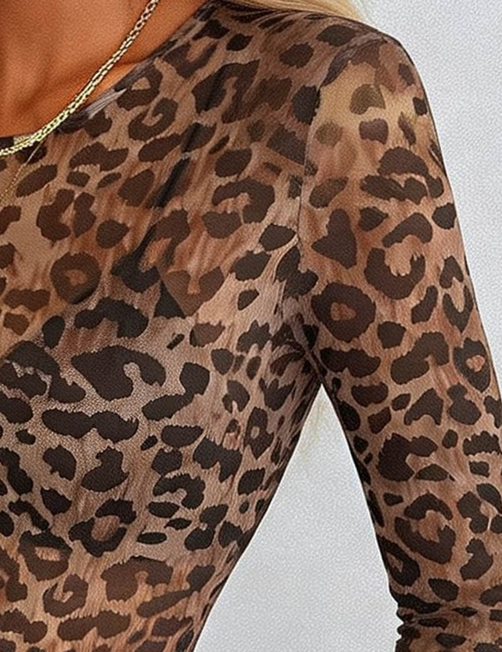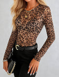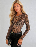 Ladies Leopard Print Round Neck Sheer Mesh Top