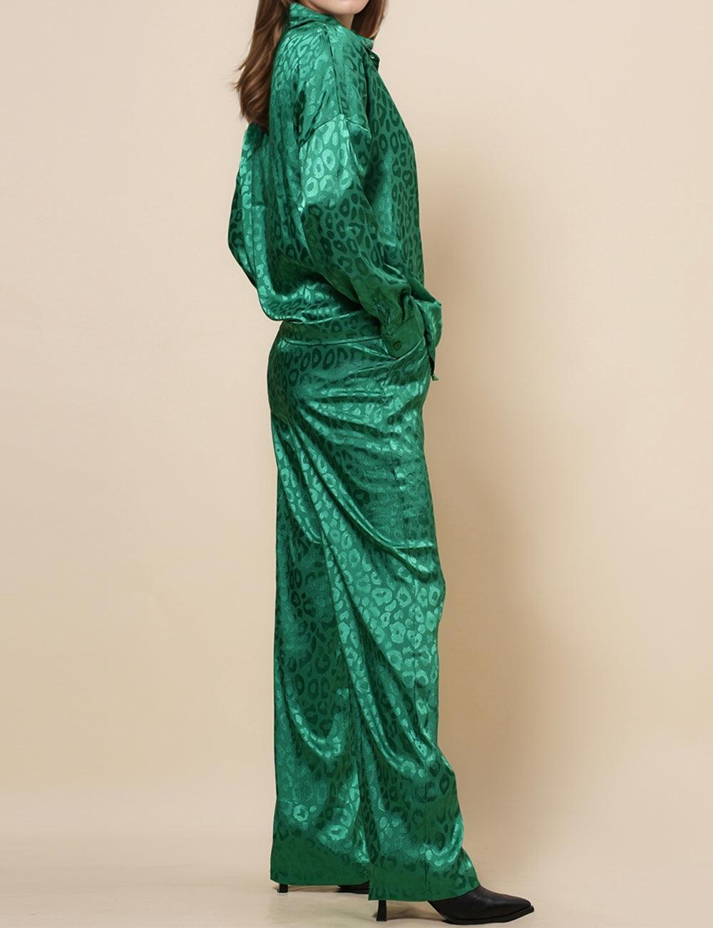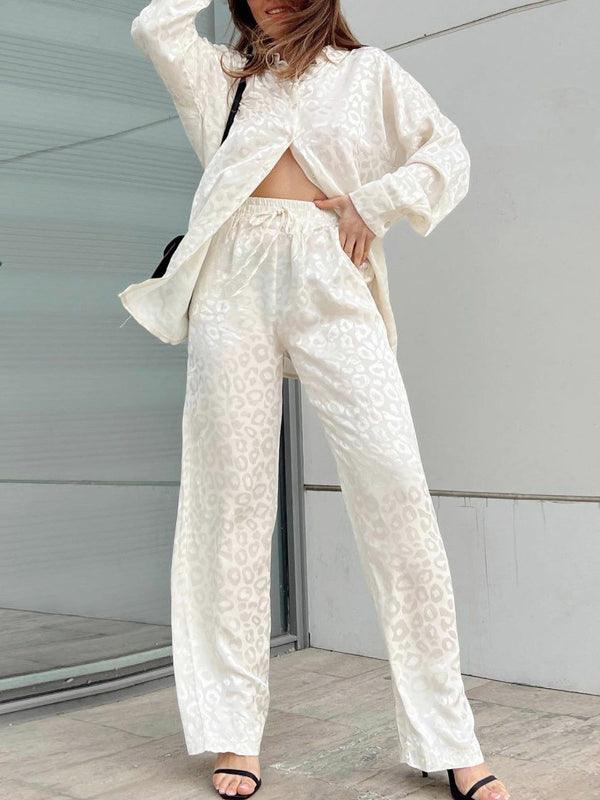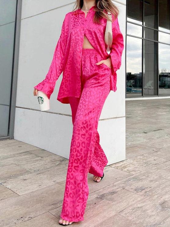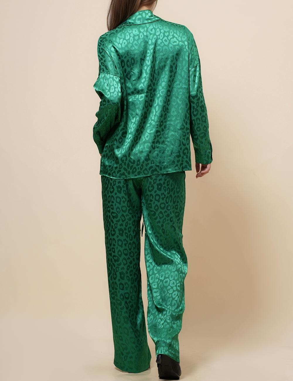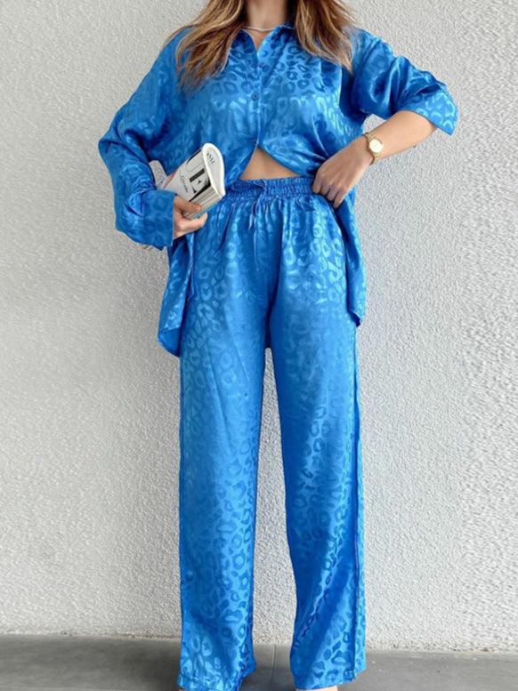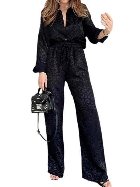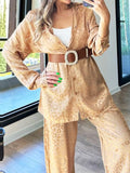 Ladies Leopard Satin Trundown Collar 2PCS Pants Set SKST4960