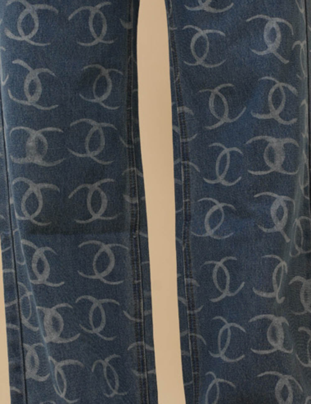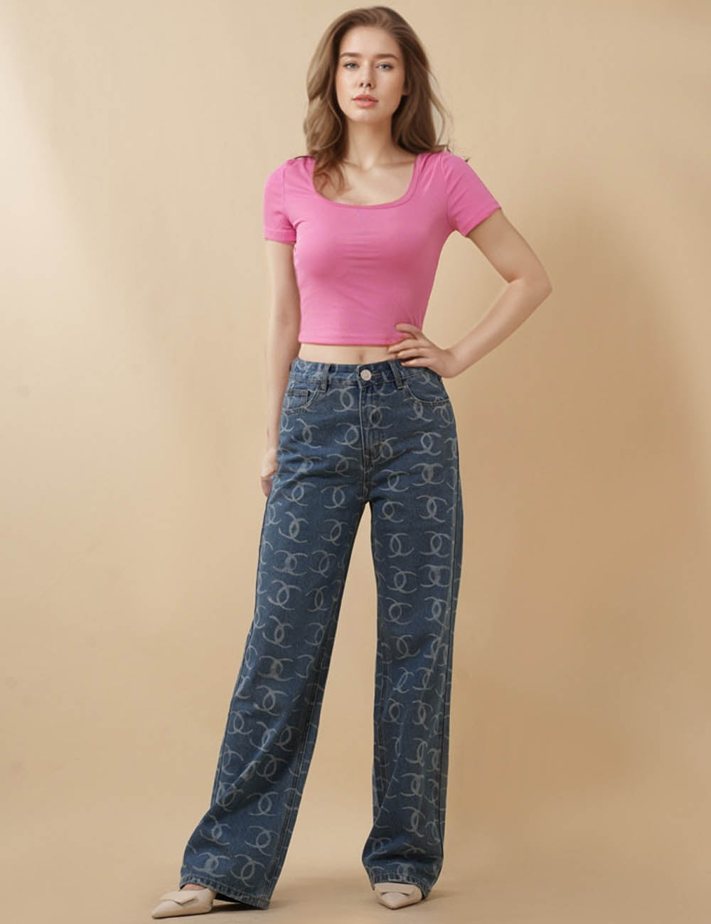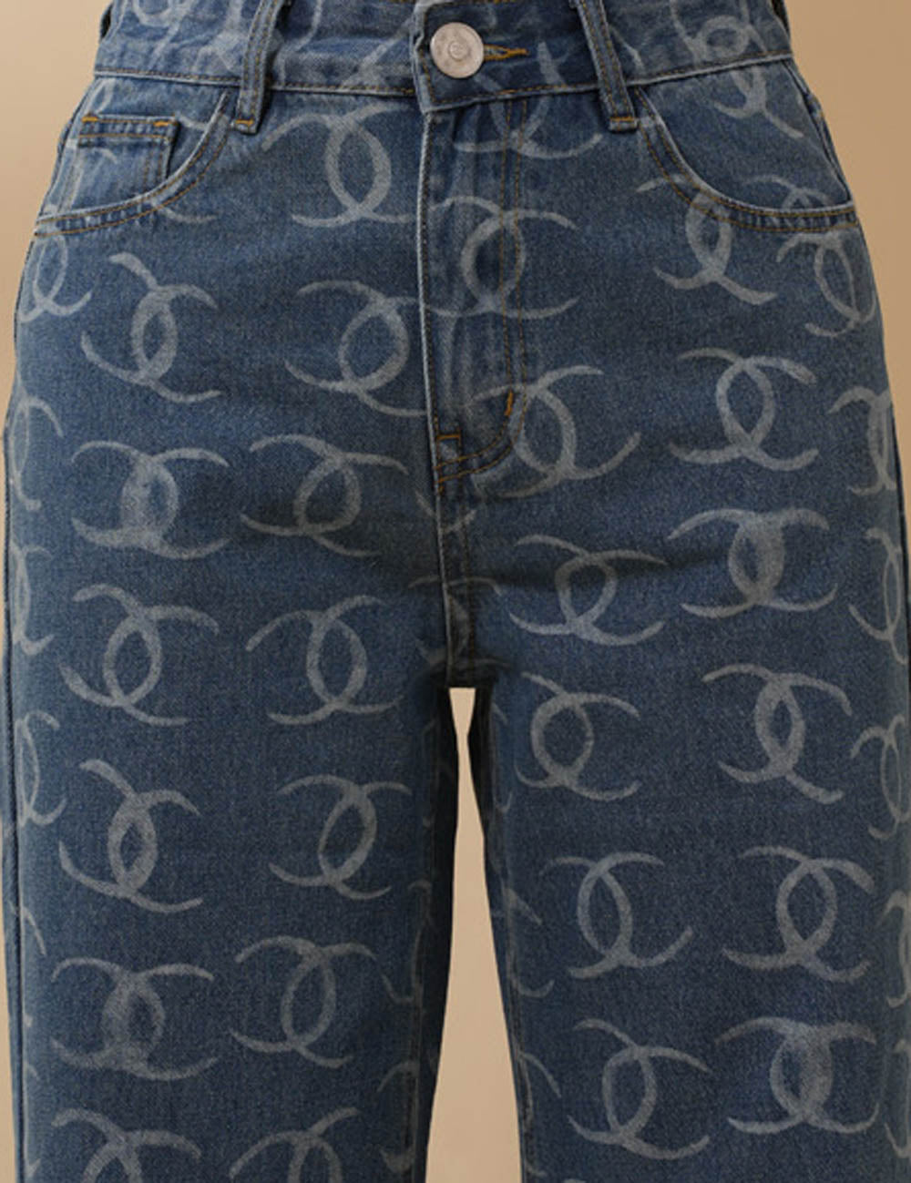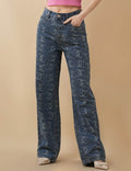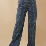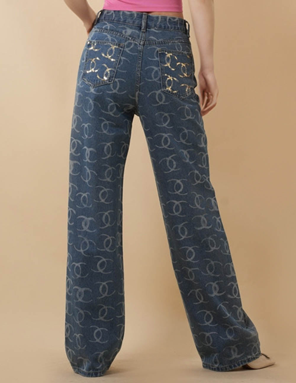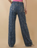 Ladies Letter Print Color Block Glitter Straight Leg Denim Pants