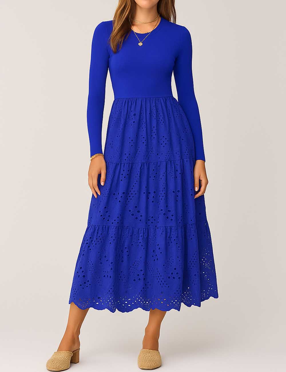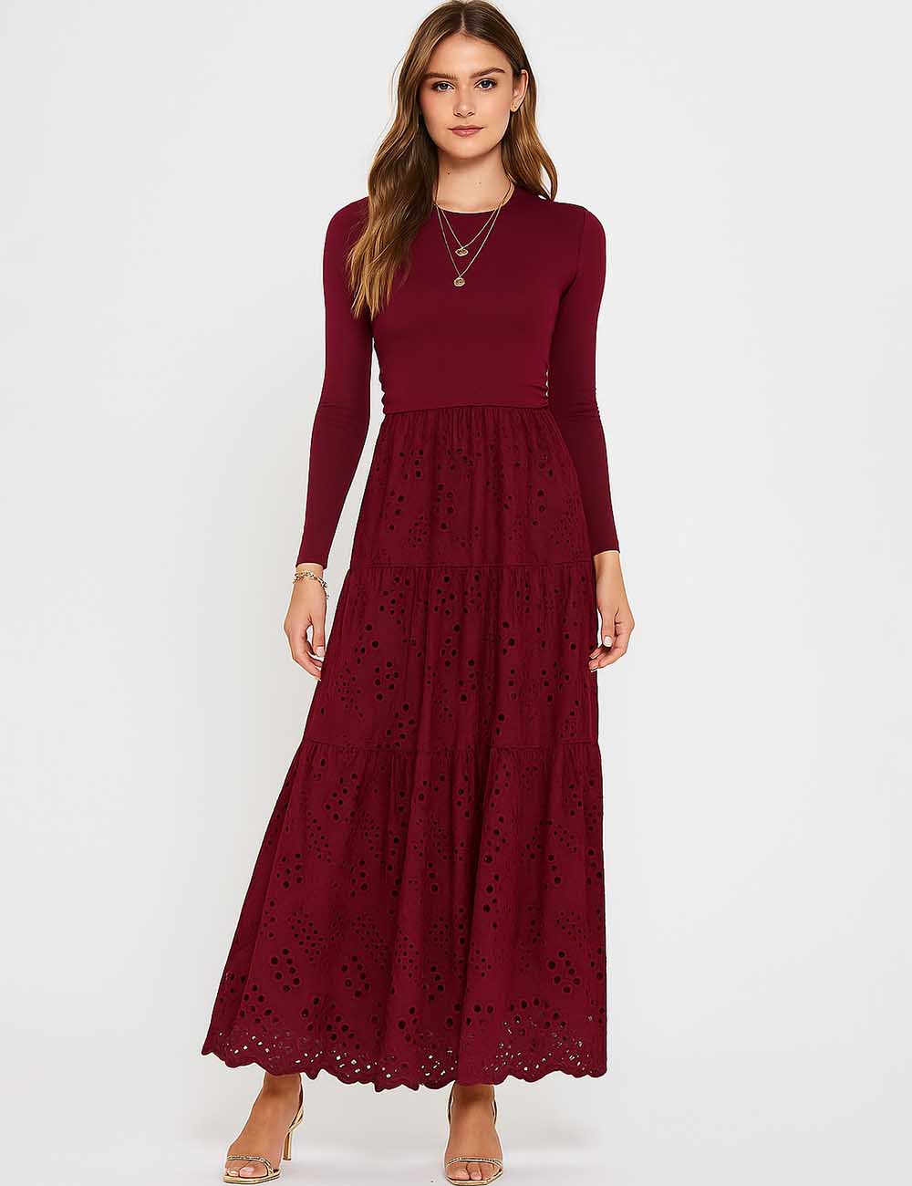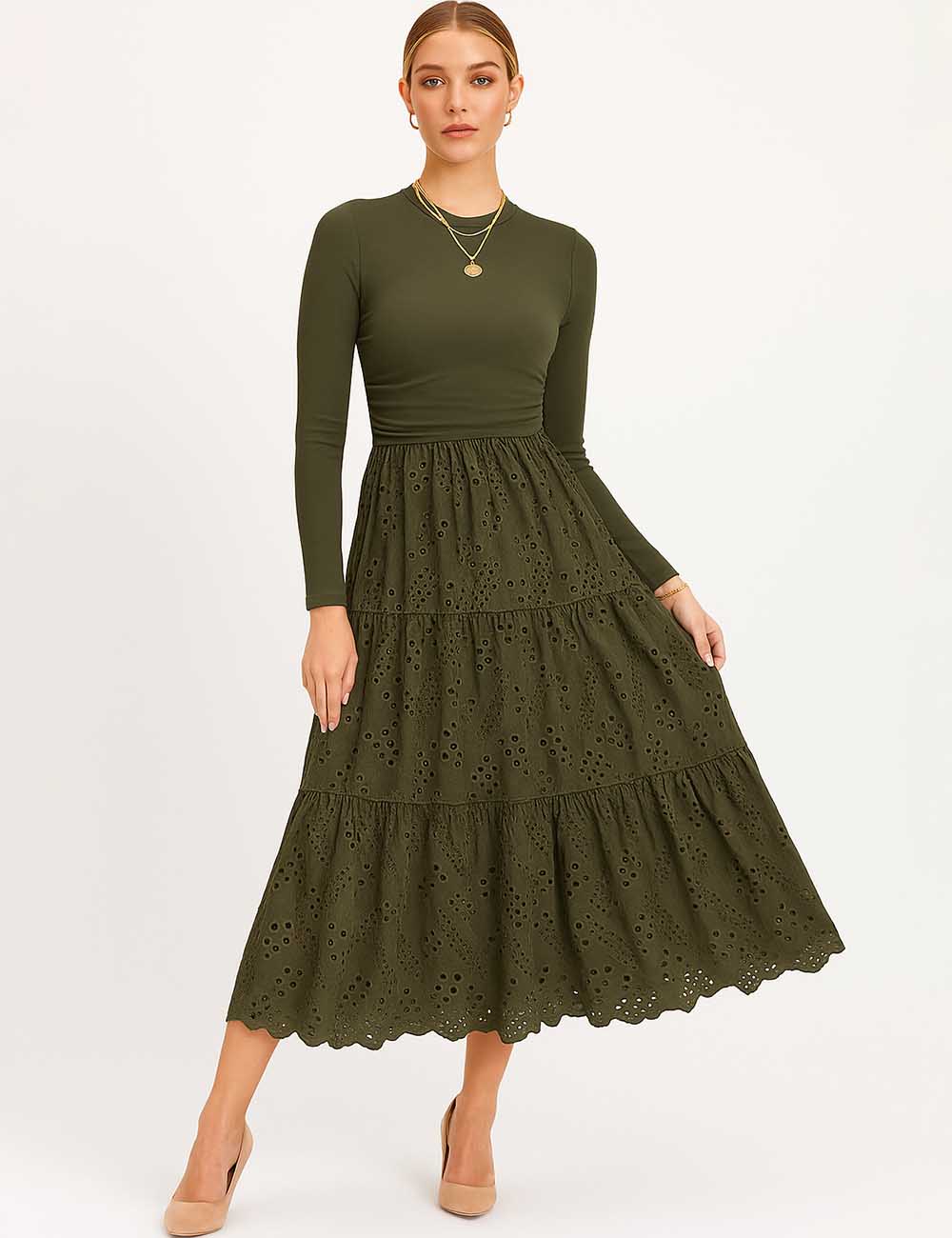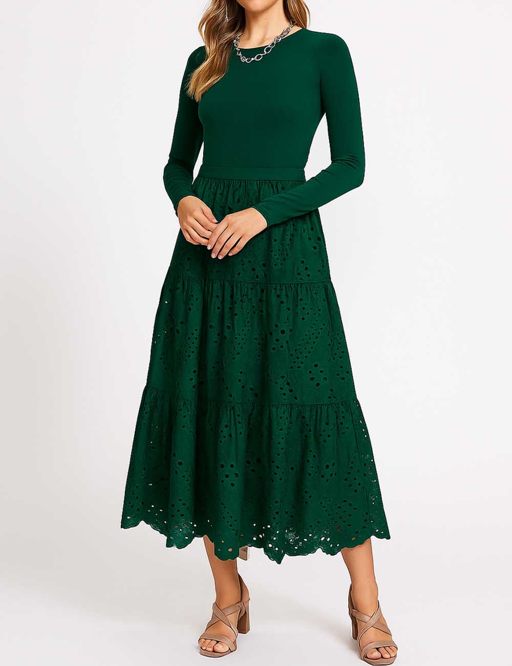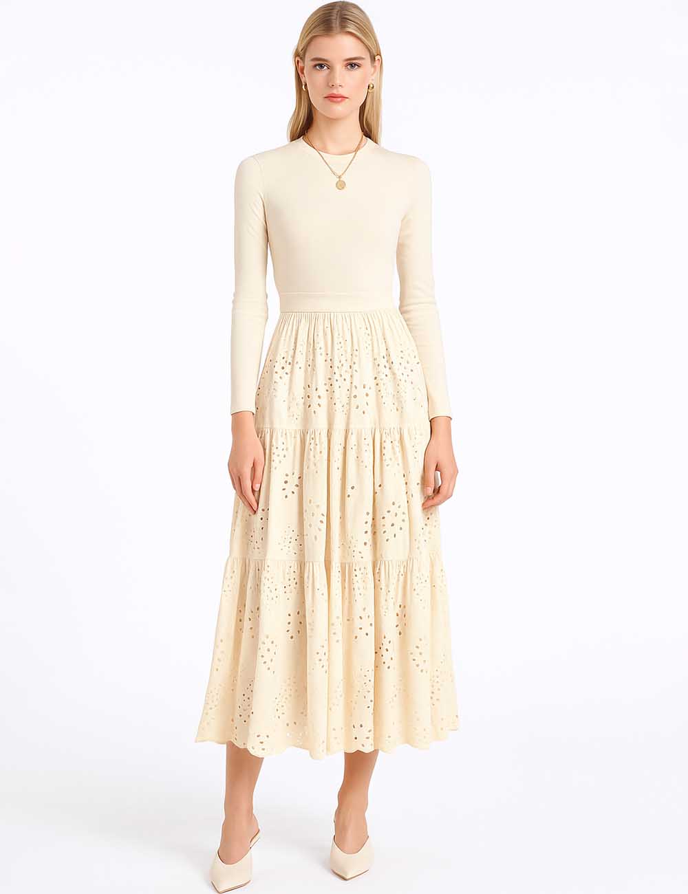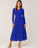 Ladies Mock Neck Eyelet Long Sleeves Midi Dress