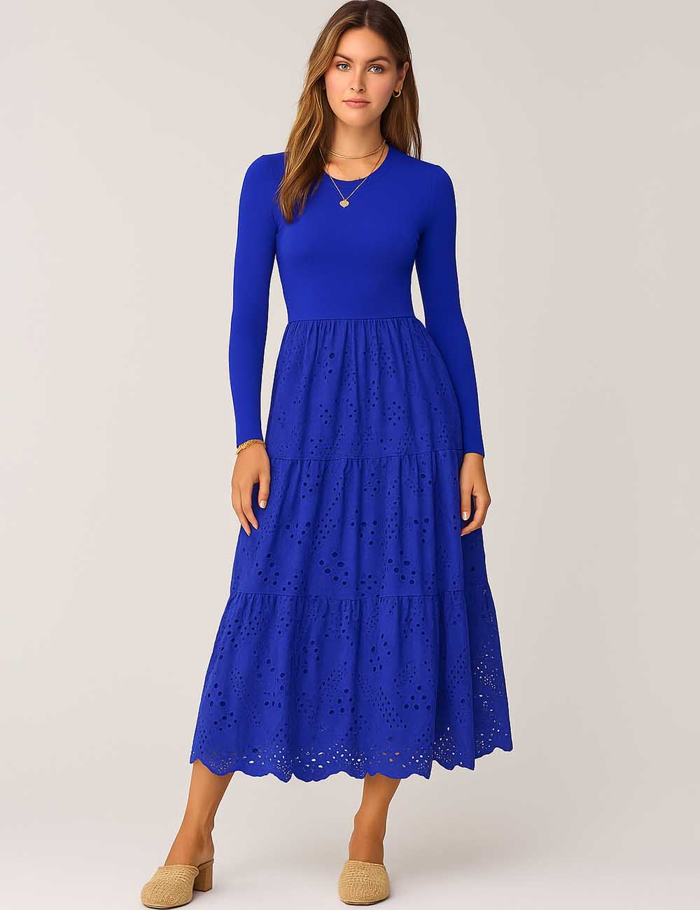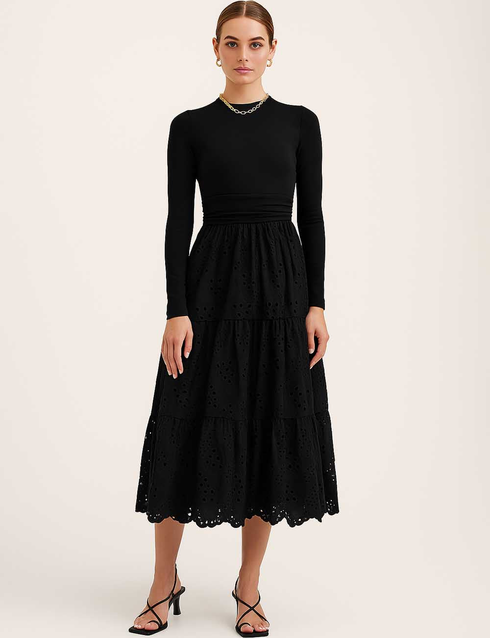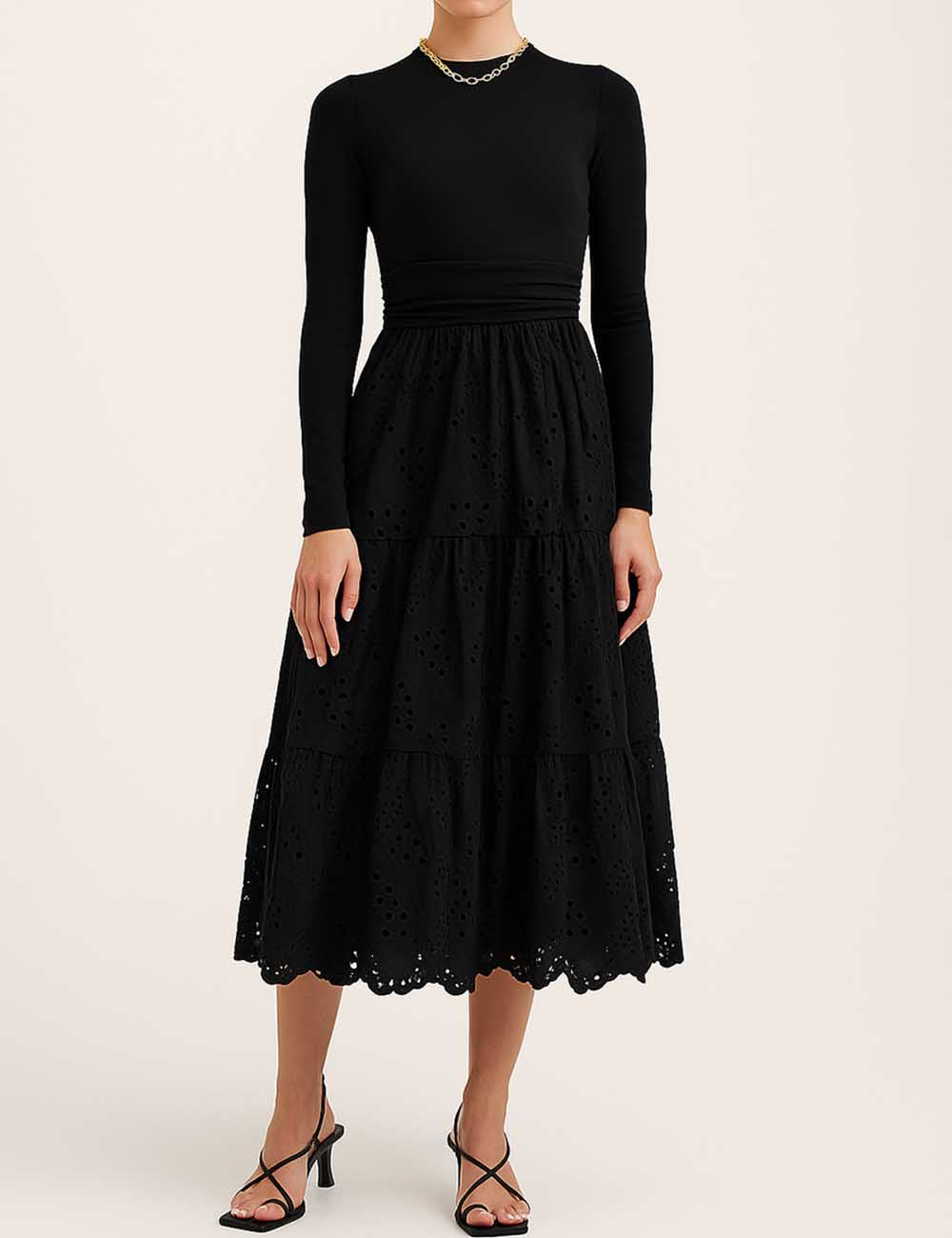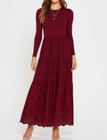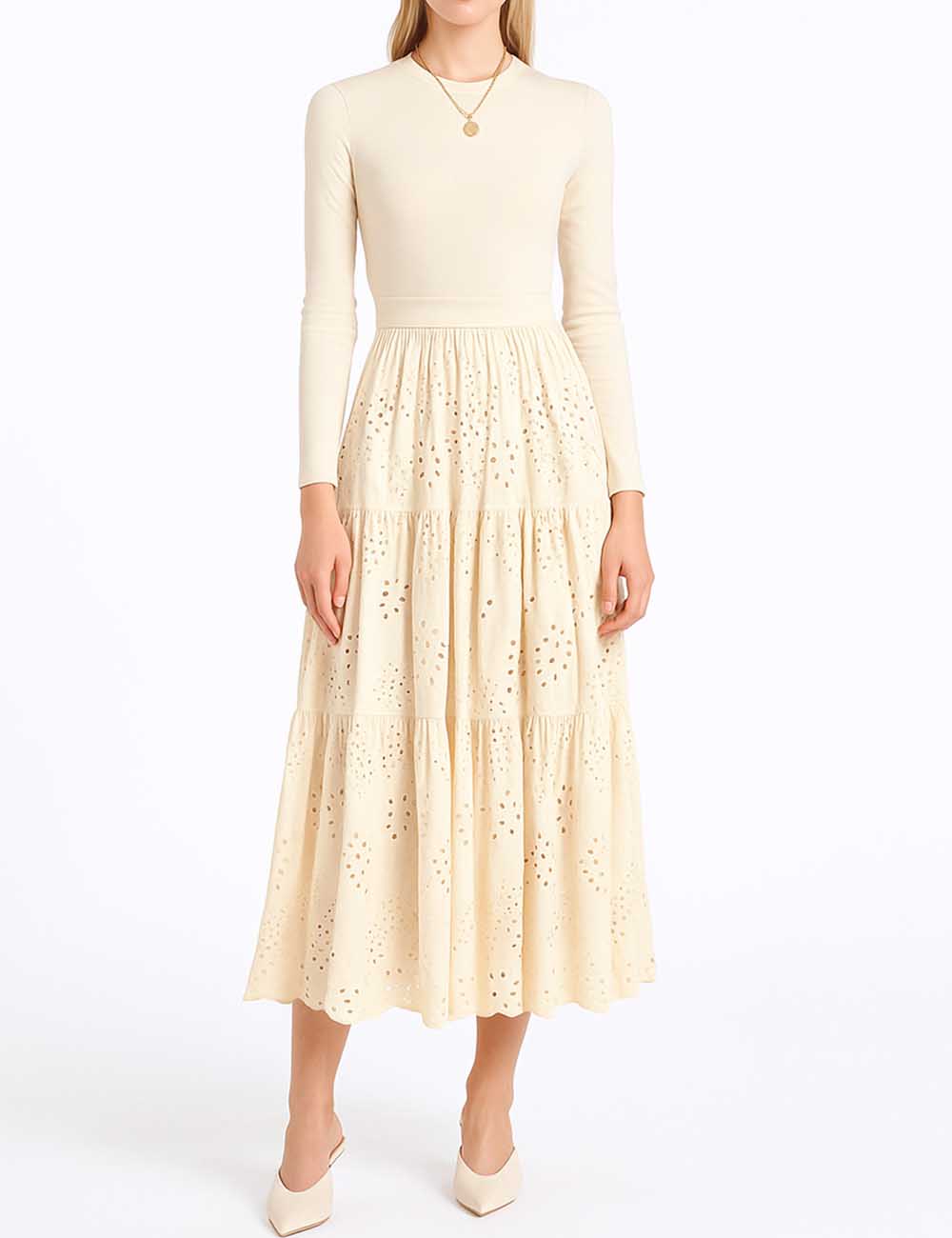 Ladies Mock Neck Eyelet Long Sleeves Midi Dress