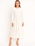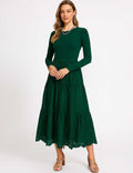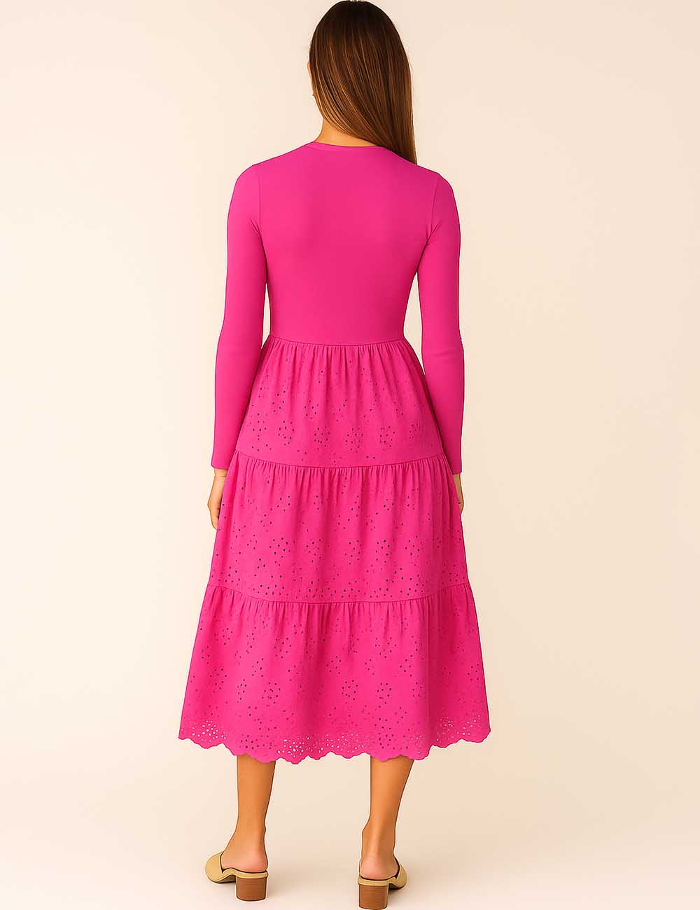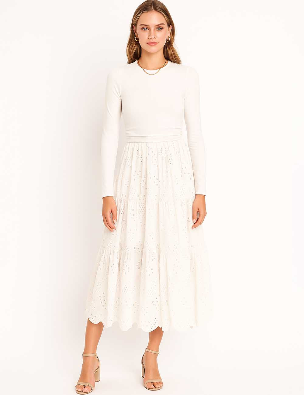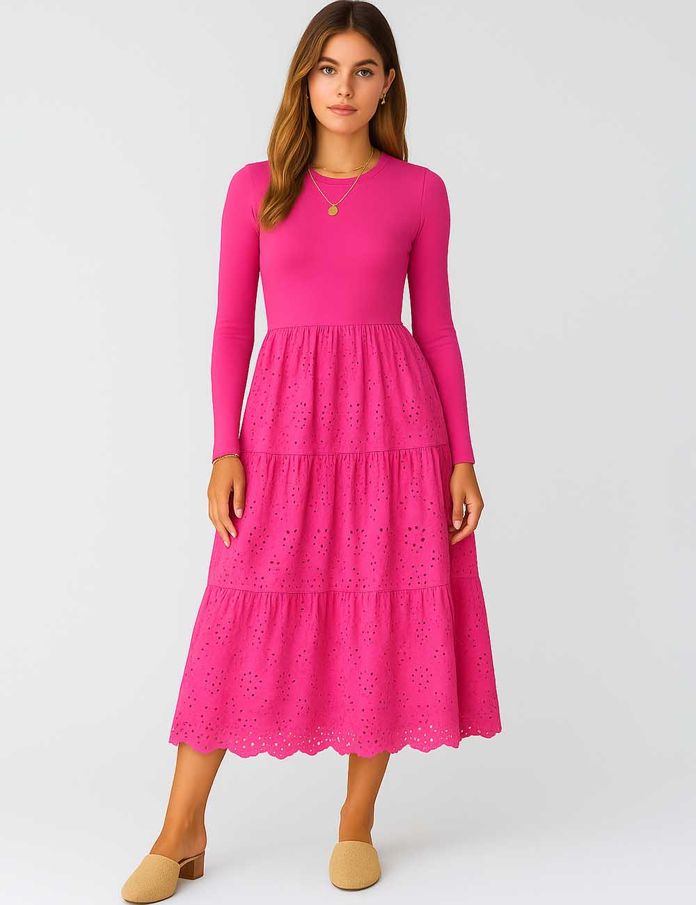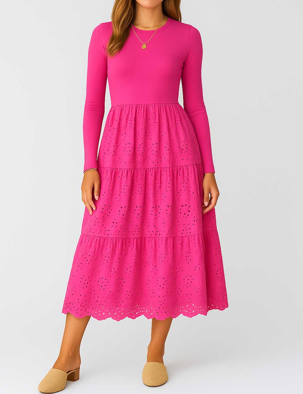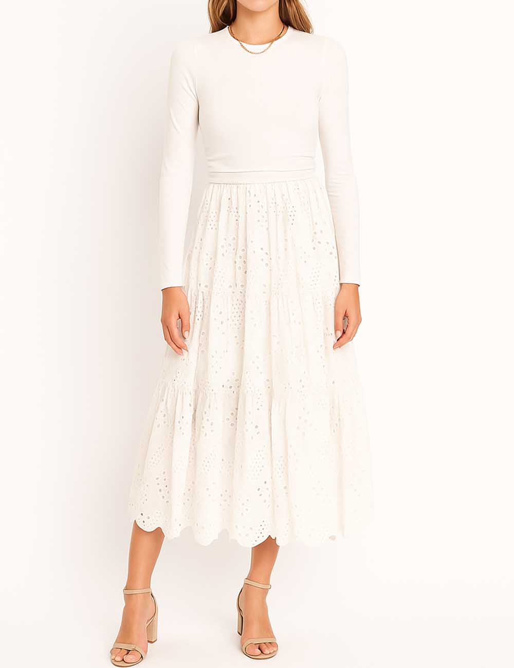 Ladies Mock Neck Eyelet Long Sleeves Midi Dress