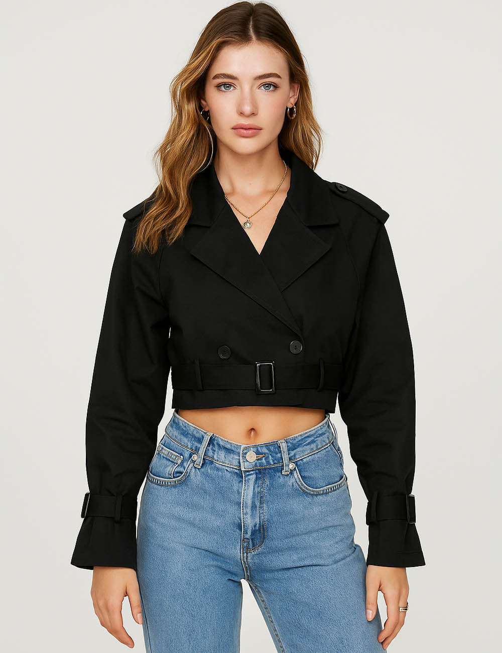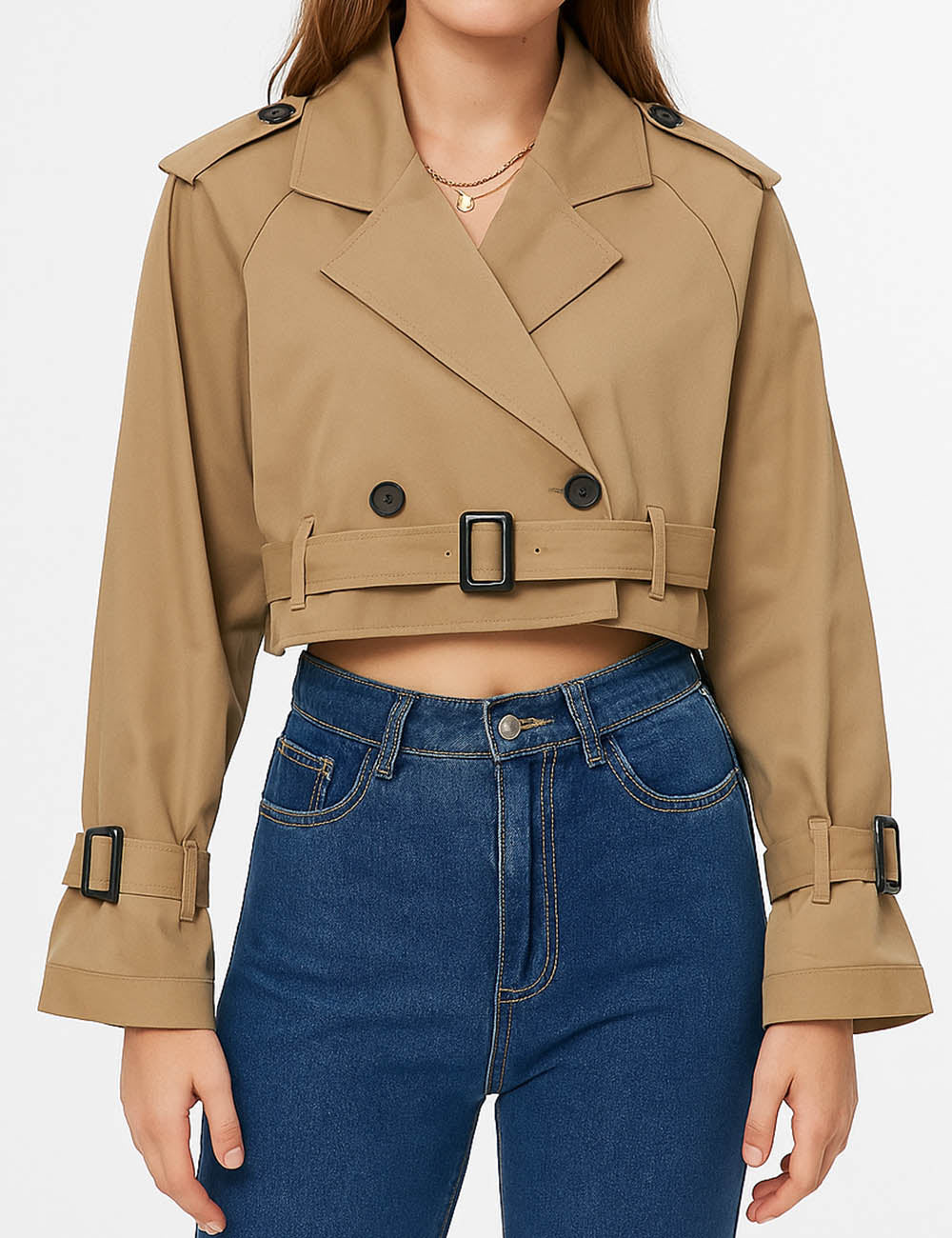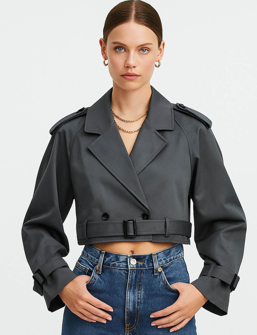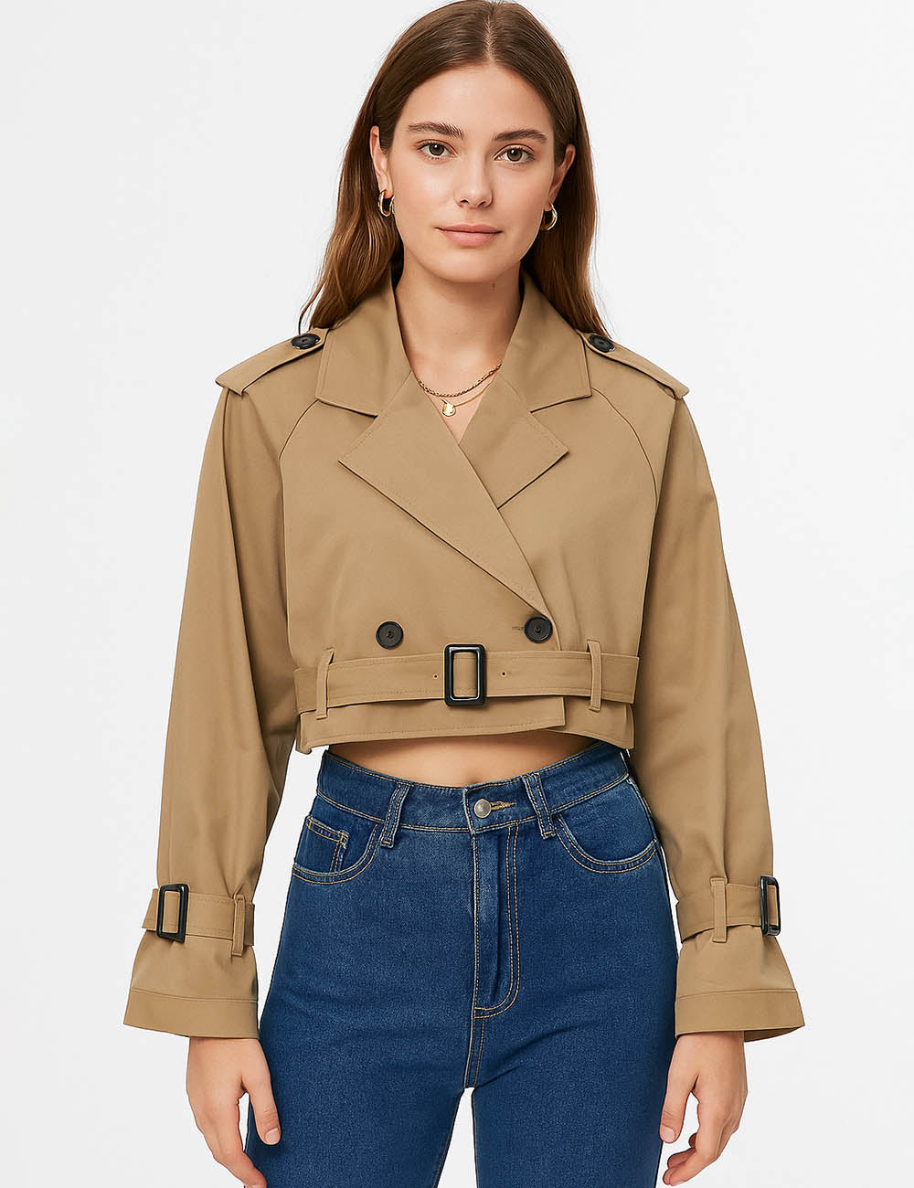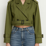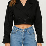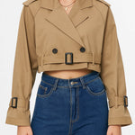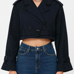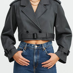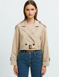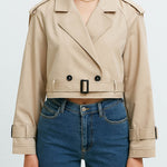 Ladies Notched Lapel Belted Long Sleeves Cropped Trench Jacket