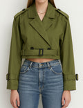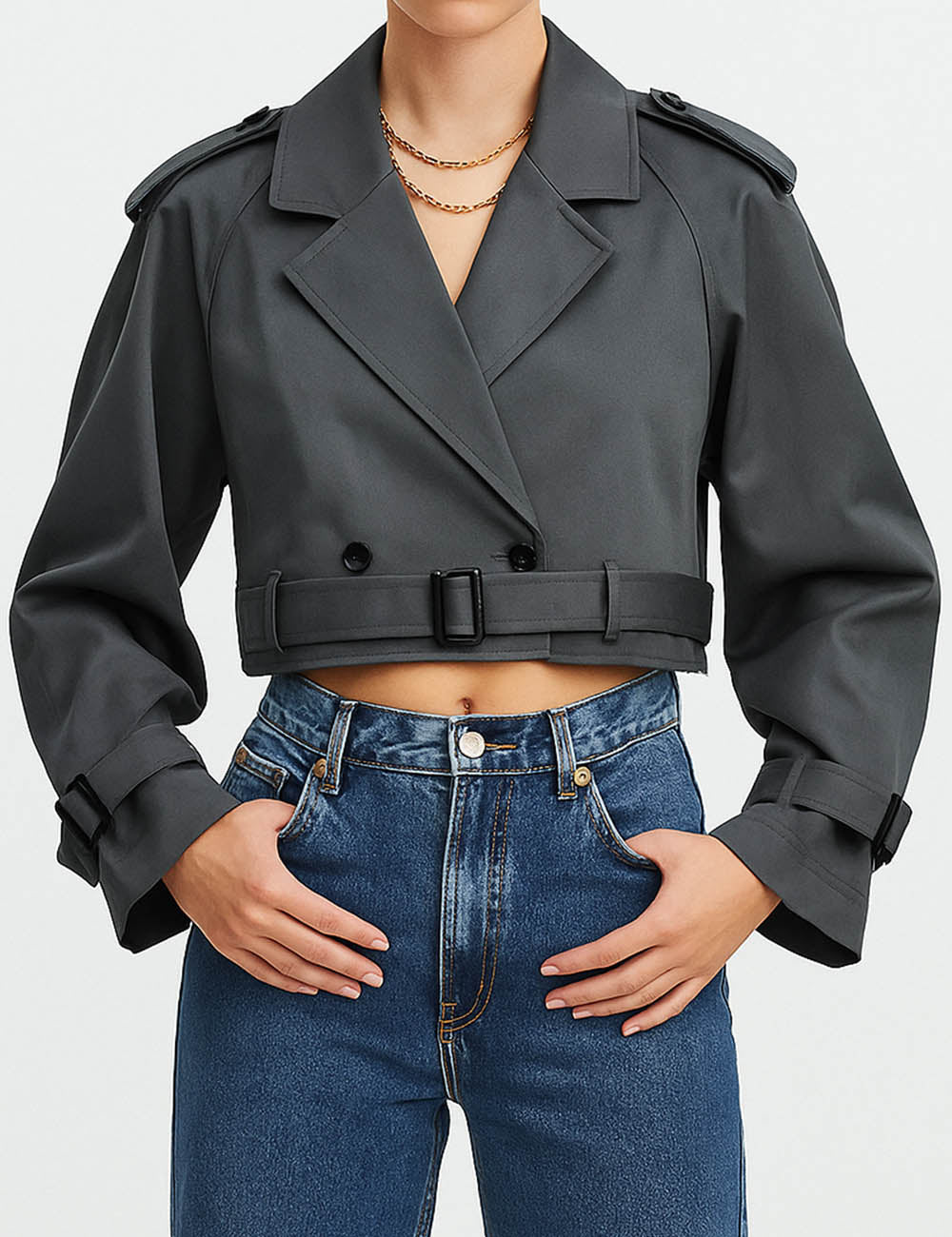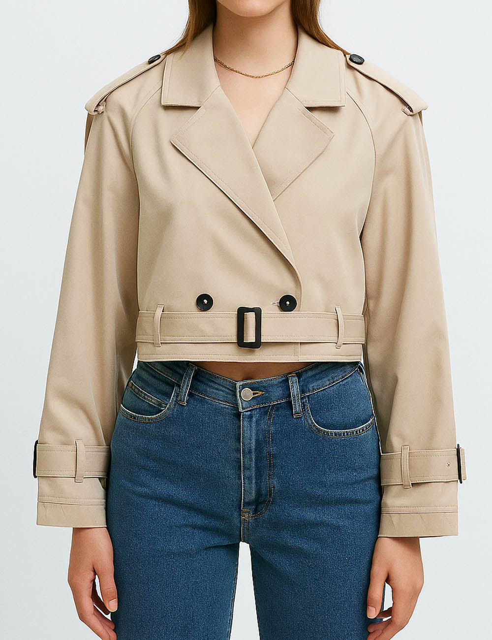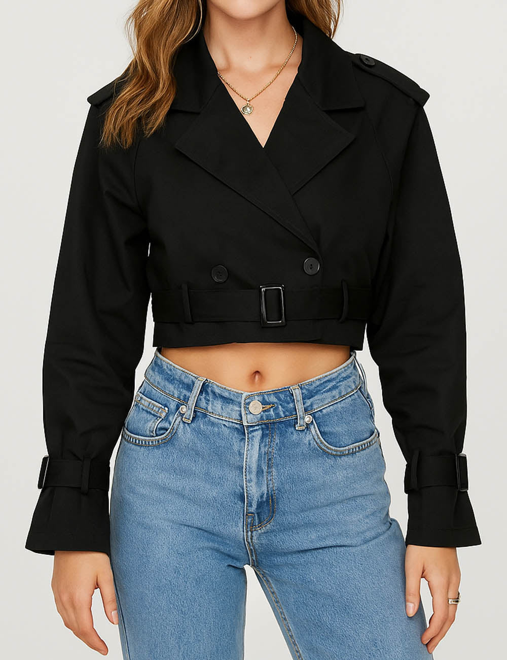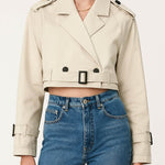 Ladies Notched Lapel Belted Long Sleeves Cropped Trench Jacket