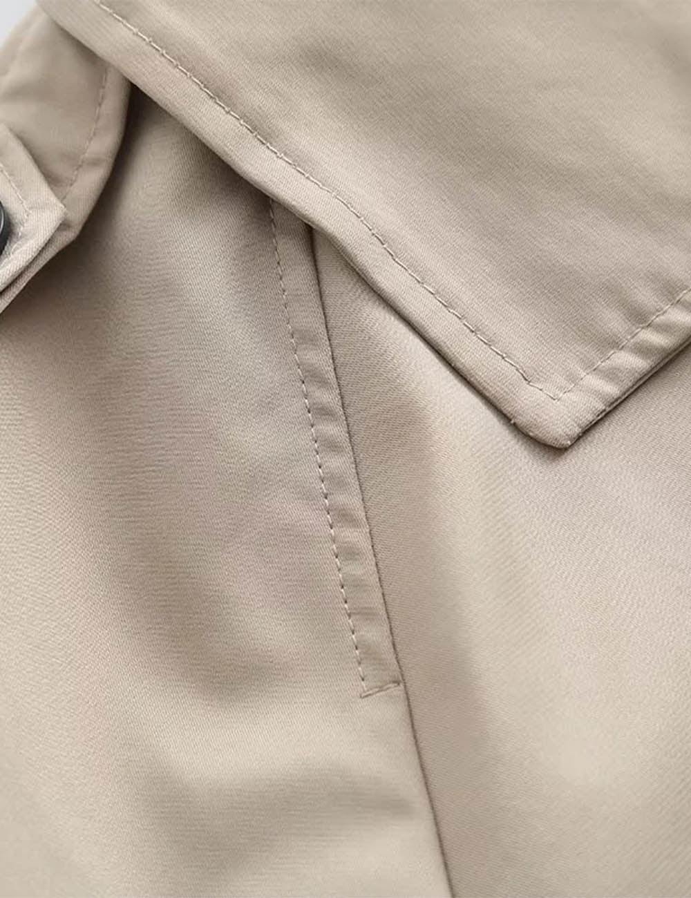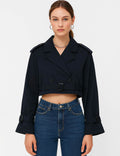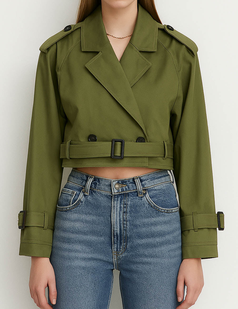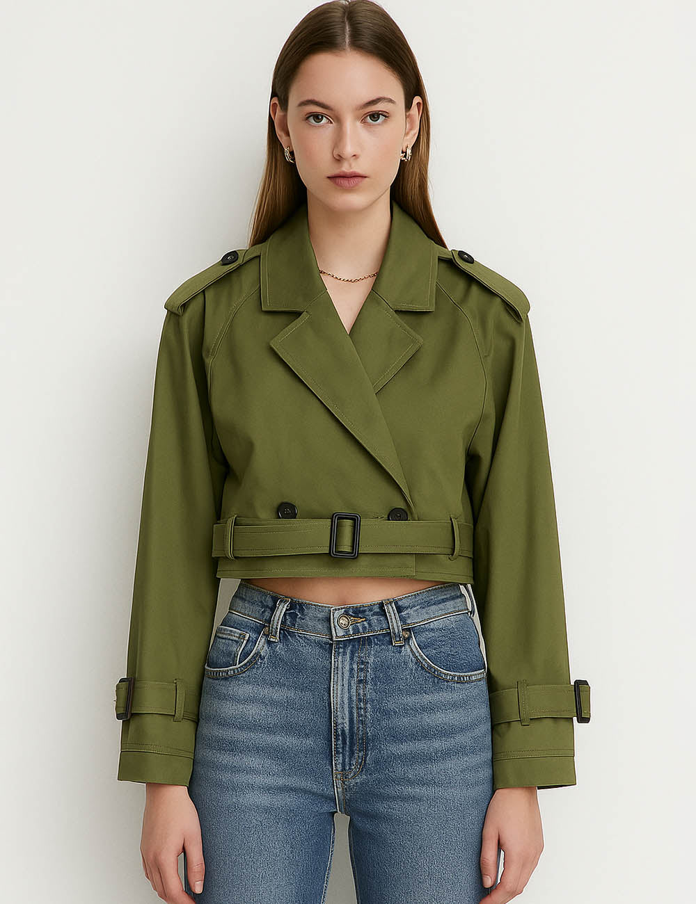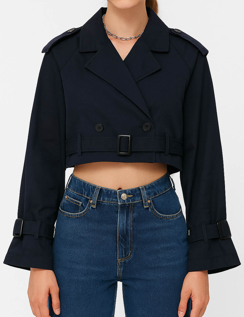 Ladies Notched Lapel Belted Long Sleeves Cropped Trench Jacket