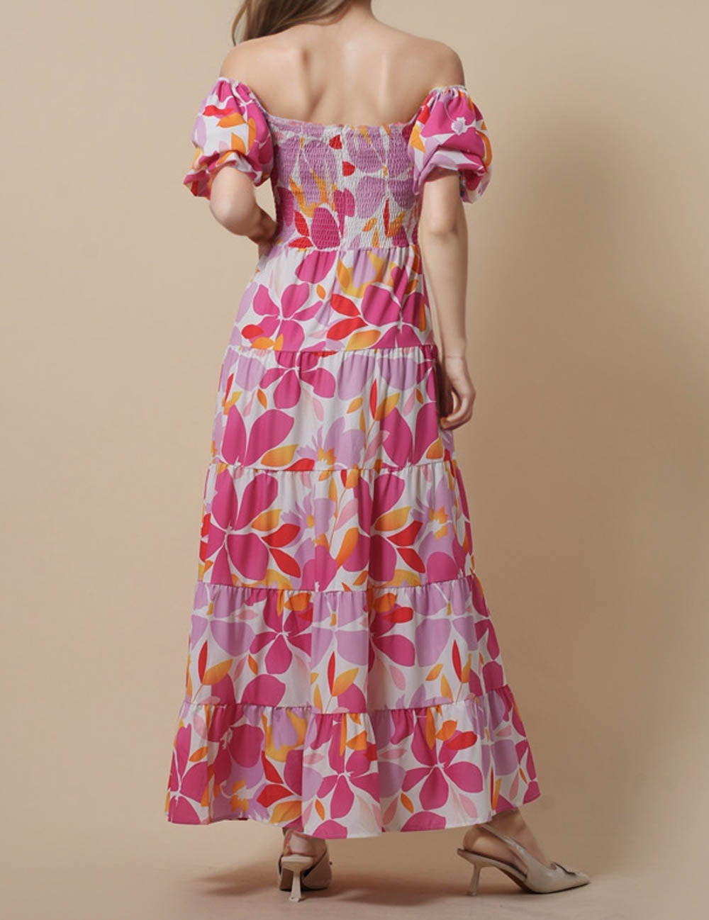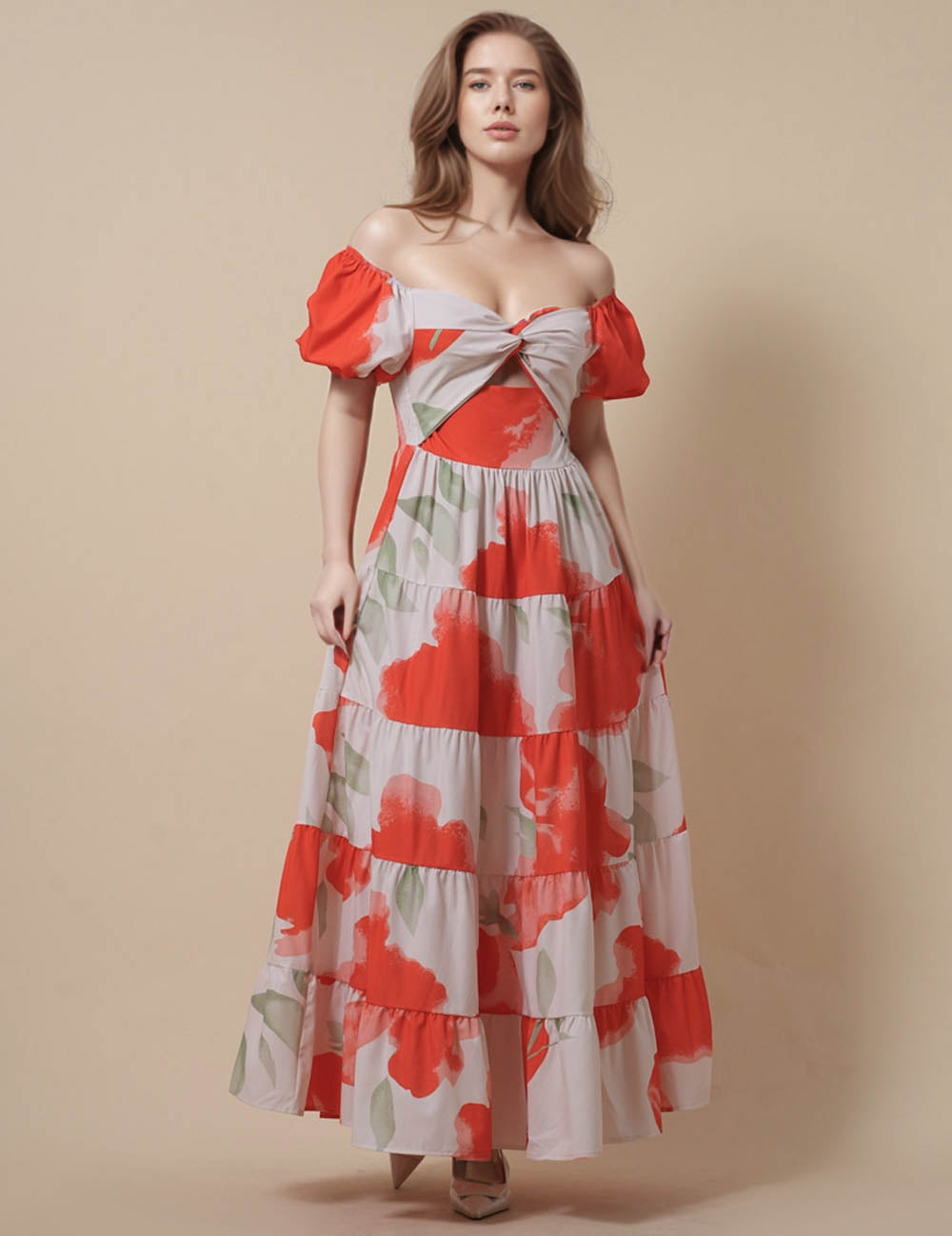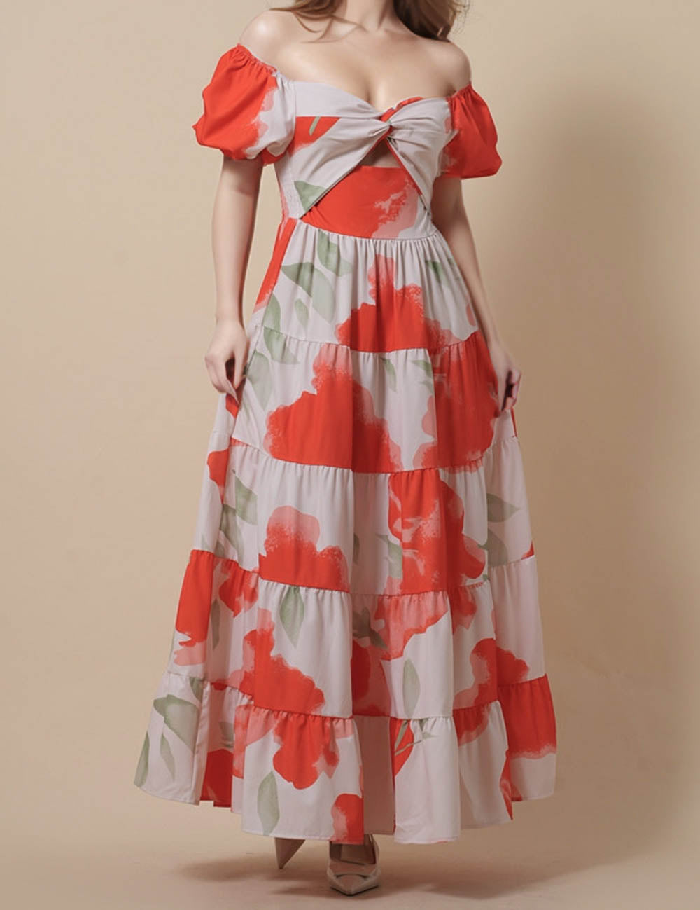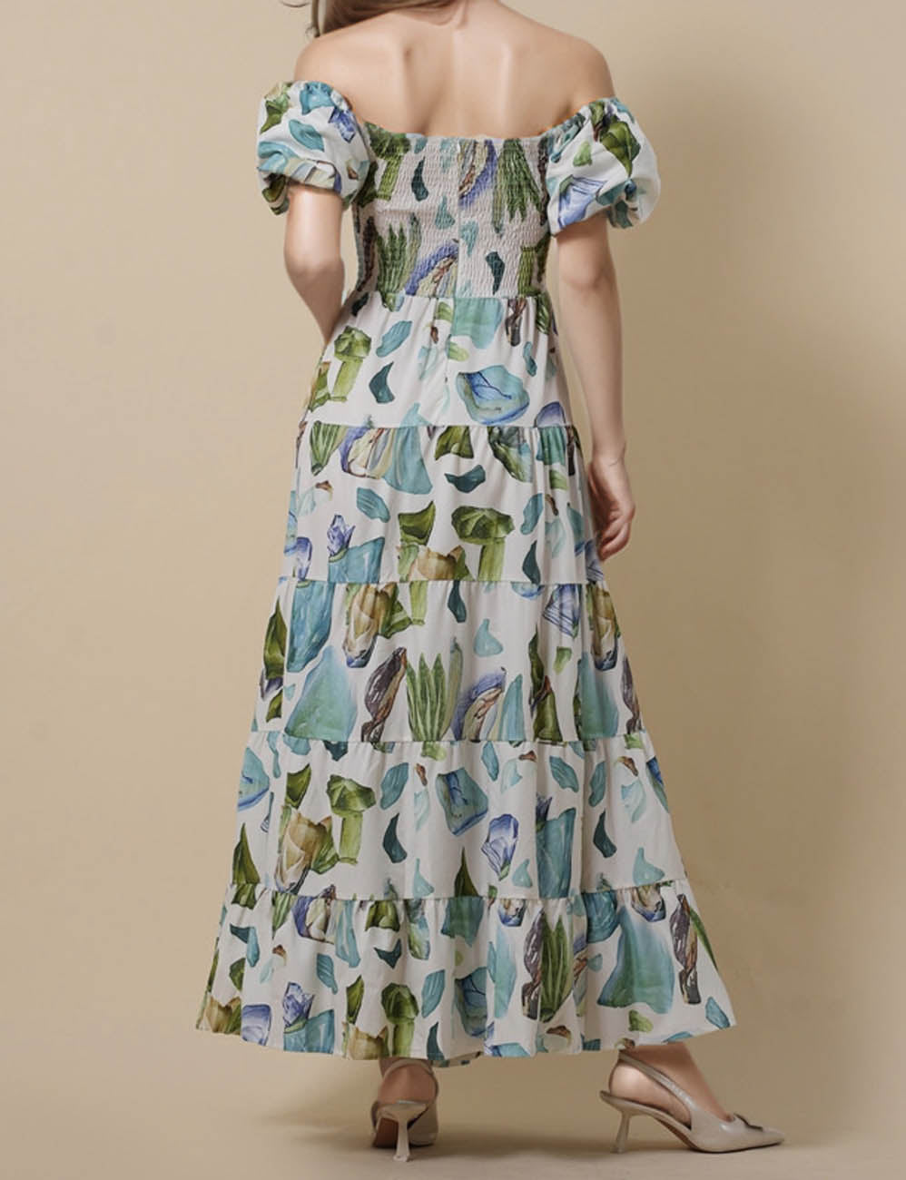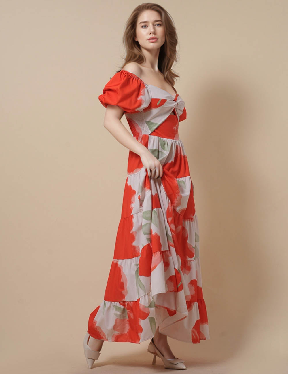 Ladies Off-Shoulder Puff Sleeves Floral Print Maxi Dress SKD51118