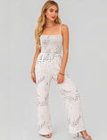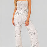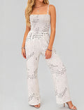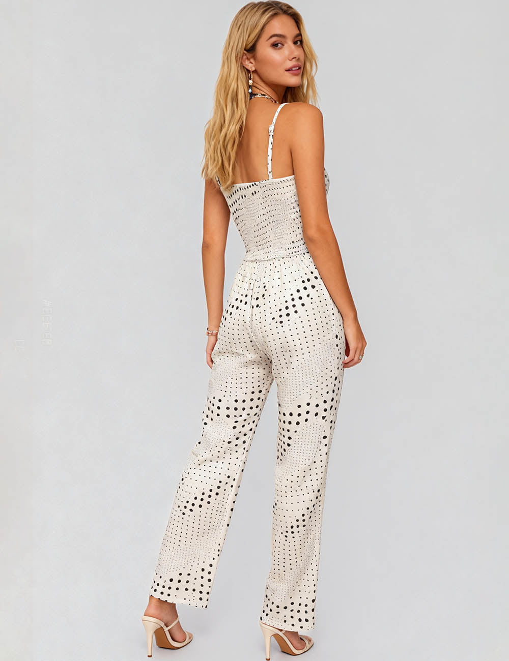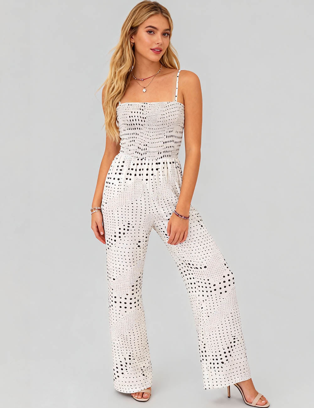 Ladies Polka Dot Smocked Bodice Wide Leg Jumpsuit