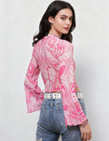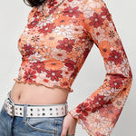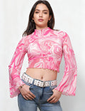 Ladies Print Flare Sleeves Mesh Crop Top SKT2417