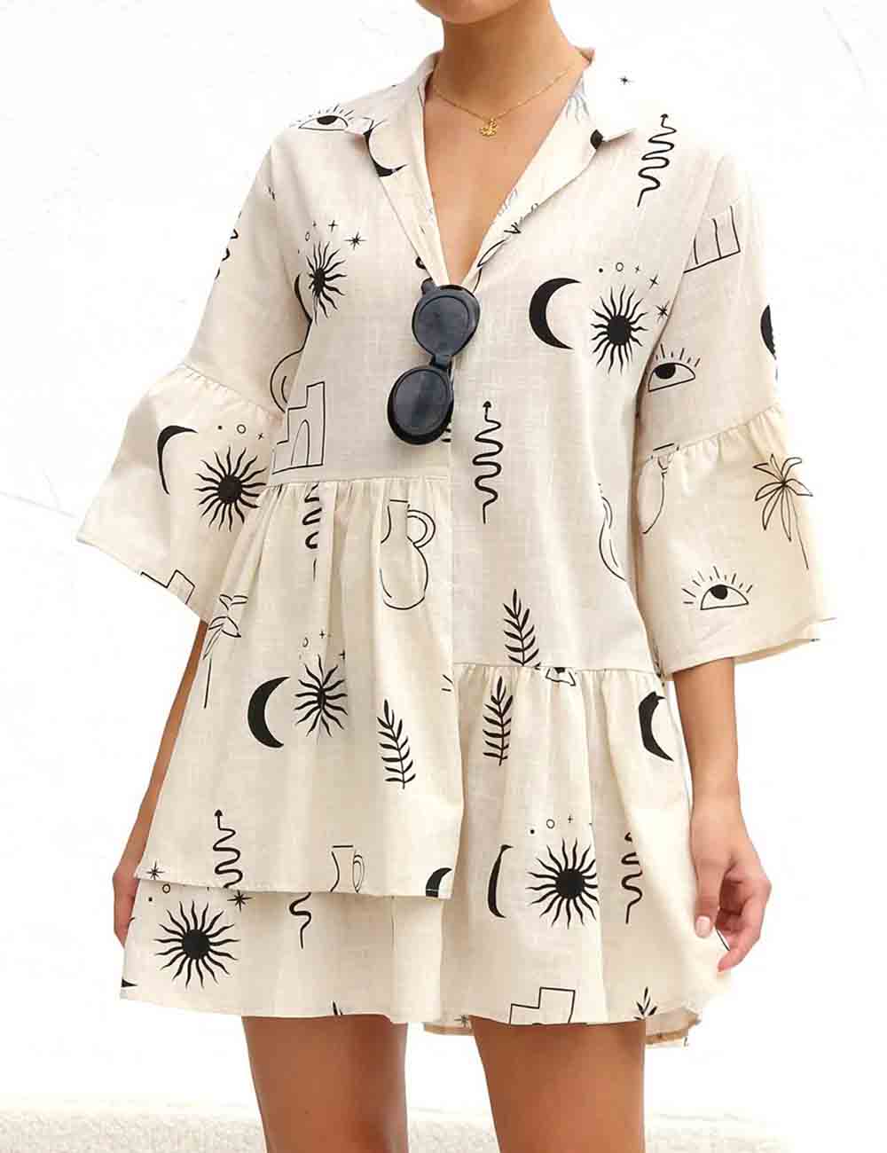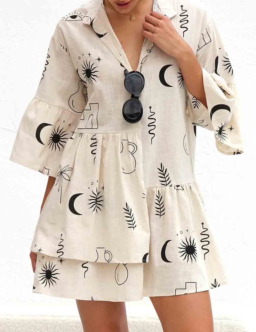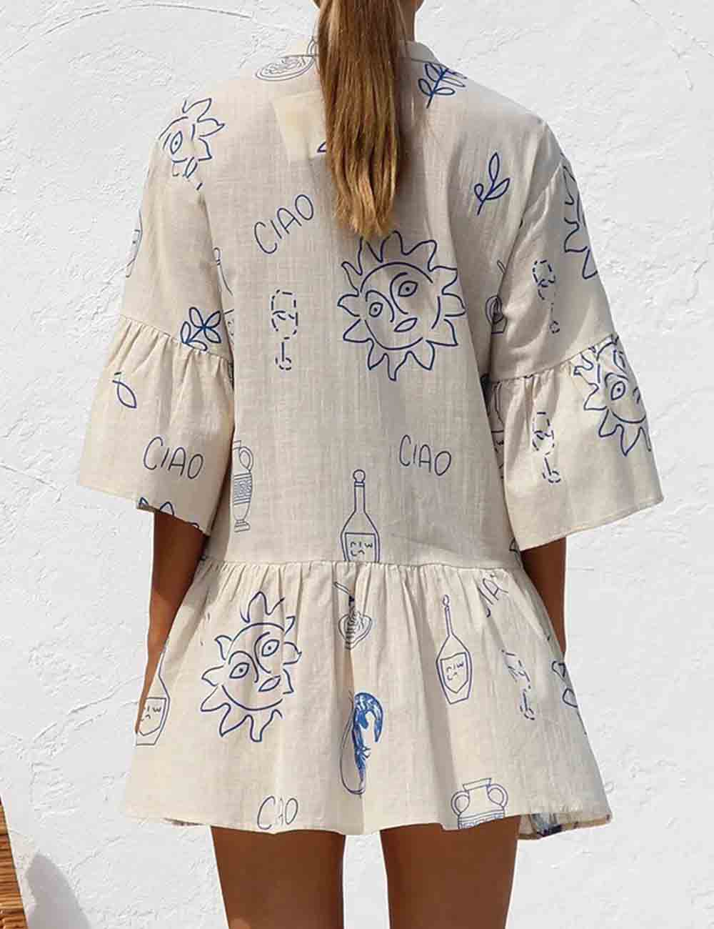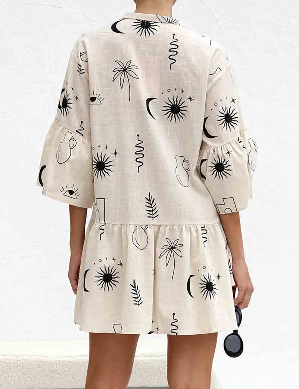 Ladies Print Gathering Turn-down Collar Mini Dress