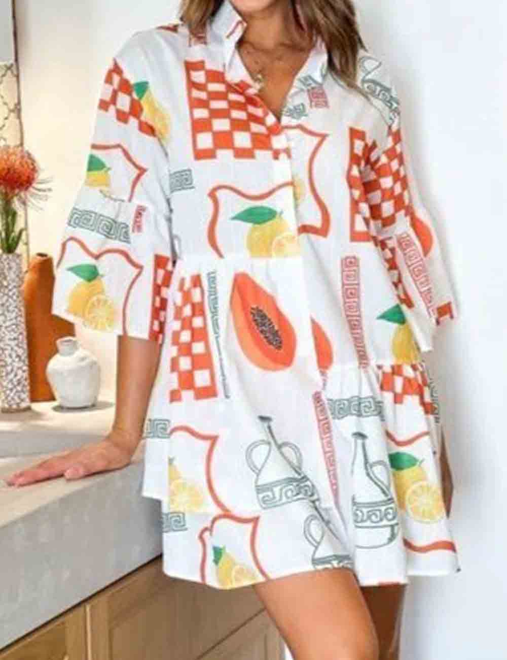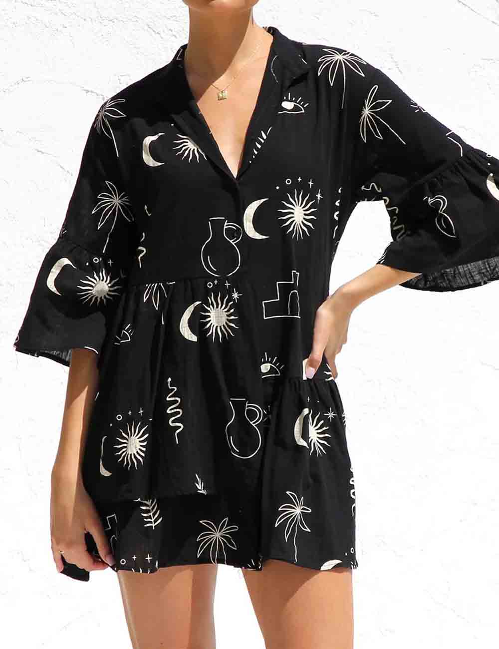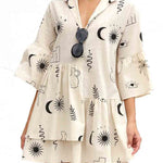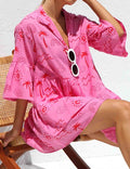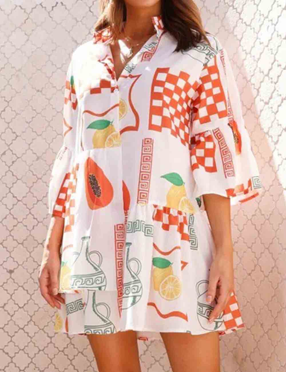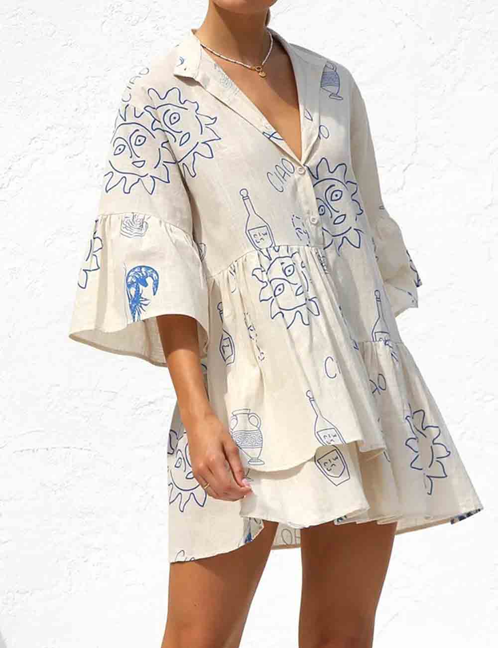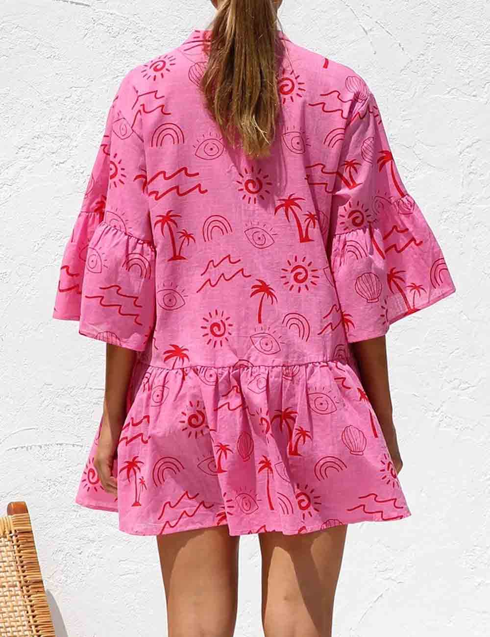 Ladies Print Gathering Turn-down Collar Mini Dress