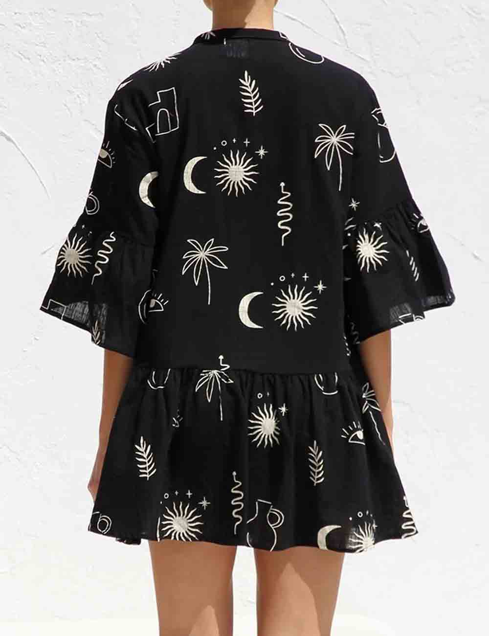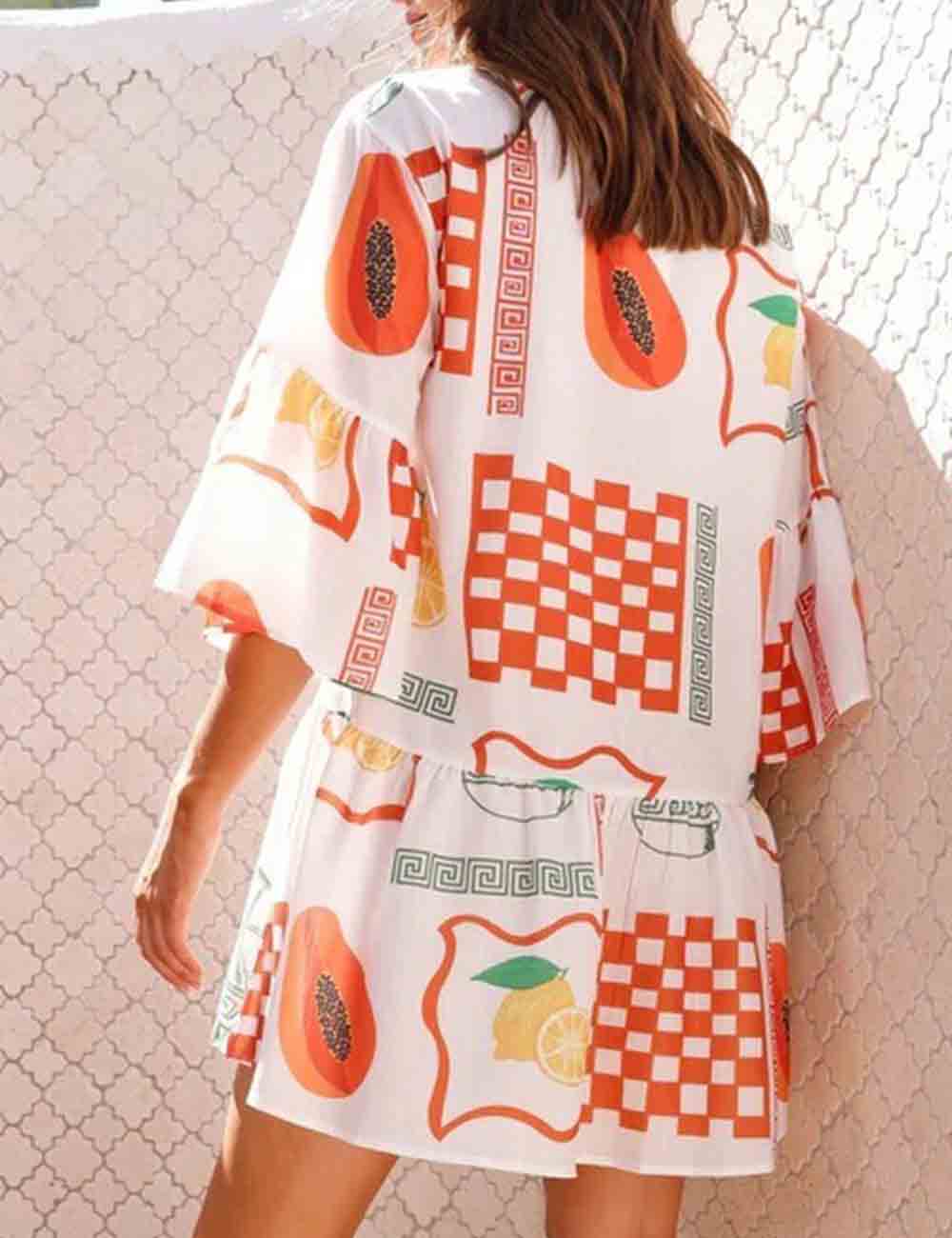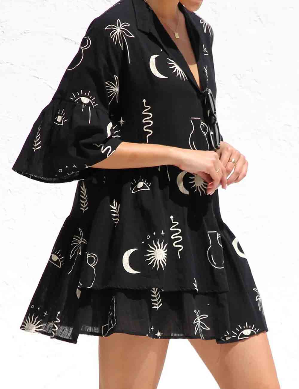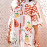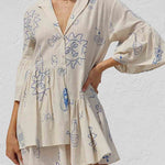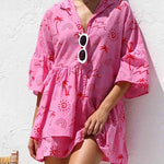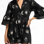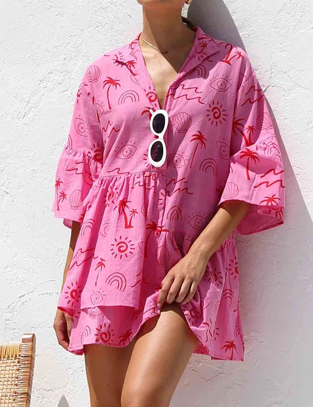 Ladies Print Gathering Turn-down Collar Mini Dress