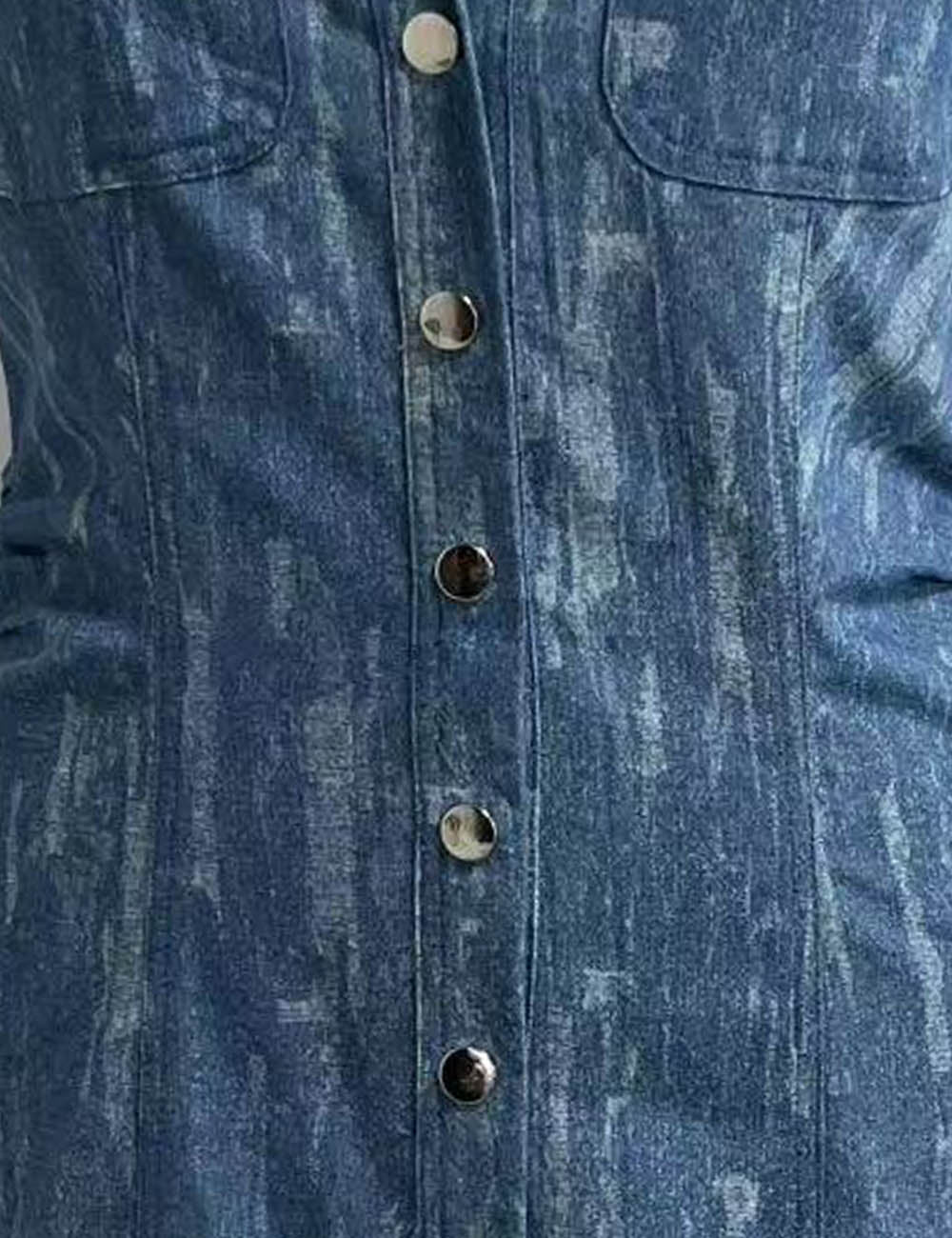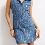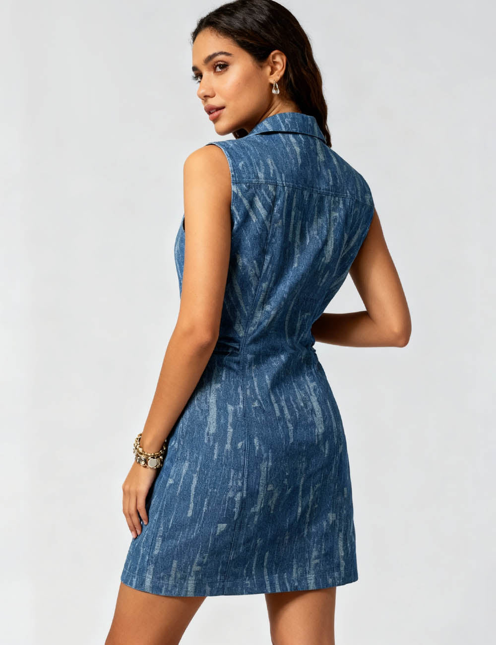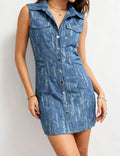 Ladies Print Shirt Collar Sleeveless Button Denim Mini Dress