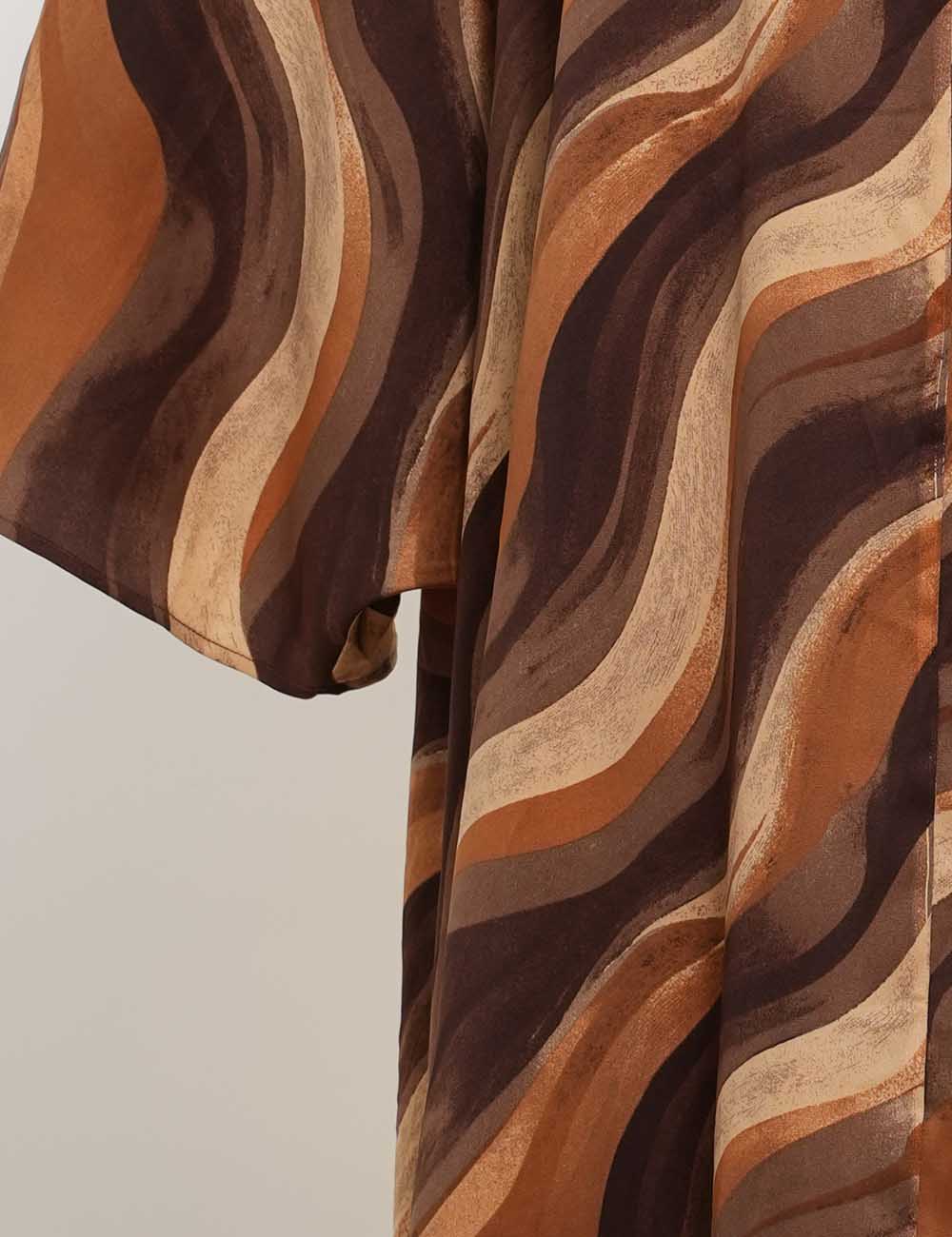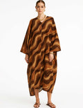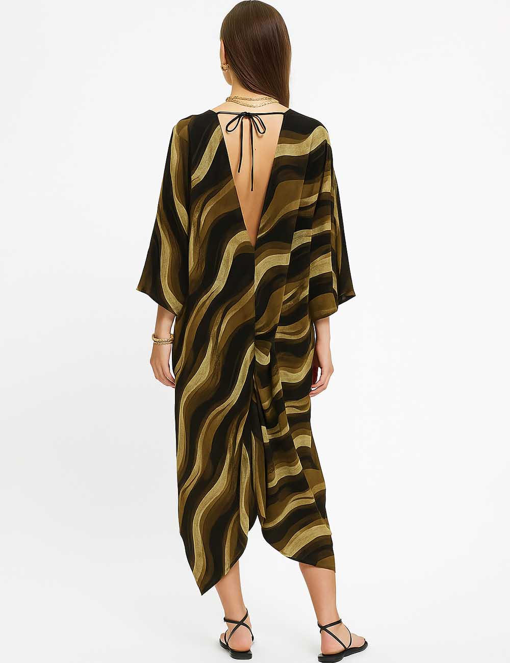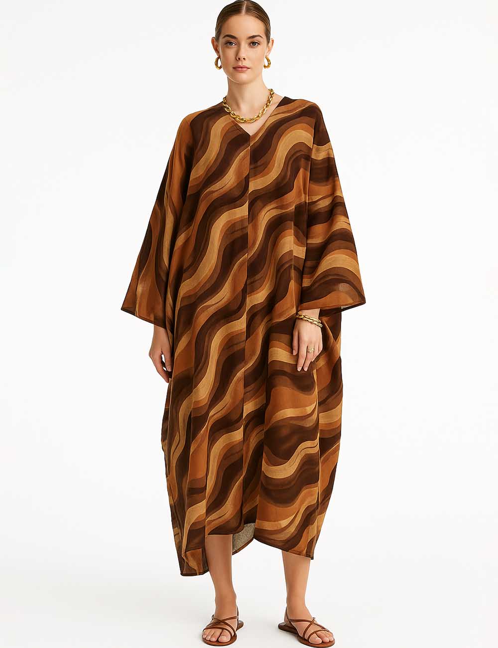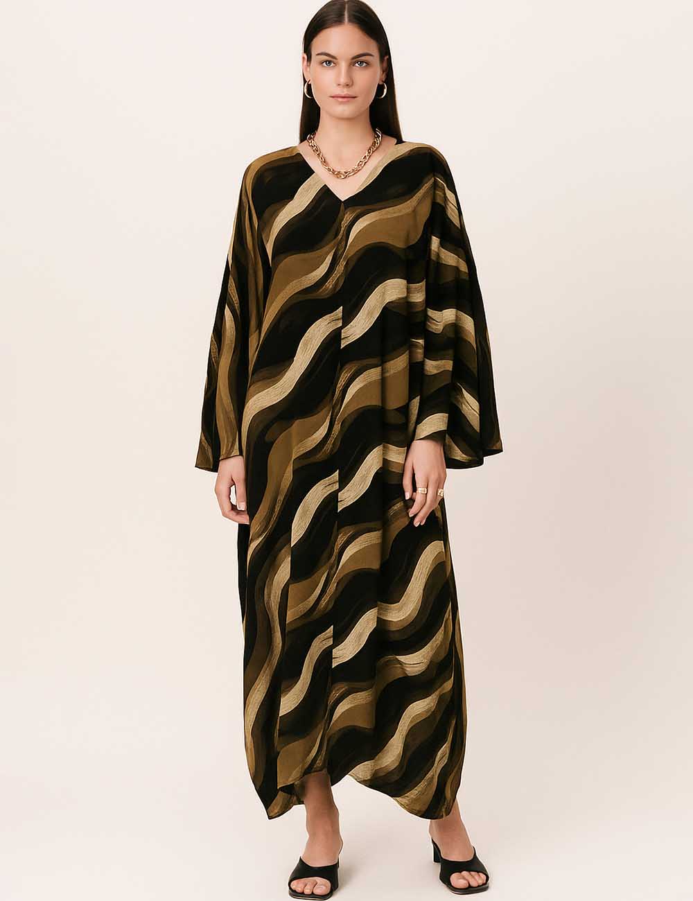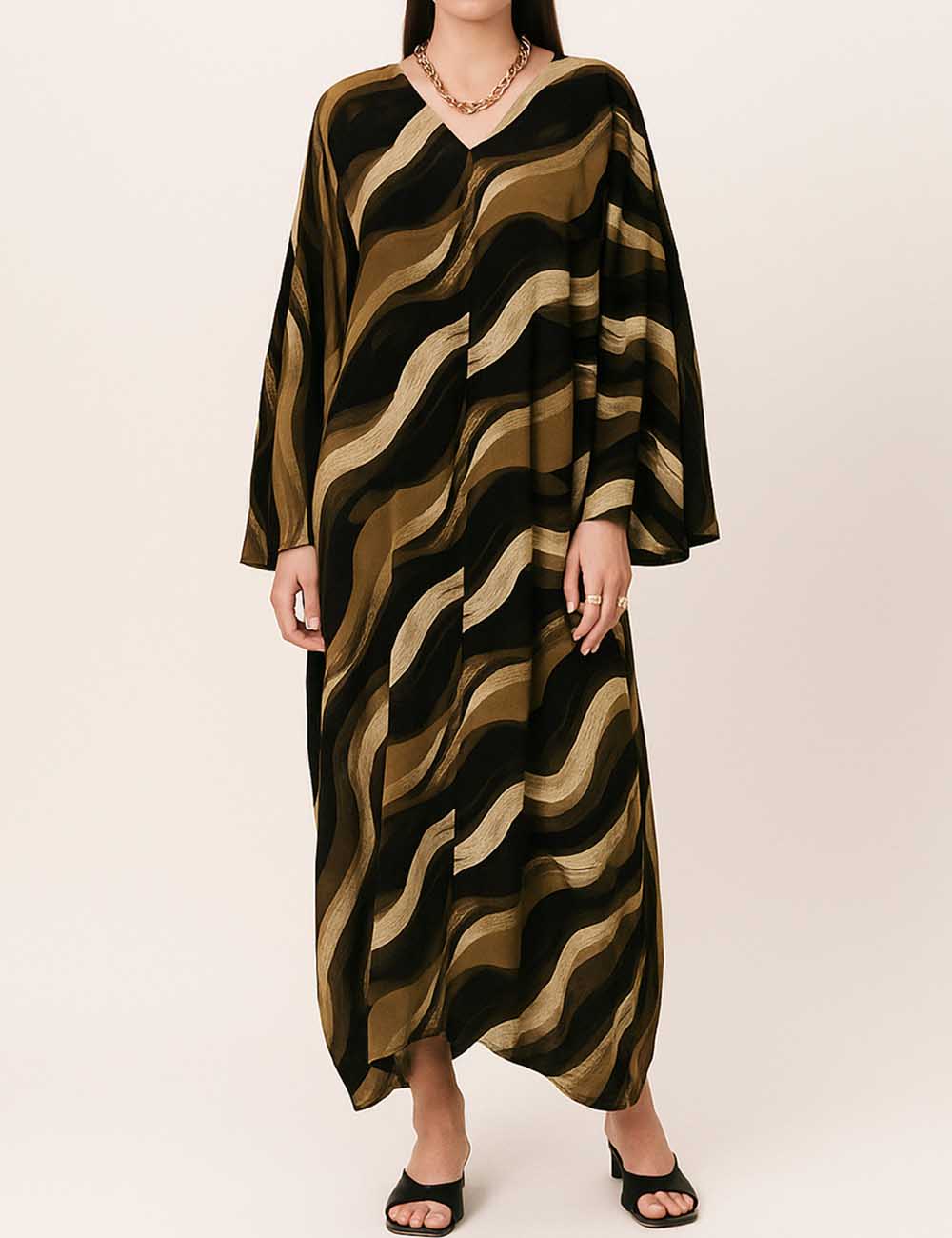 Ladies Wave Print Kaftan Back Deep V Maxi Dress