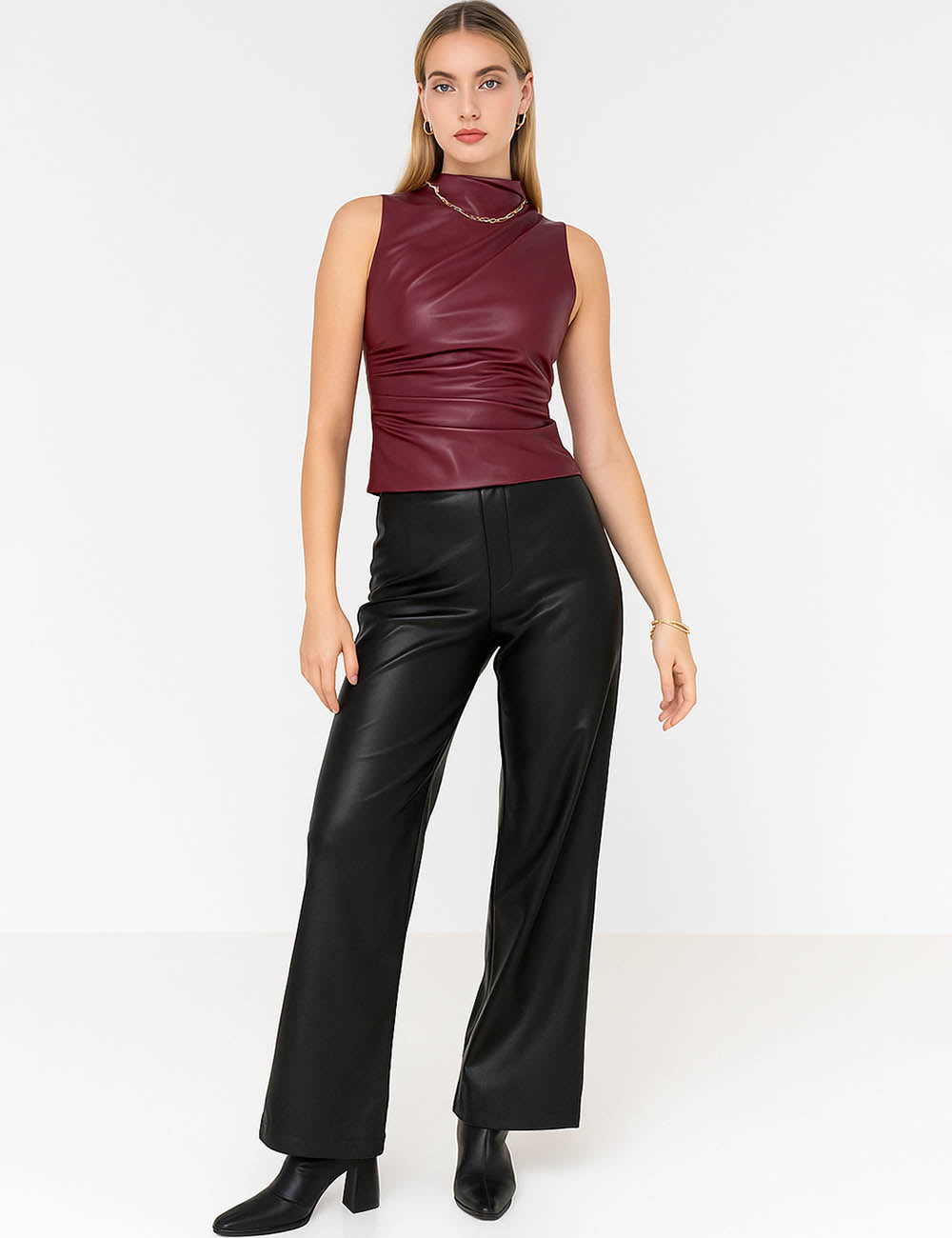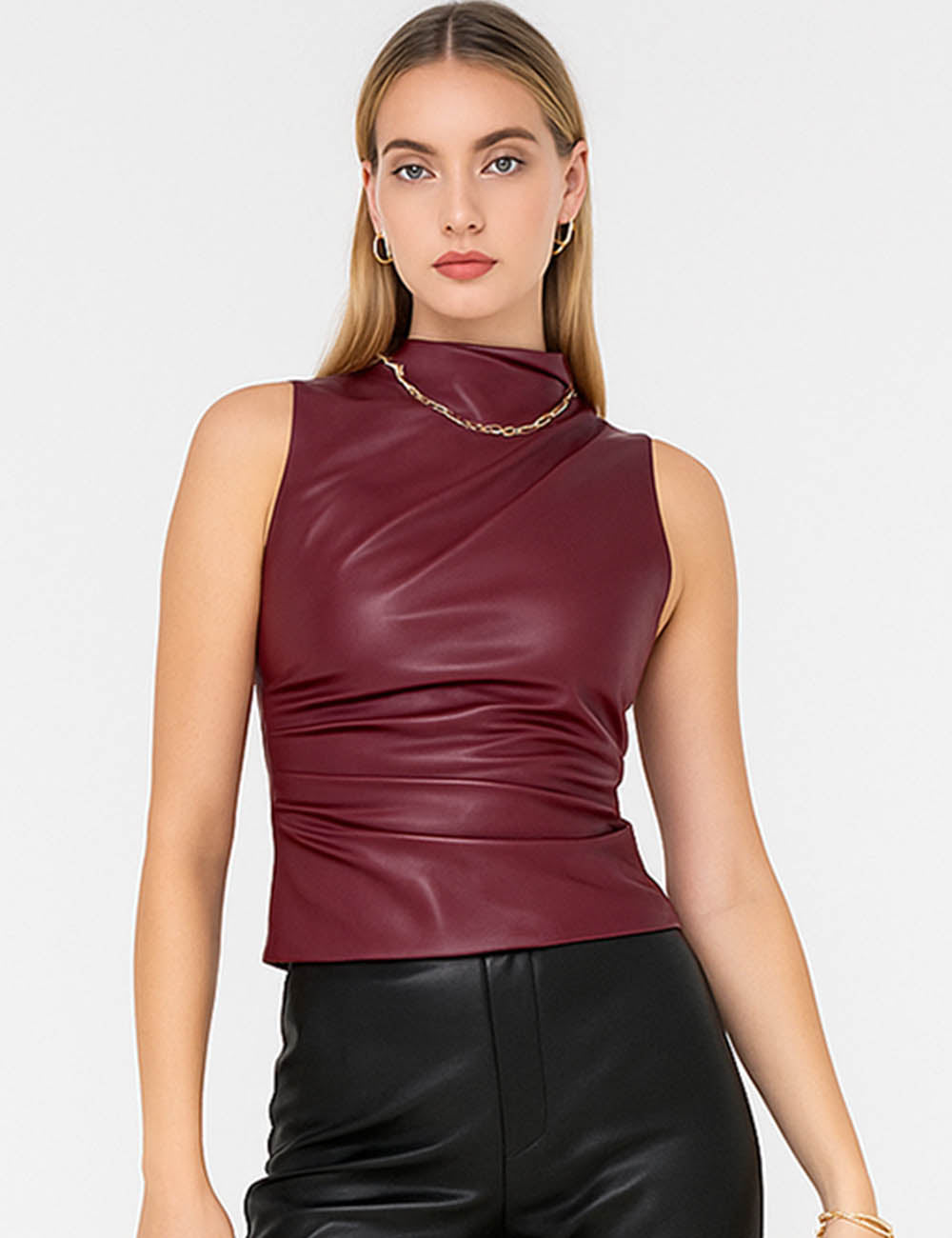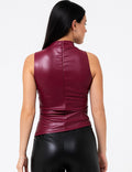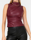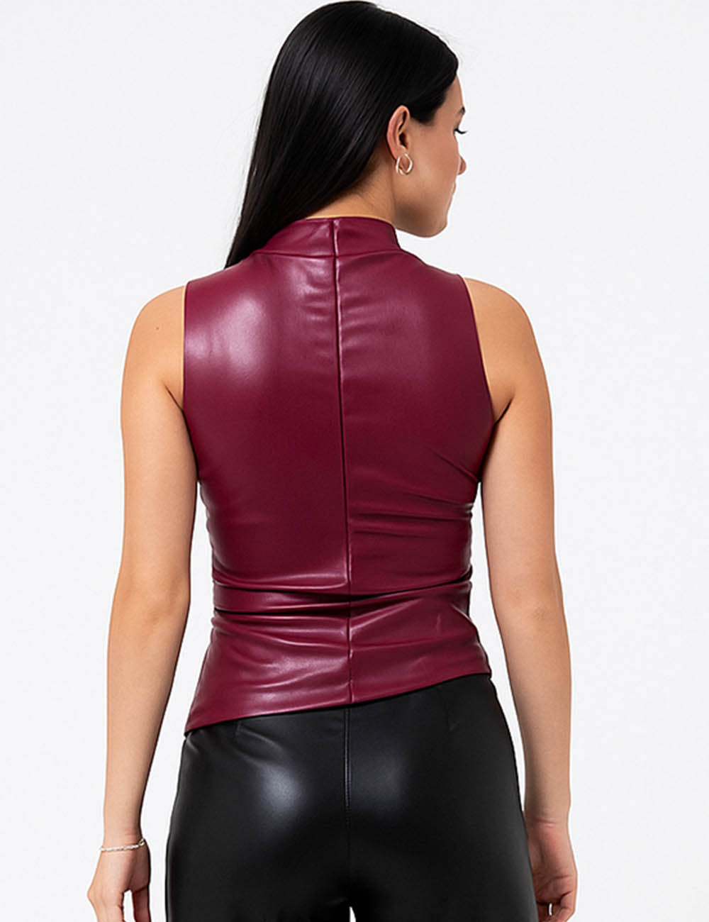 Ladies PU Turtle Neck Sleeveless Inregular Wrinkle Top SKT4951